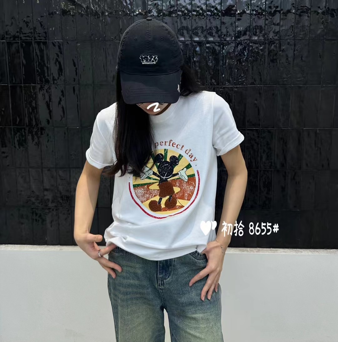 PF214#米奇卡通毛巾绣短袖t恤女2024新款春夏宽松打底衫内搭上衣