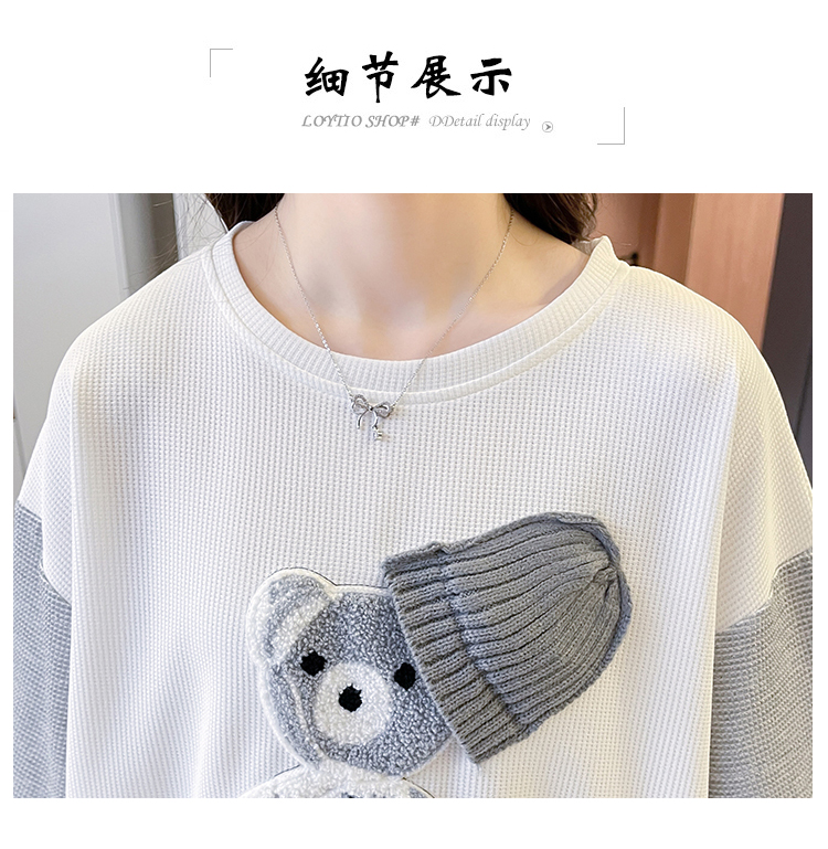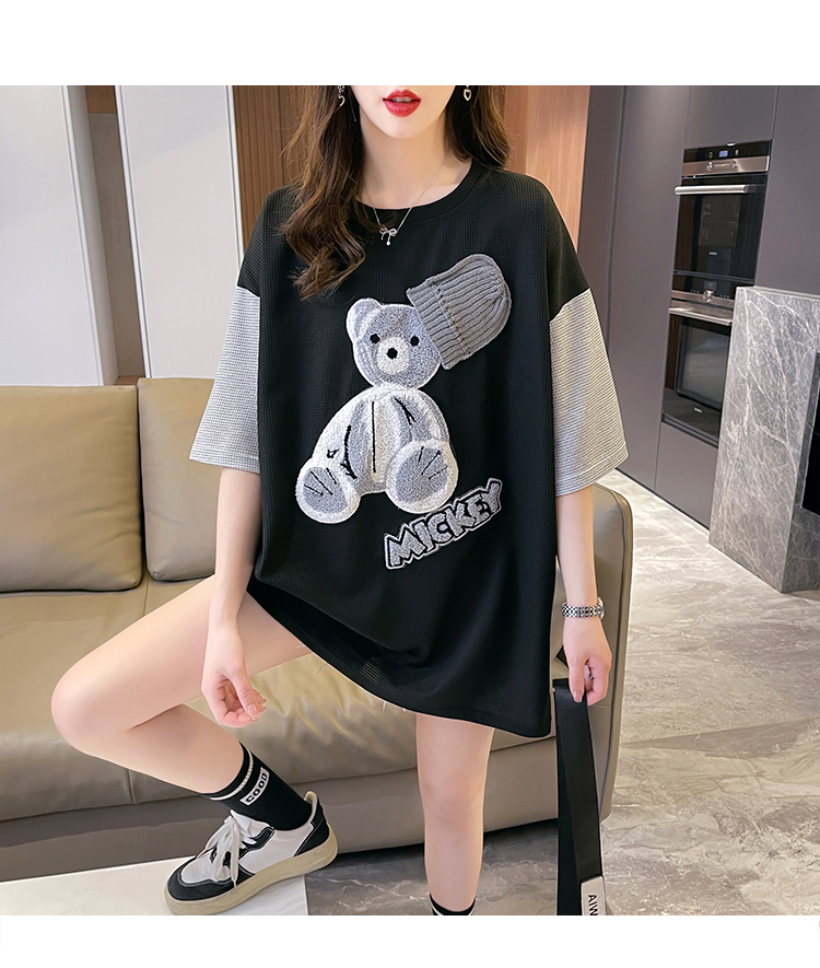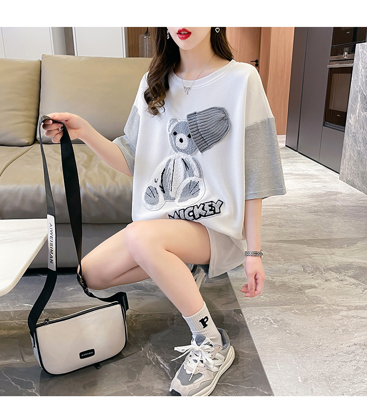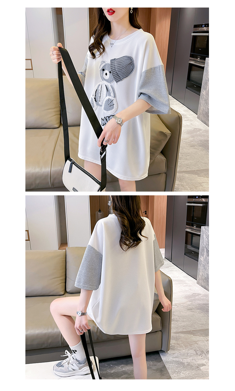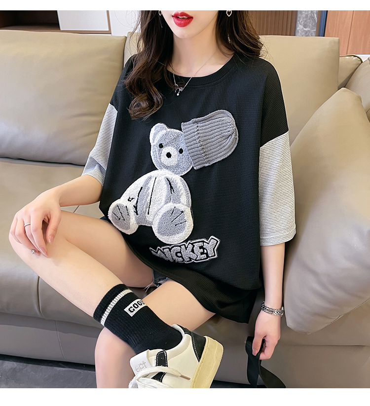PF258#华夫格后包领韩版小熊绣花短袖T恤女上衣中长款