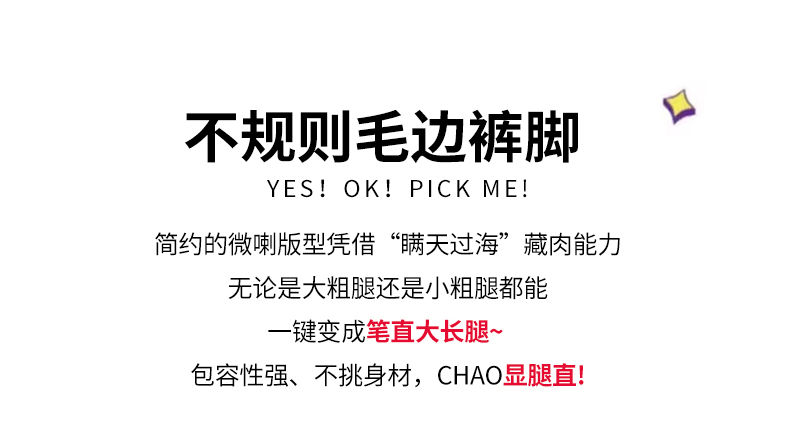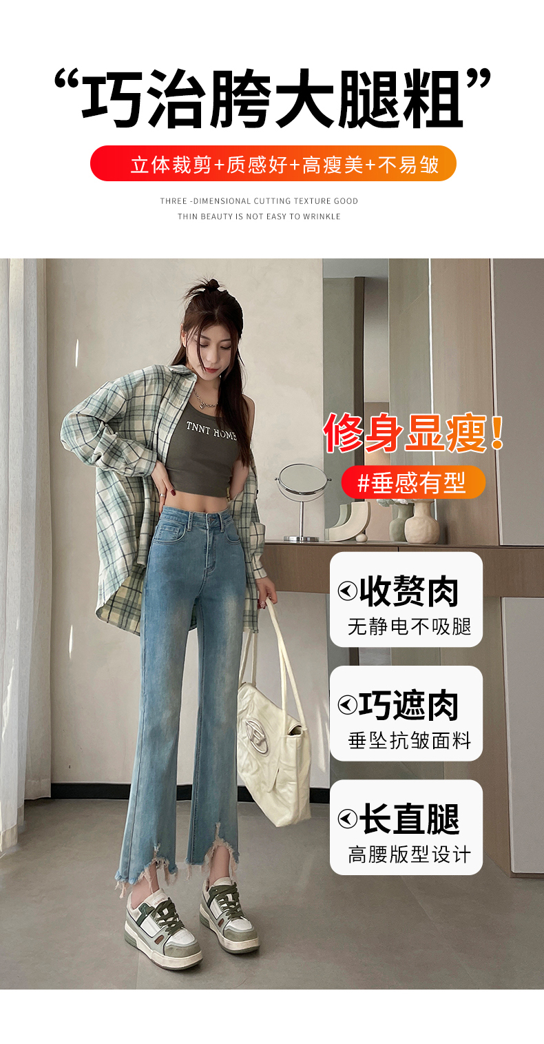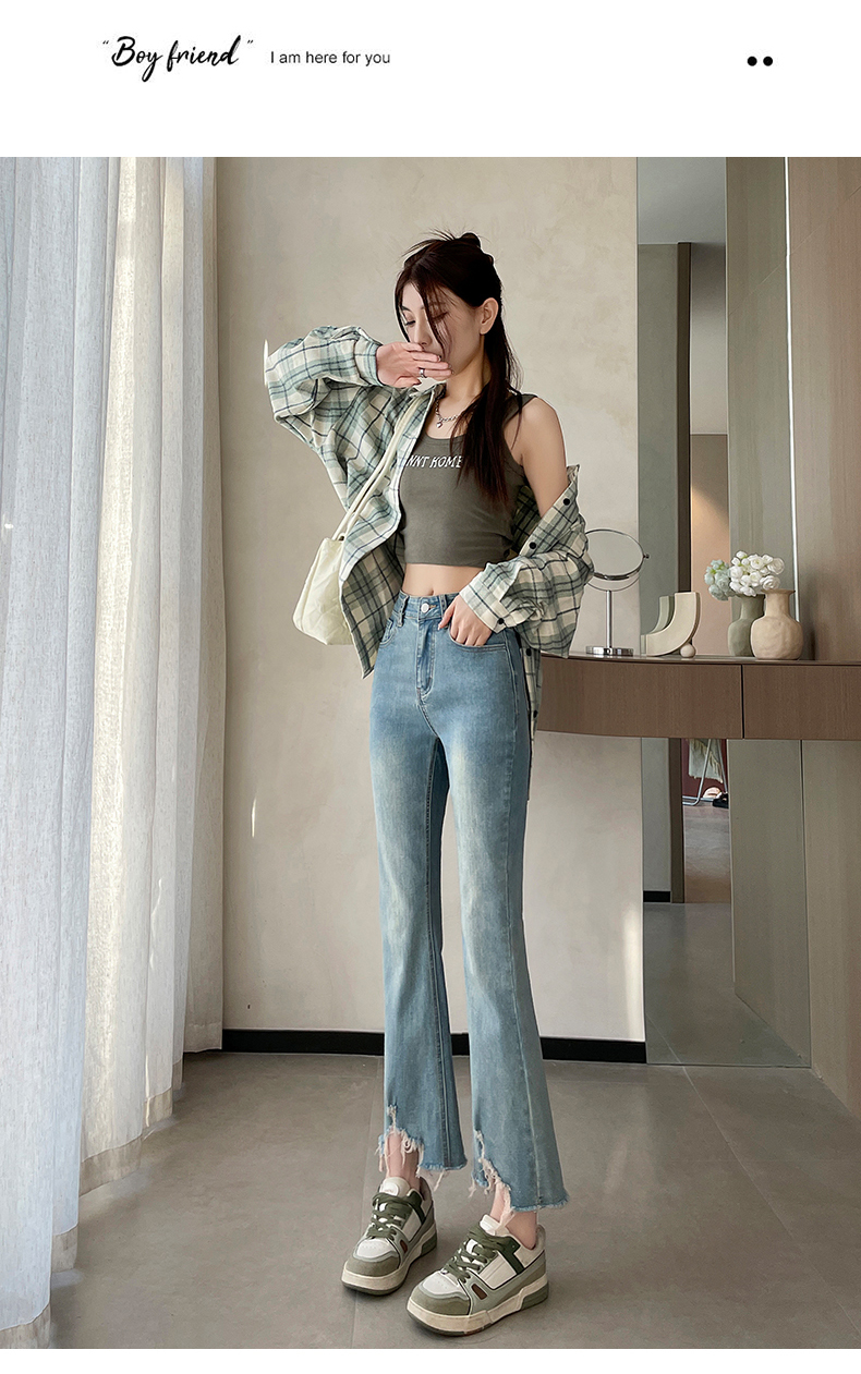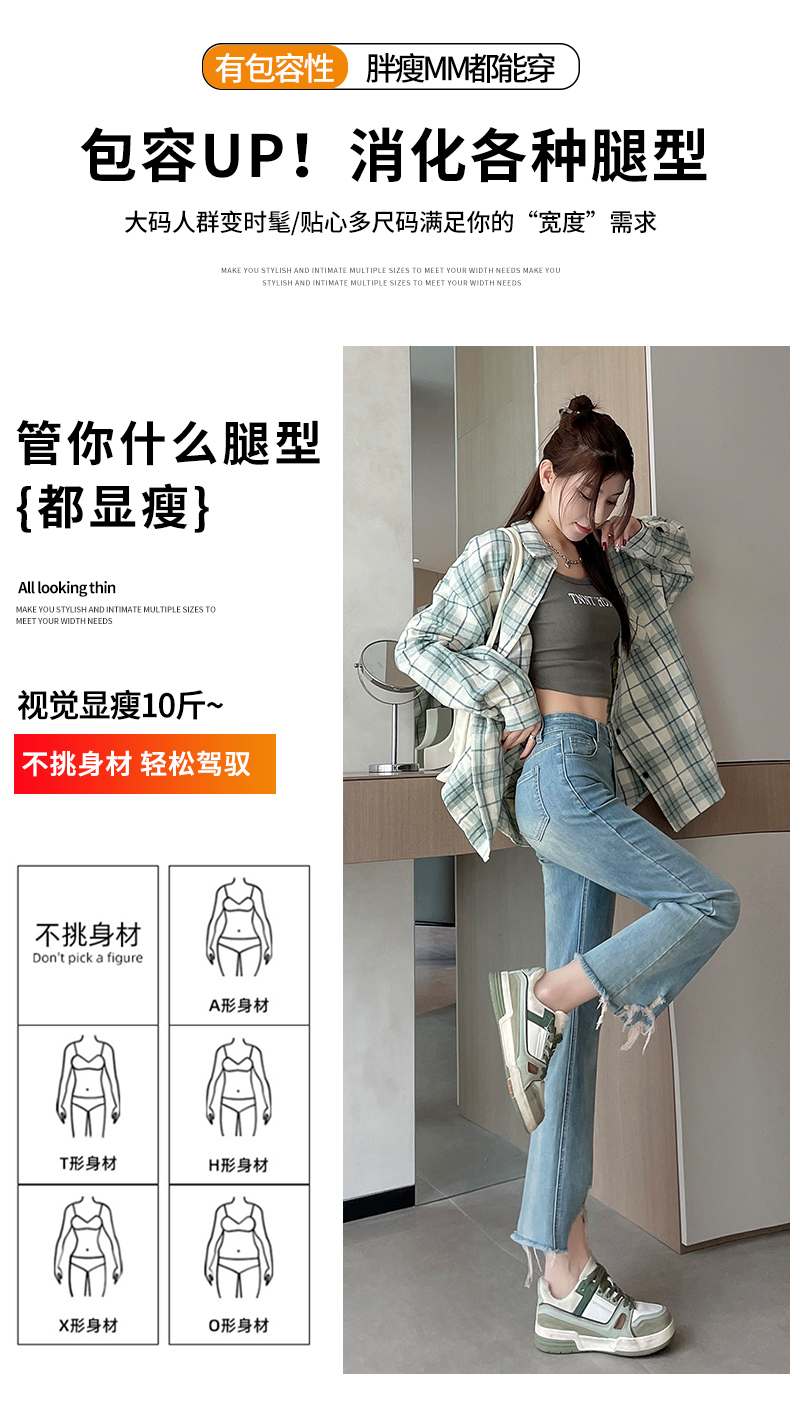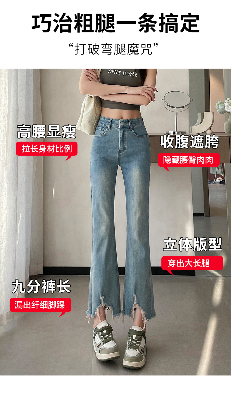 PF285#复古破洞微喇牛仔裤女 新款高腰显瘦小个子八九分喇叭裤