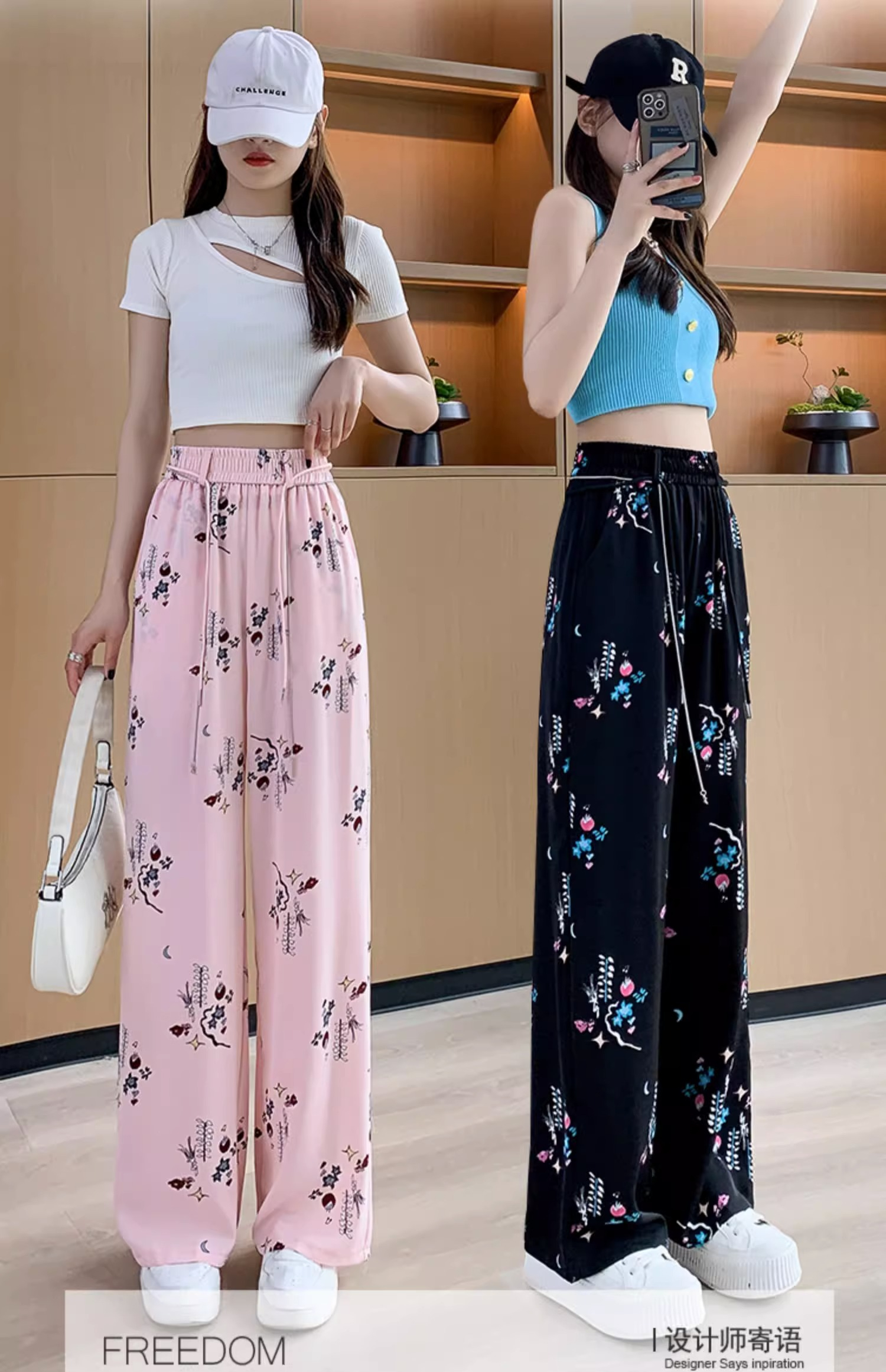 PF343#原版做工 夏装新款女士时尚显瘦阔腿休闲裤高腰印花裤子