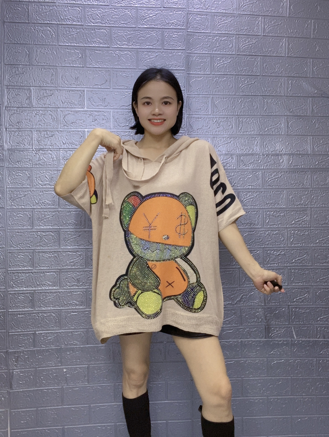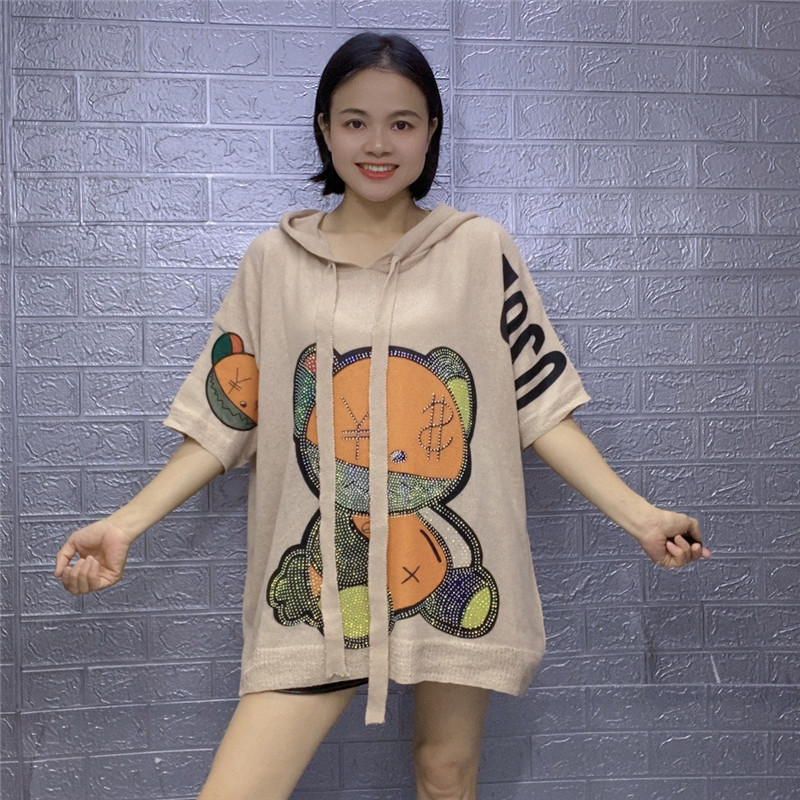 PF375#财迷熊针织连帽短袖t恤 新品宽松大码重工烫钻ins上衣潮