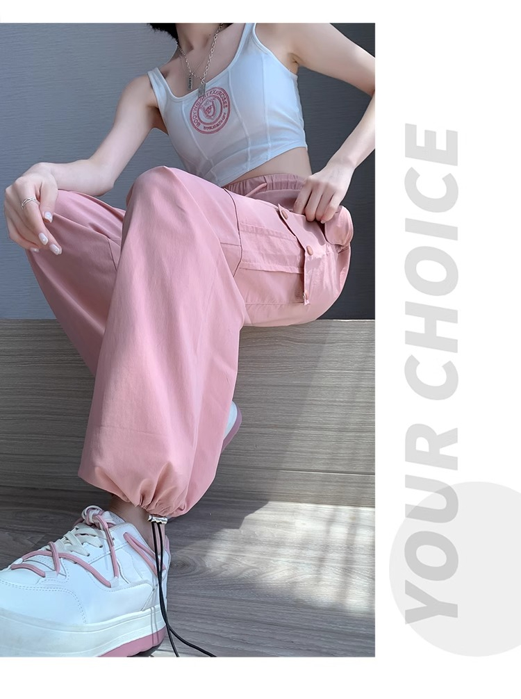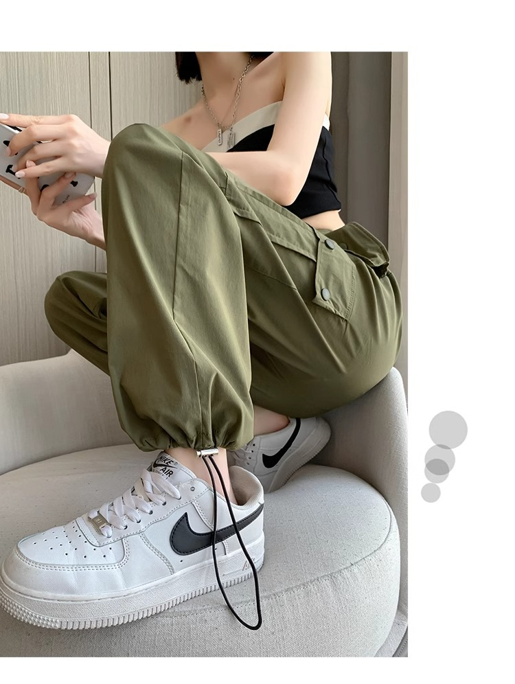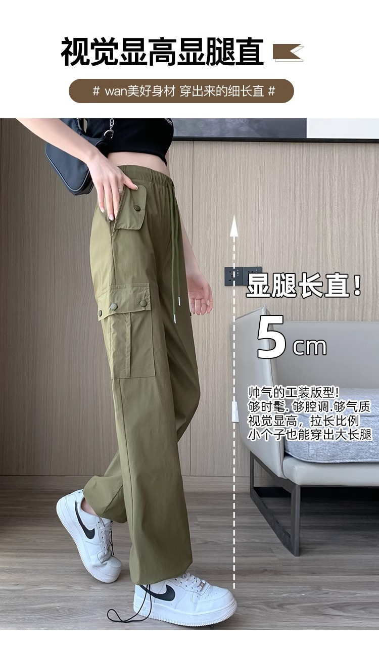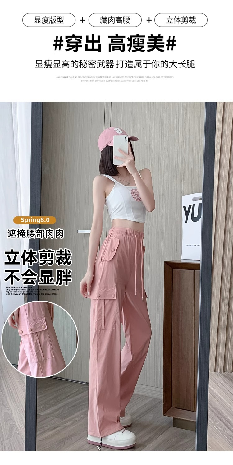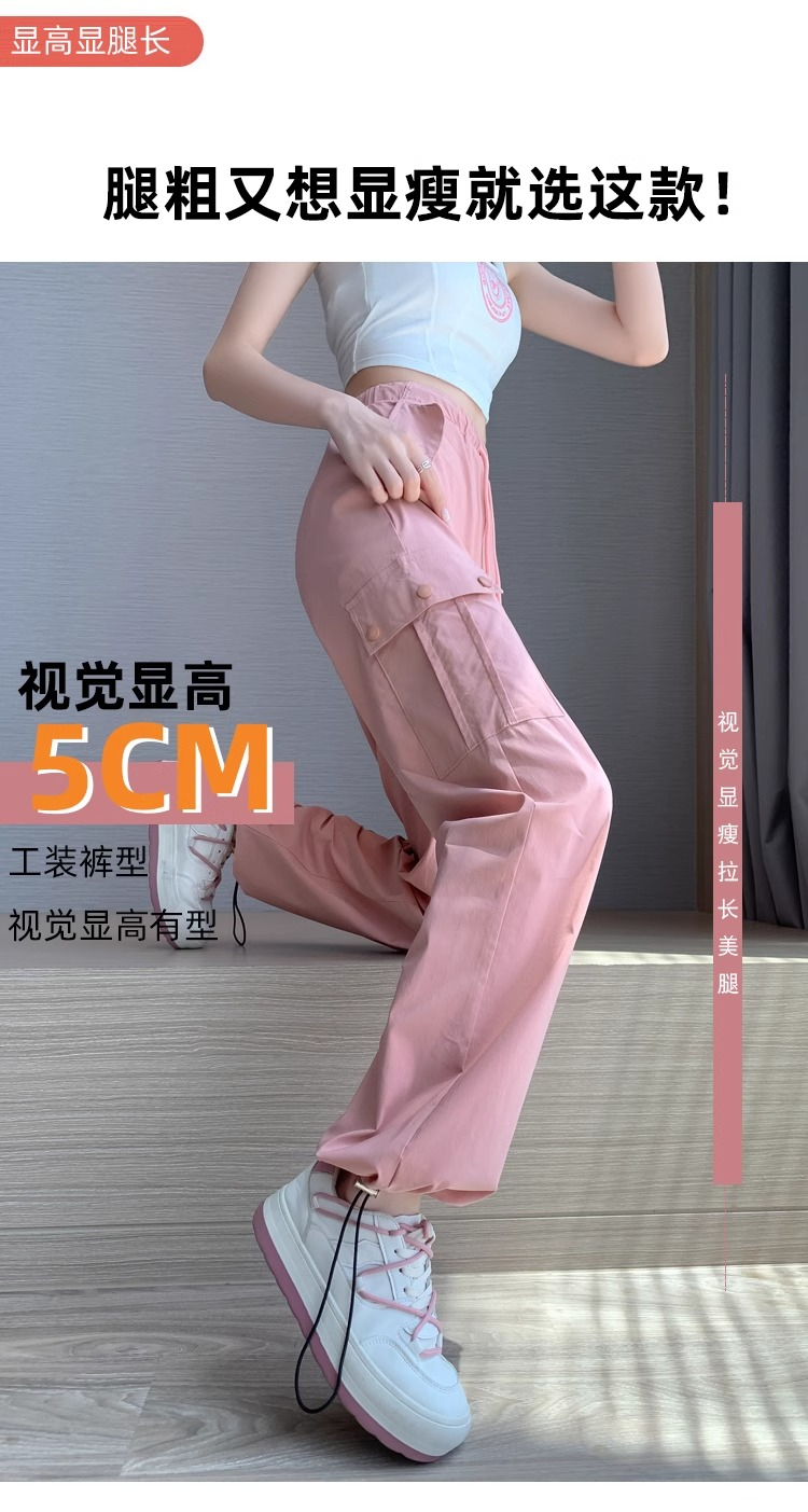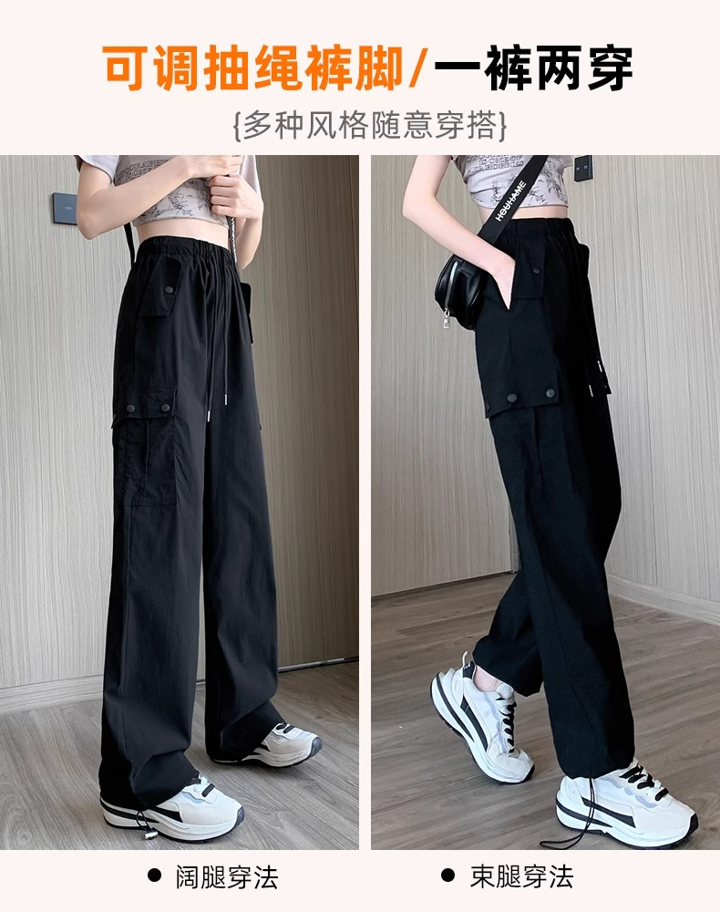 PF383#黑色速干工装裤女夏季薄款小个子抽绳束脚直筒宽松休闲运动裤