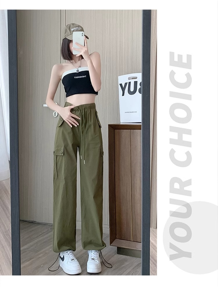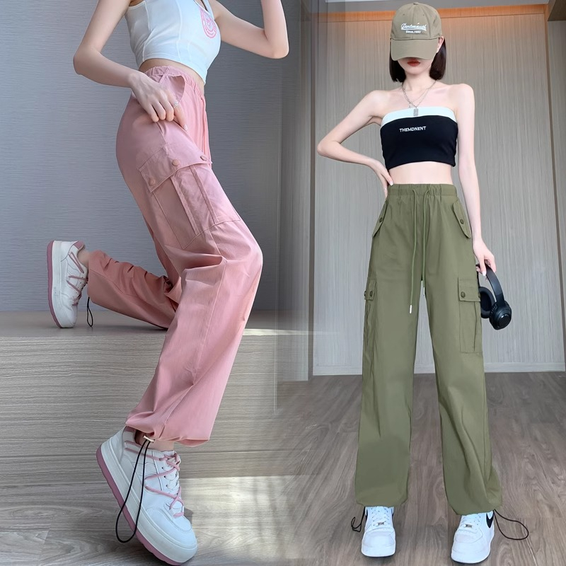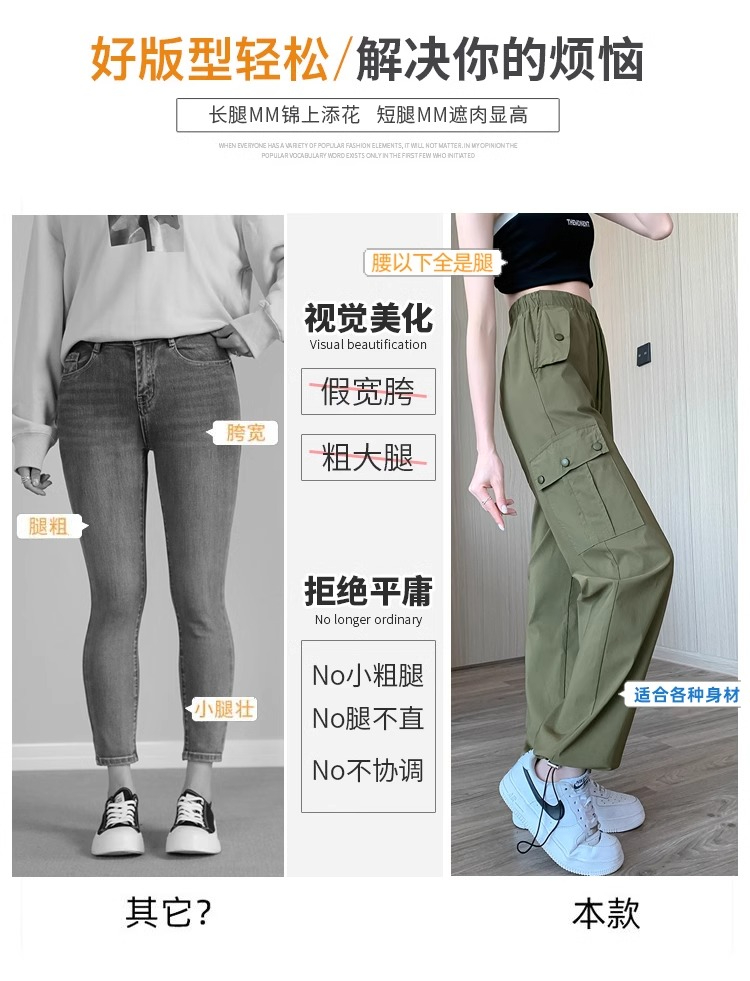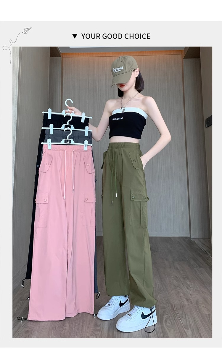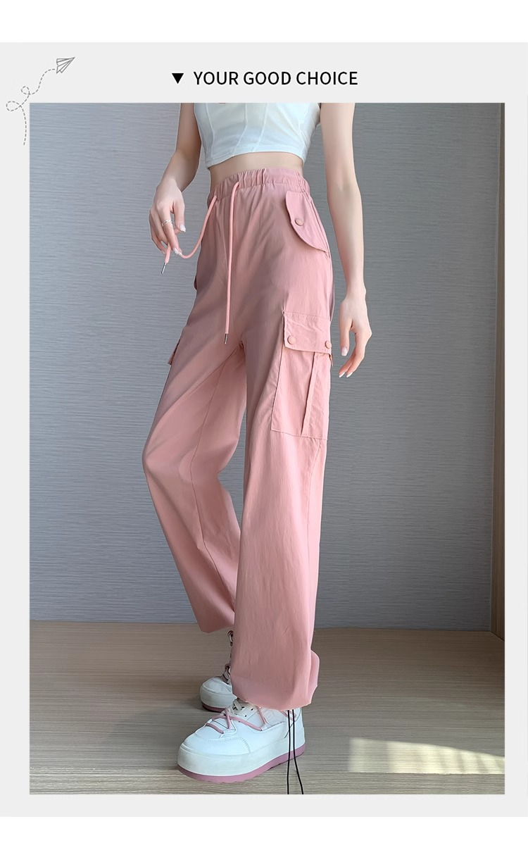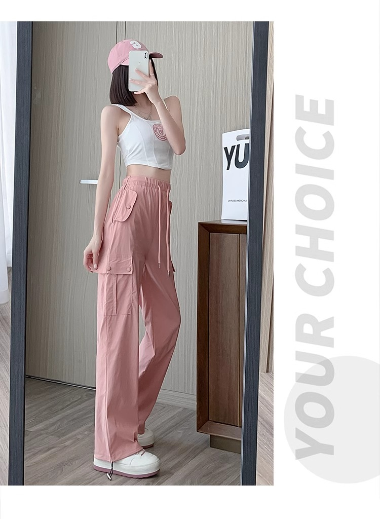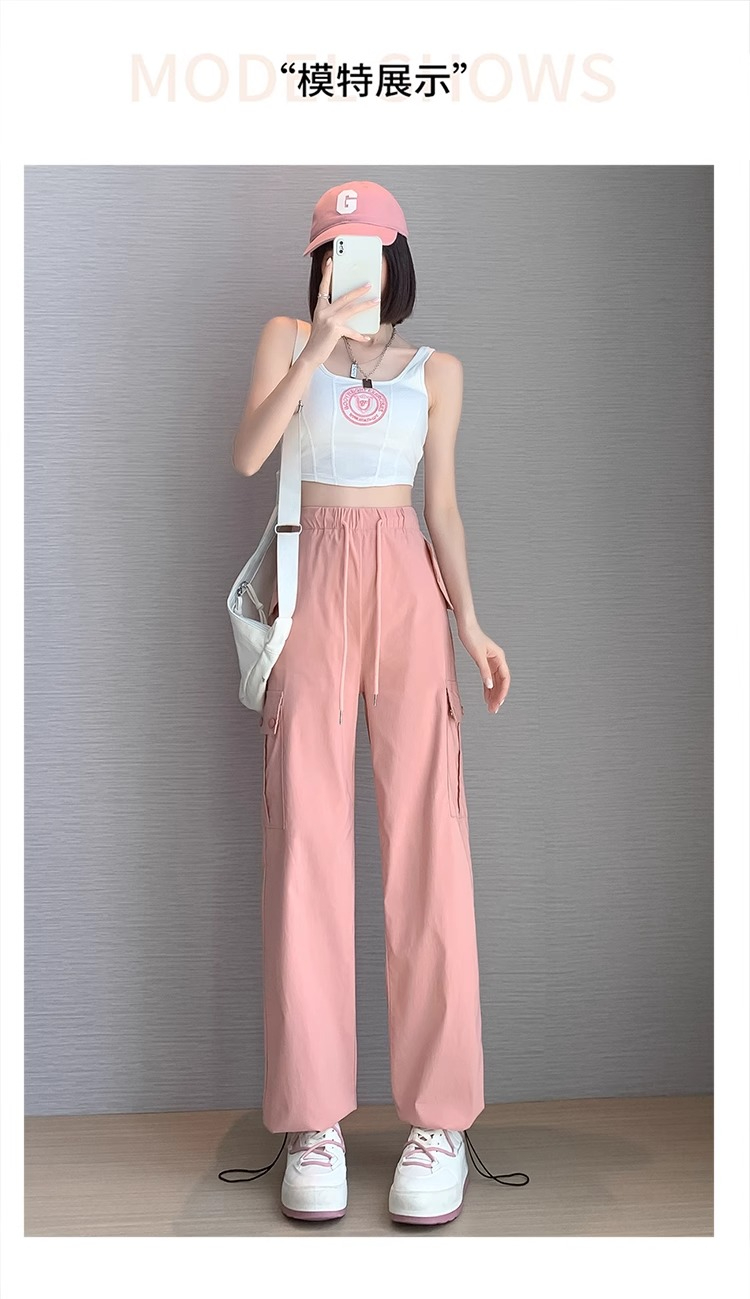 PF383#黑色速干工装裤女夏季薄款小个子抽绳束脚直筒宽松休闲运动裤
