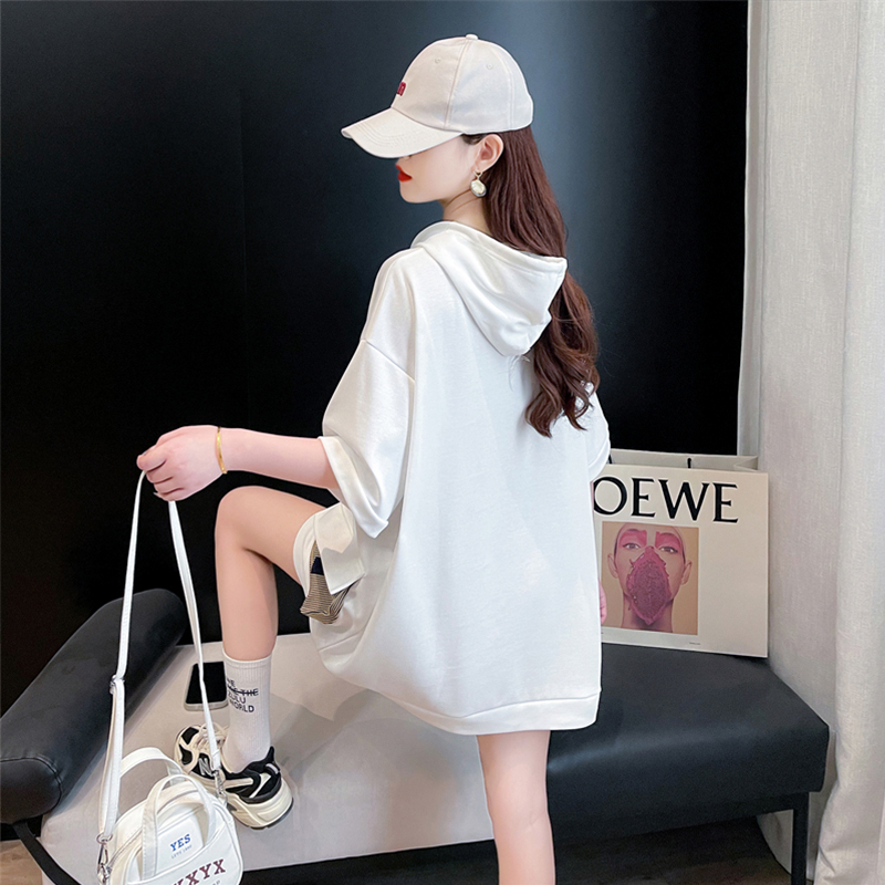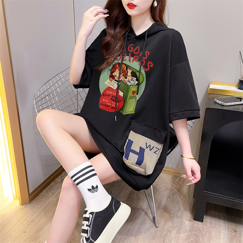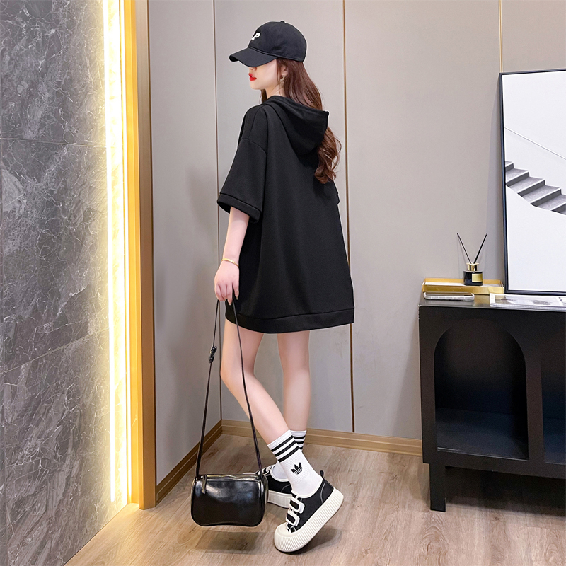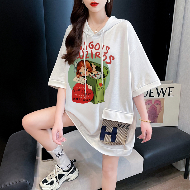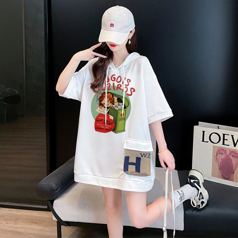 PF395#纯棉|抖音质量 连帽短袖t恤女中长款夏季宽松大码上衣
