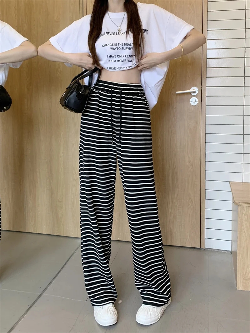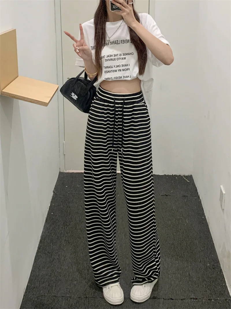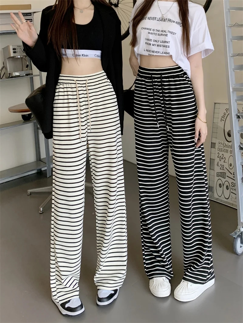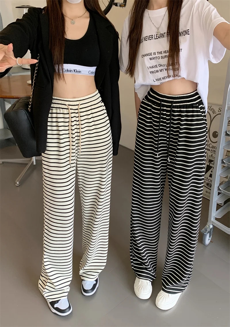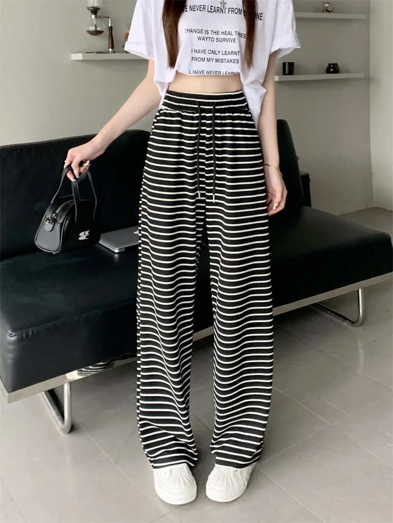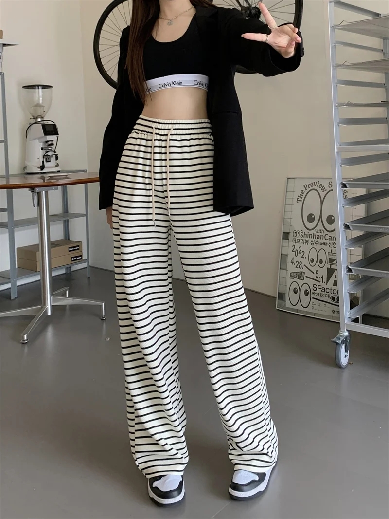 PF459#条纹垂感休闲裤女夏季新款高腰宽松直筒休闲阔腿裤