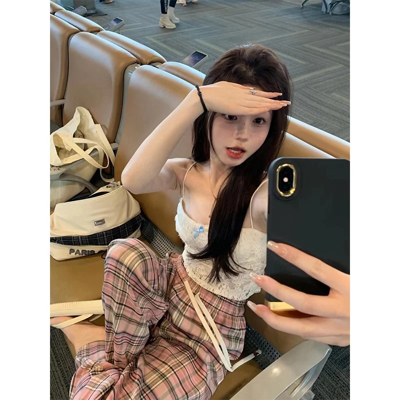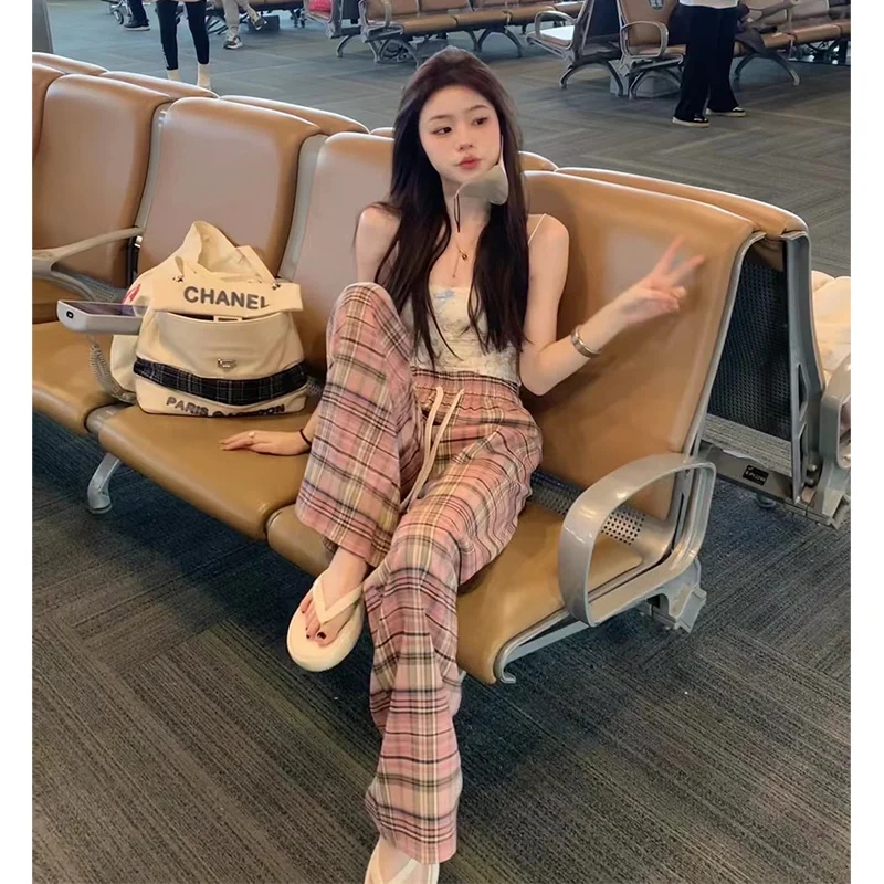PF461#格子直筒休闲裤子女夏季韩版高腰显瘦慵懒风阔腿裤