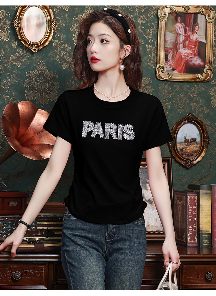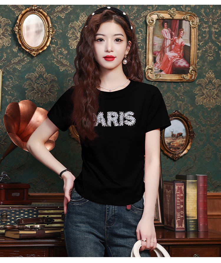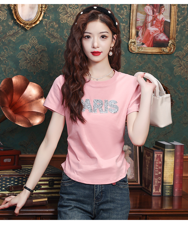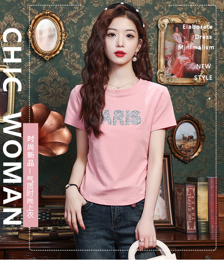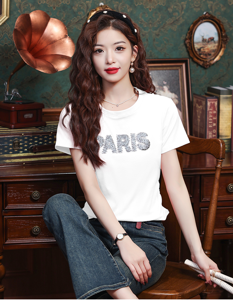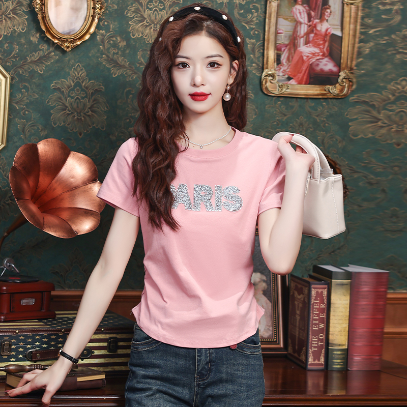 PF539#欧货T恤女短袖2024夏季百搭镶钻字母紧身又甜小众短袖上衣ing
