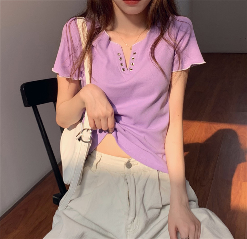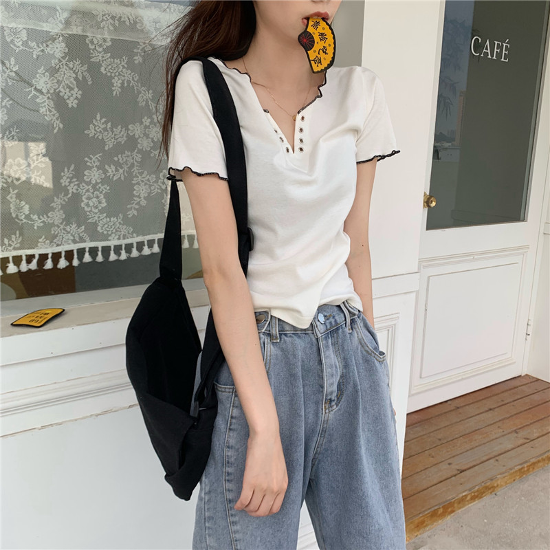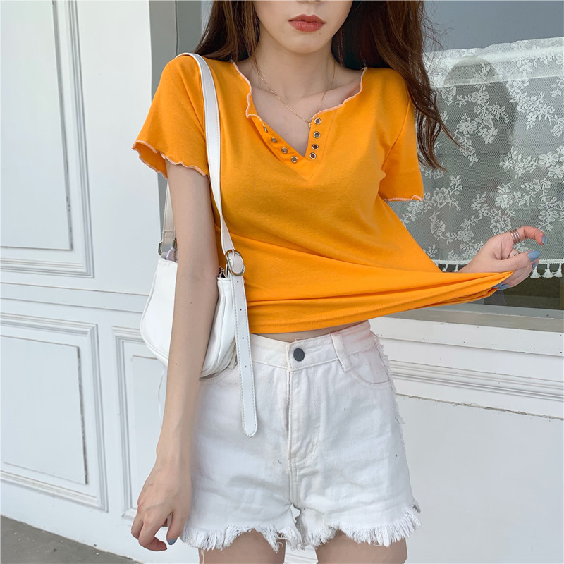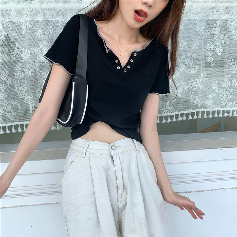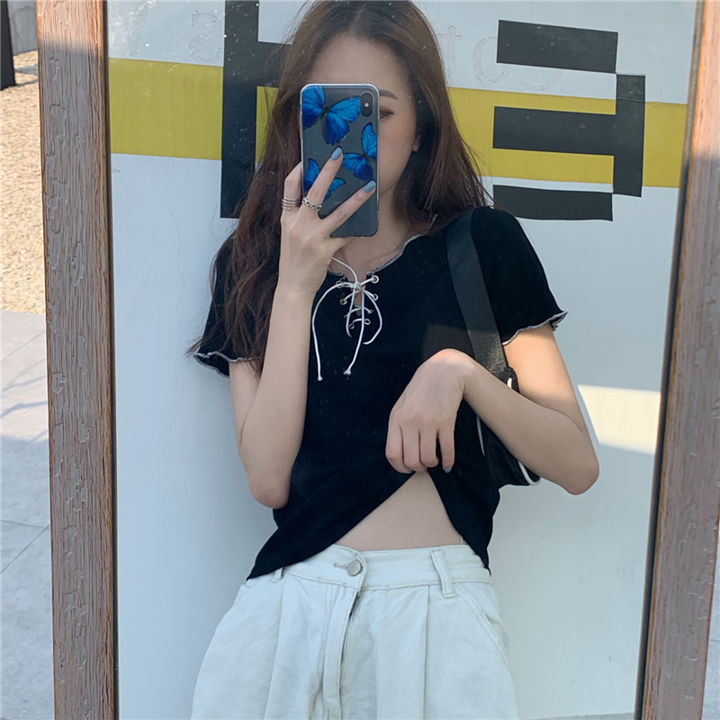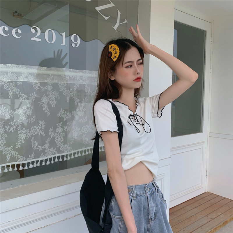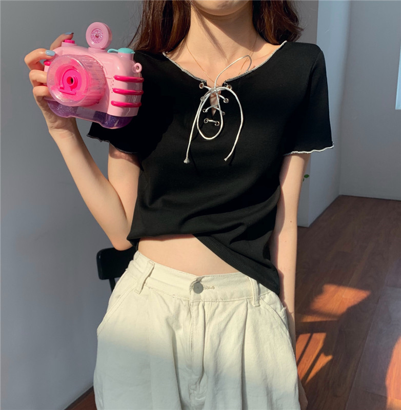 PF584#新款夏装短袖设计感V领性感绑带修身显瘦t恤女网红ins潮上衣
