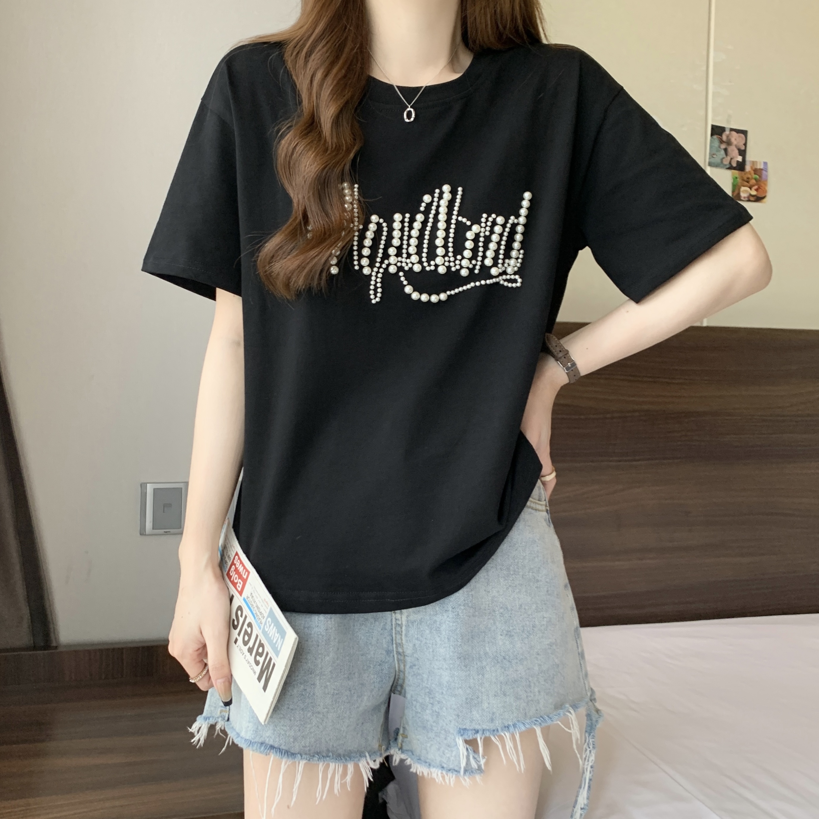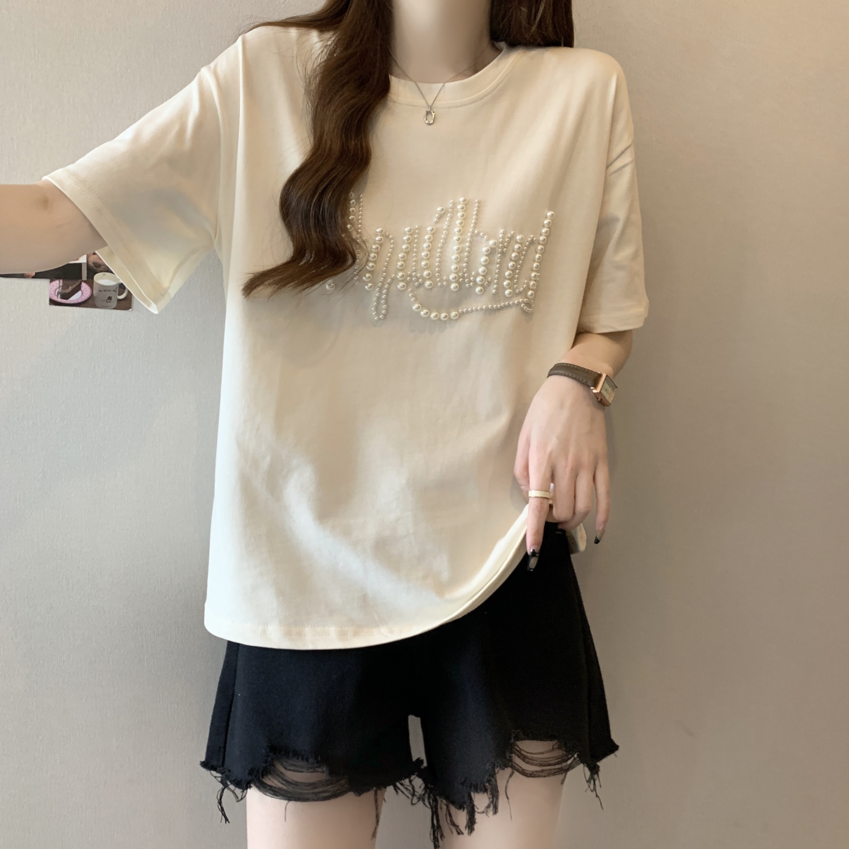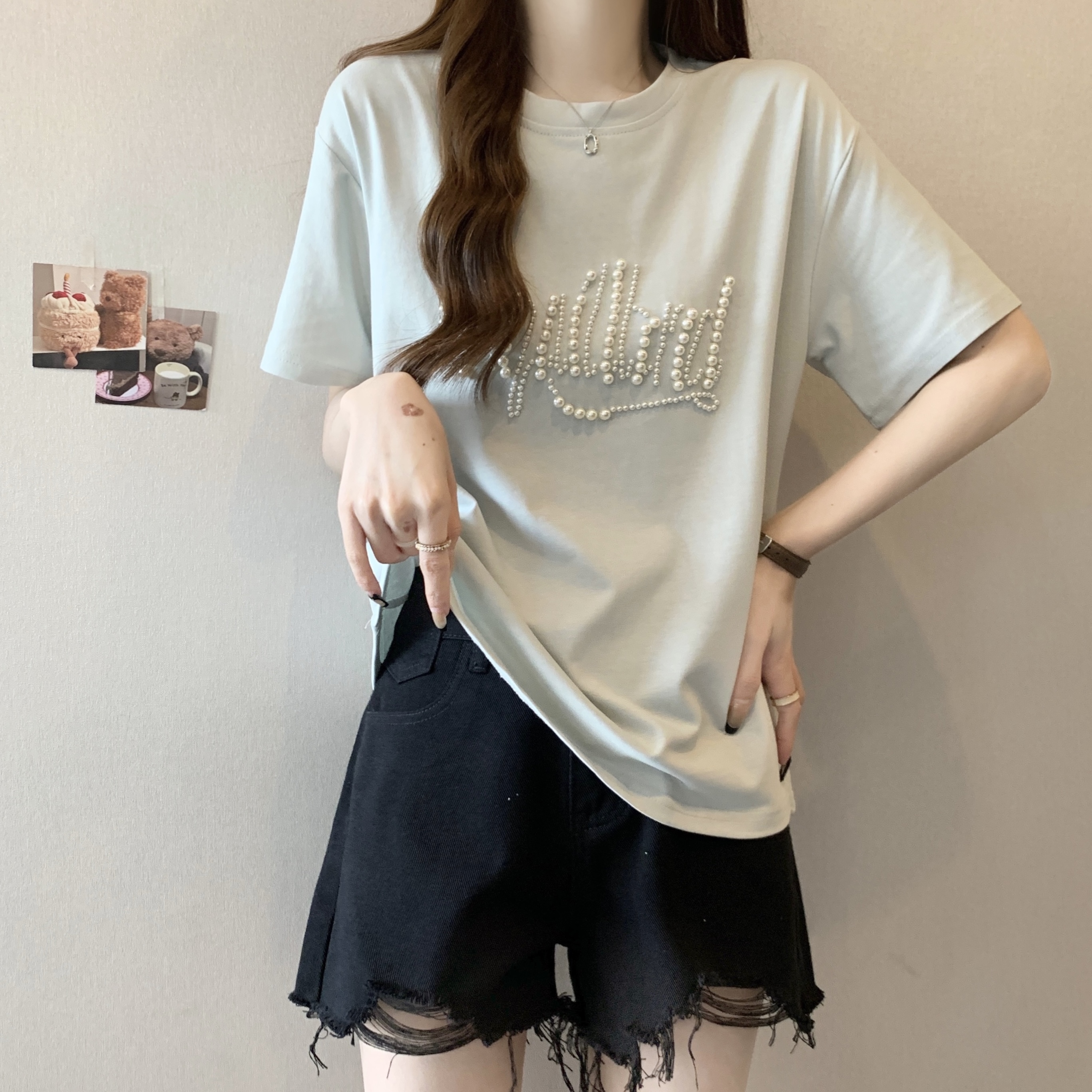 PF625#大码胖MM短袖T女夏 重工钉珠设计感宽松百搭洋气上衣