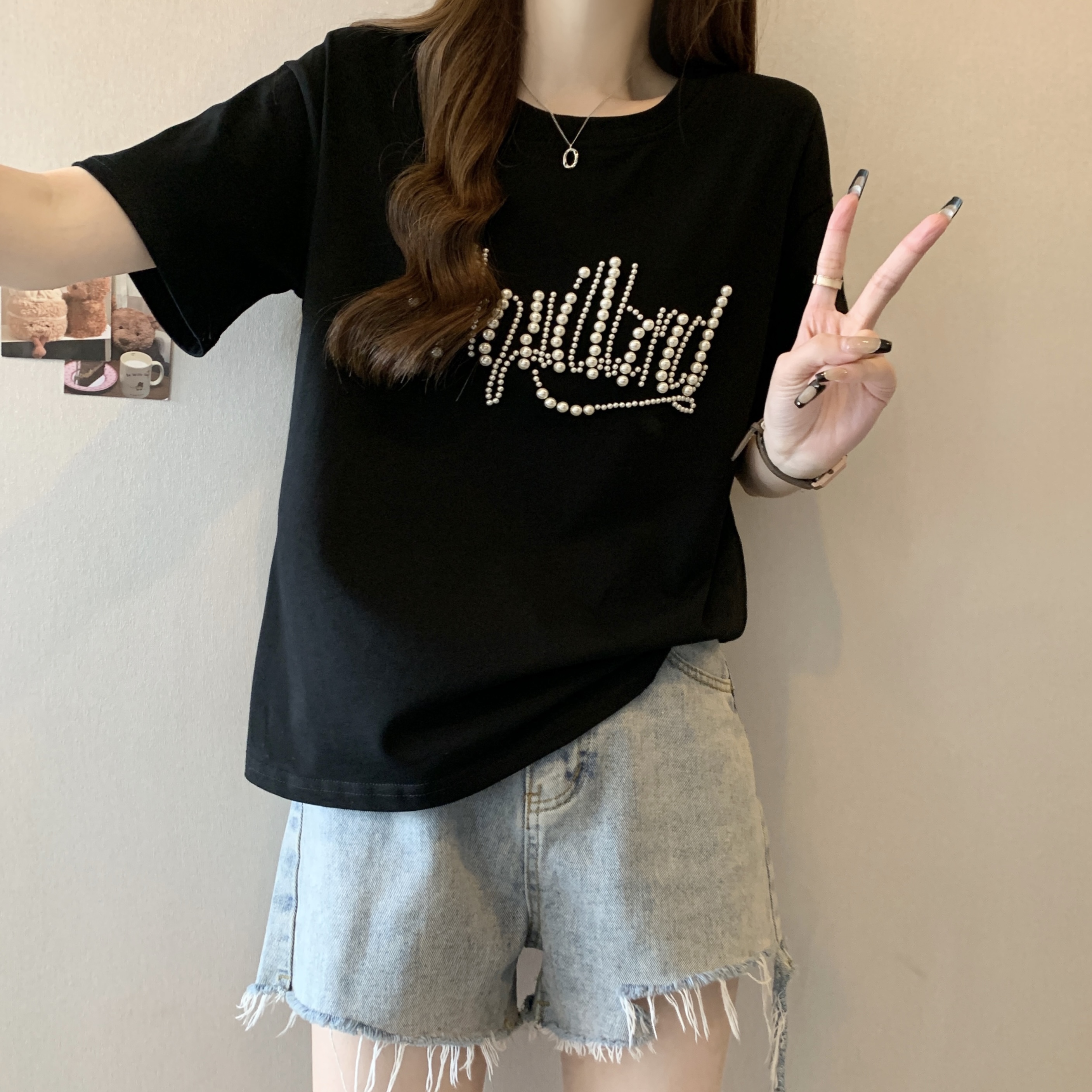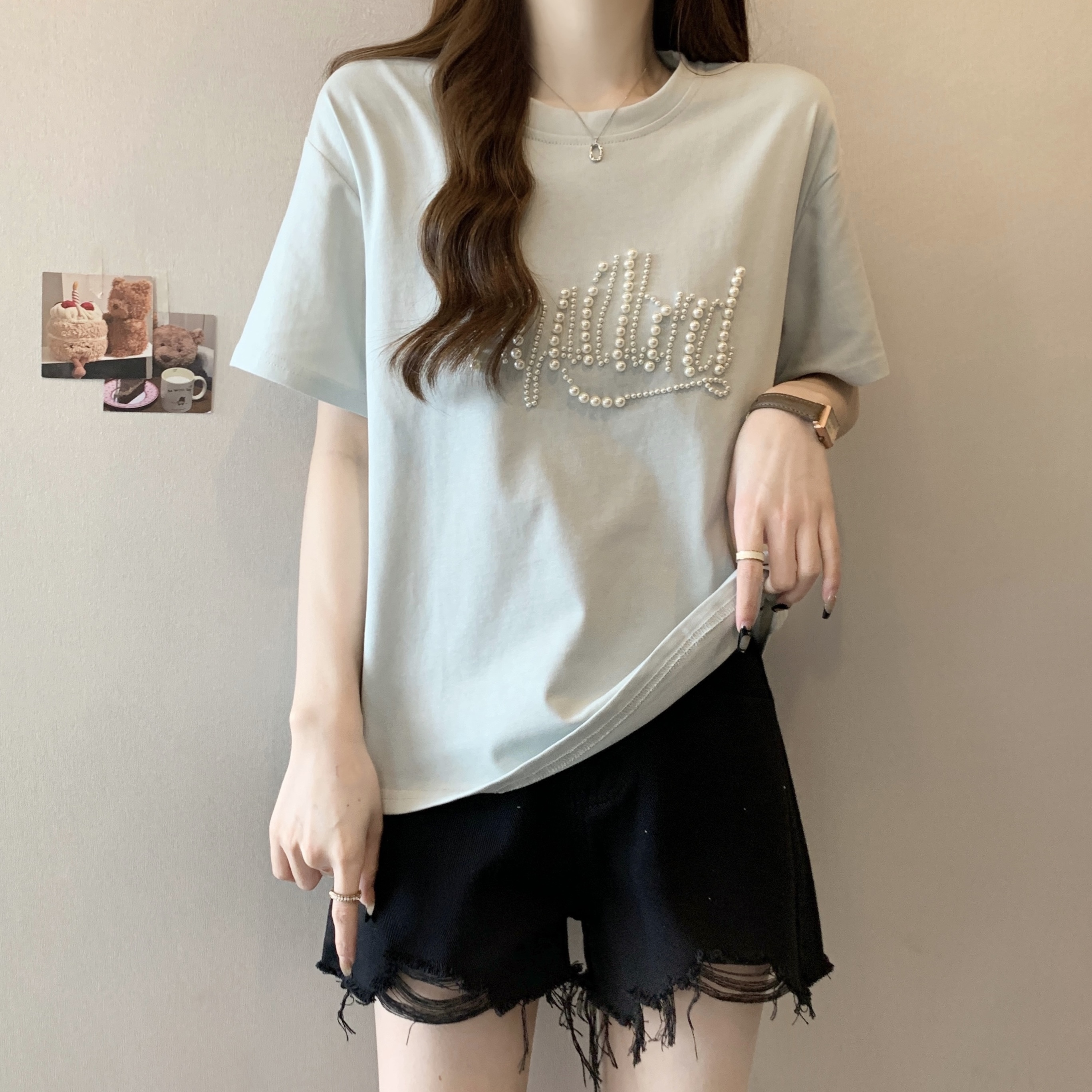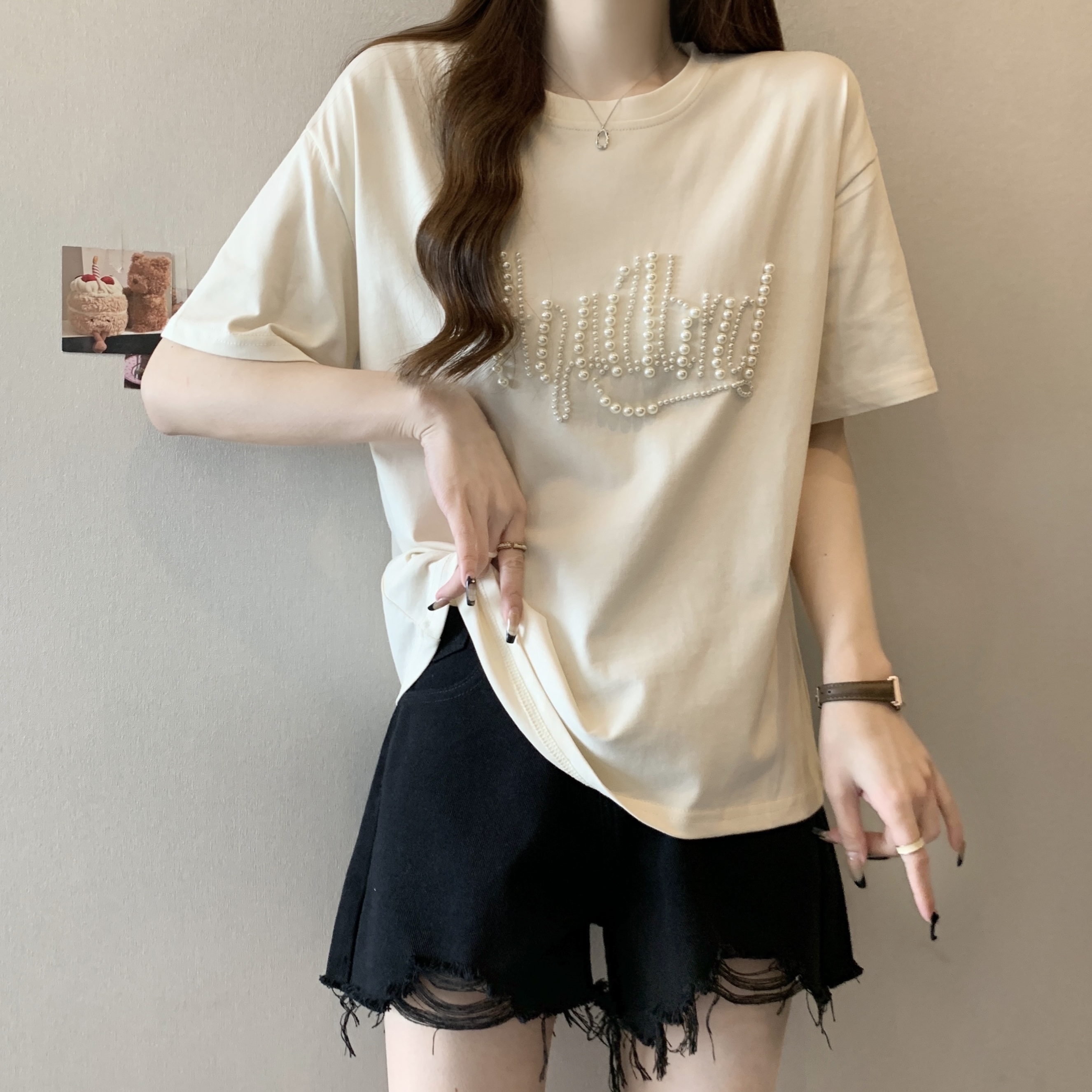 PF625#大码胖MM短袖T女夏 重工钉珠设计感宽松百搭洋气上衣