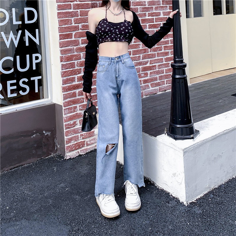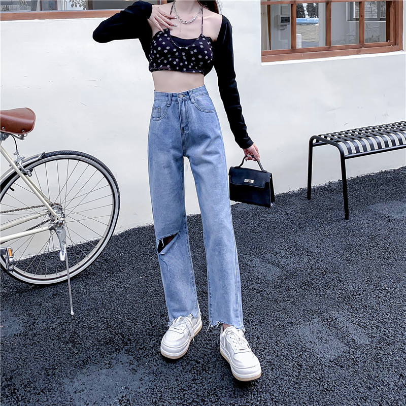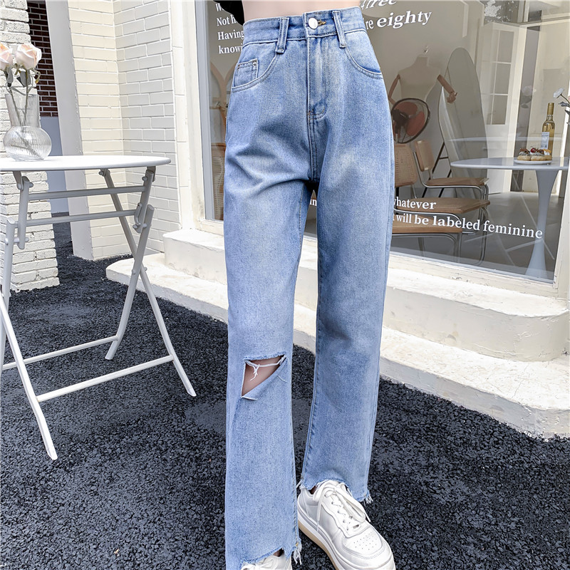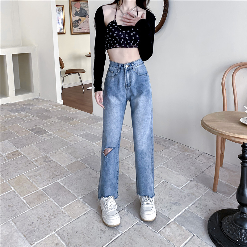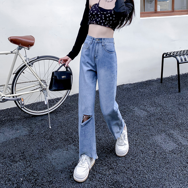 PF680#大码胖妹妹mm破洞牛仔裤女春秋显瘦宽松直筒高腰阔腿九分裤
