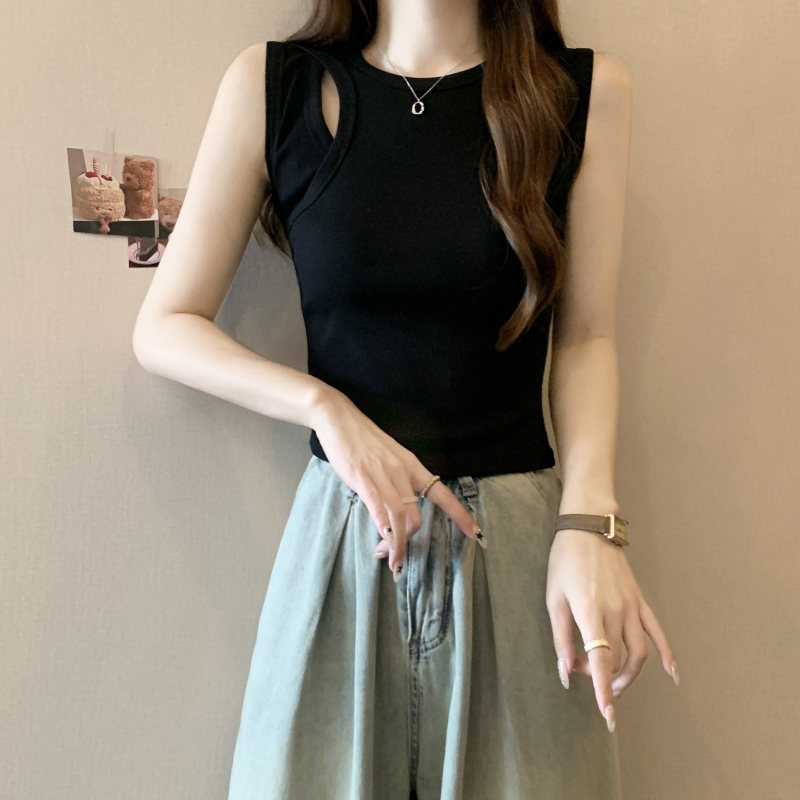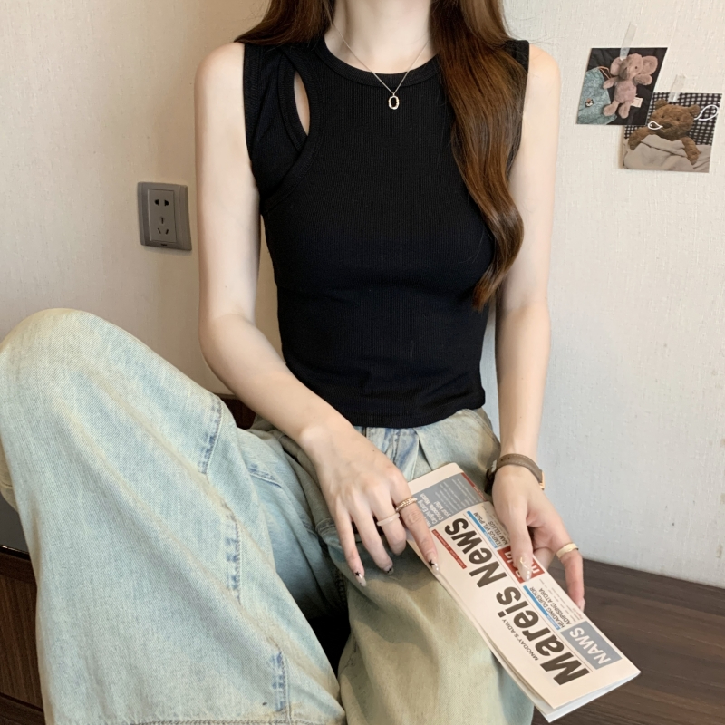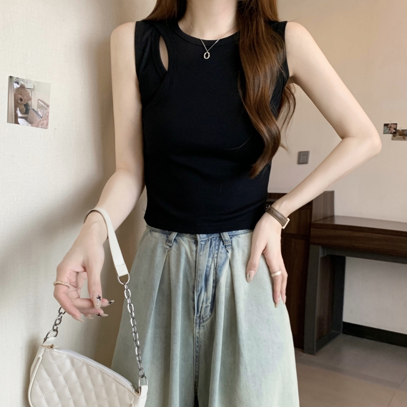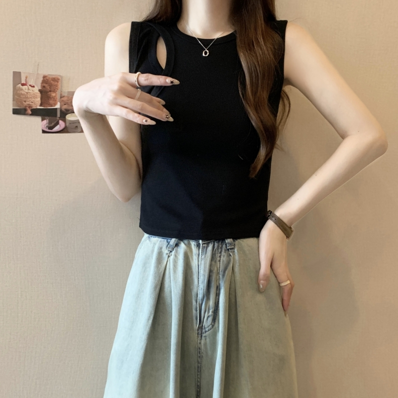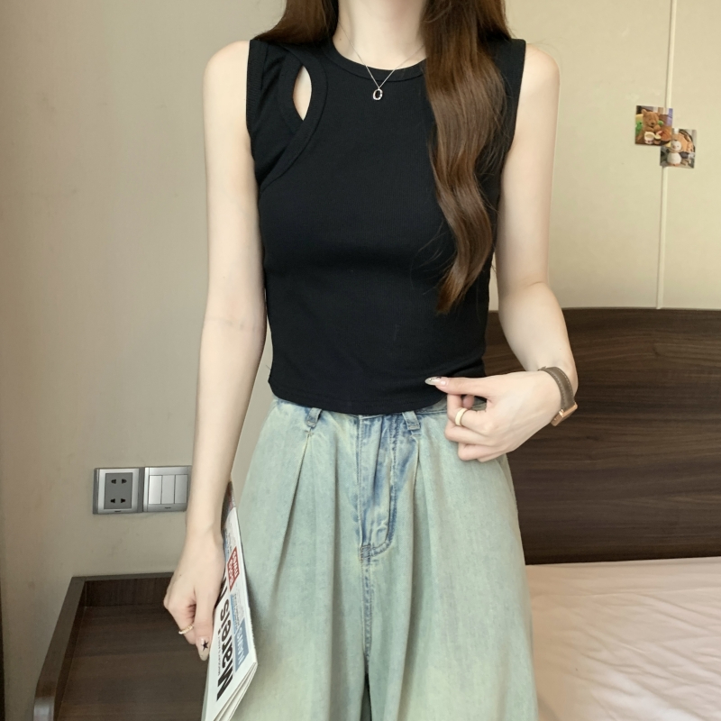 PF703#40支纯棉T恤女2024年夏季黑色背心女镂空弹力别致轻熟上衣