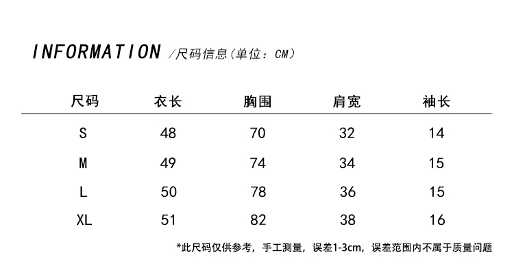 因裁剪工艺和丈量手法不同,可能存在1~3CM 左右误差,尺码仅供参考,以实物为准