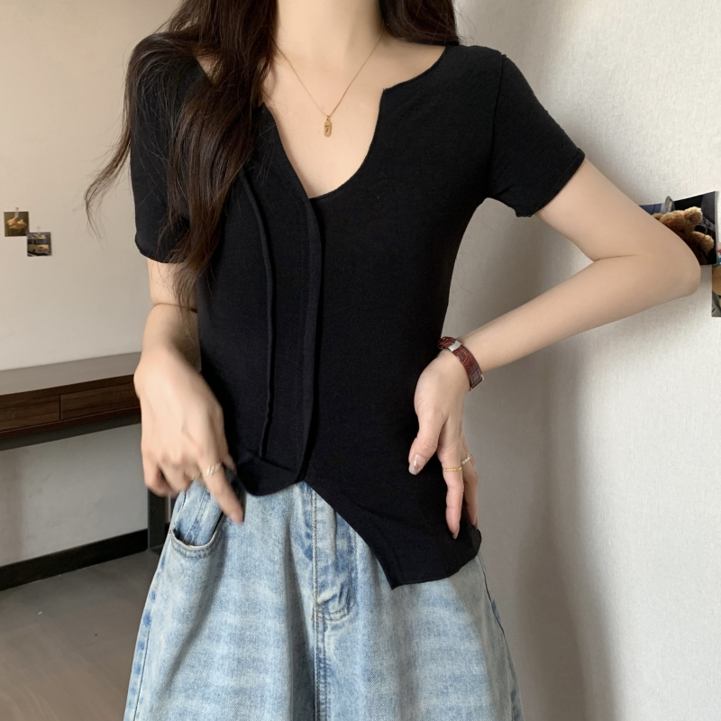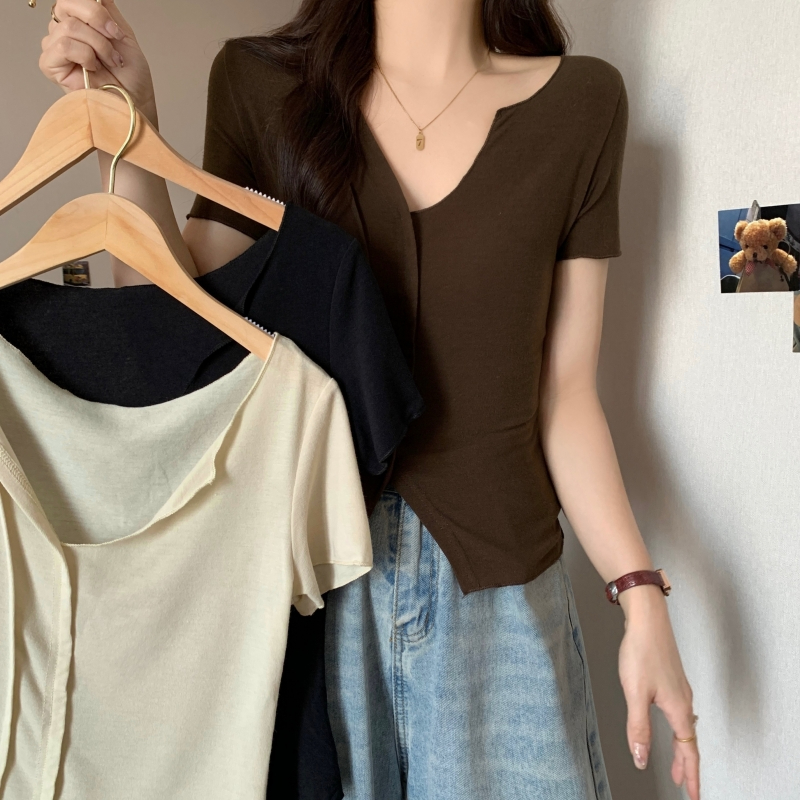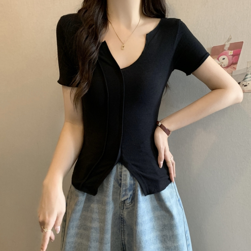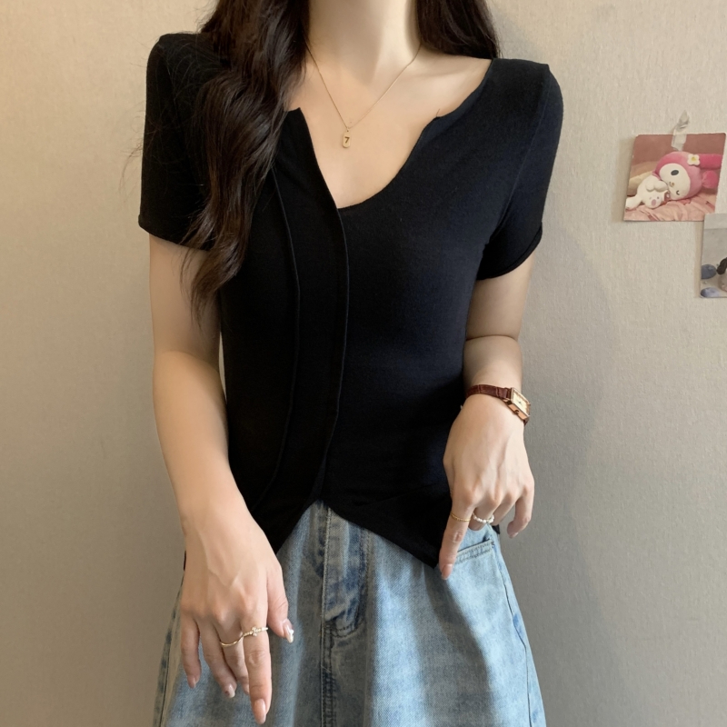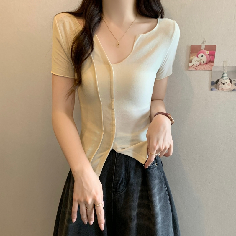 PF704#40支纯棉短袖T恤女夏季韩版新款设计感半开领纯色弹力上衣