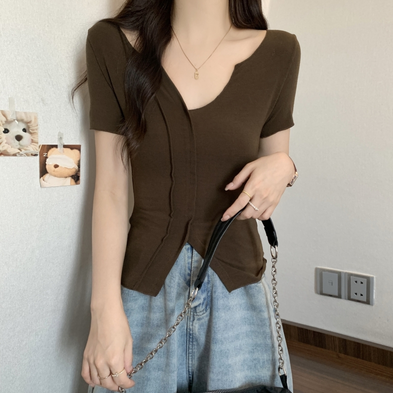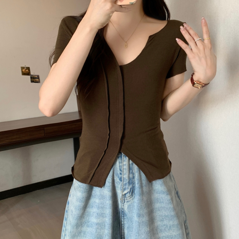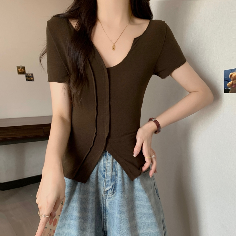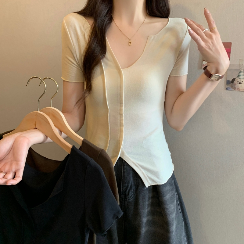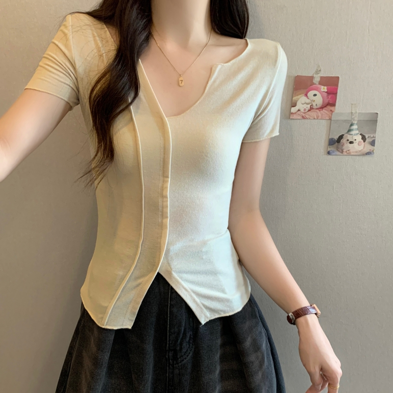 PF704#40支纯棉短袖T恤女夏季韩版新款设计感半开领纯色弹力上衣