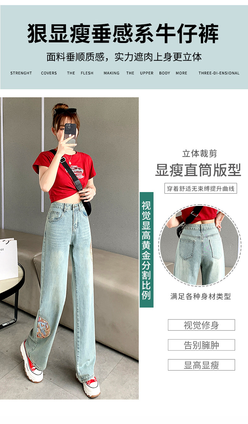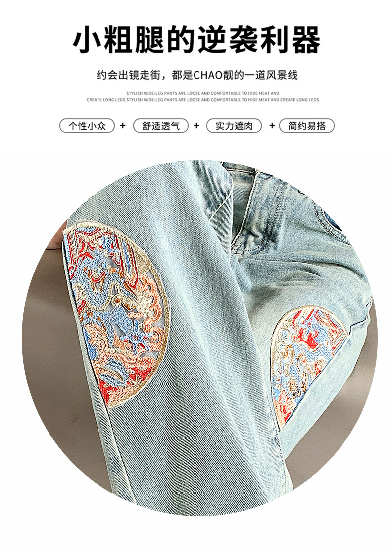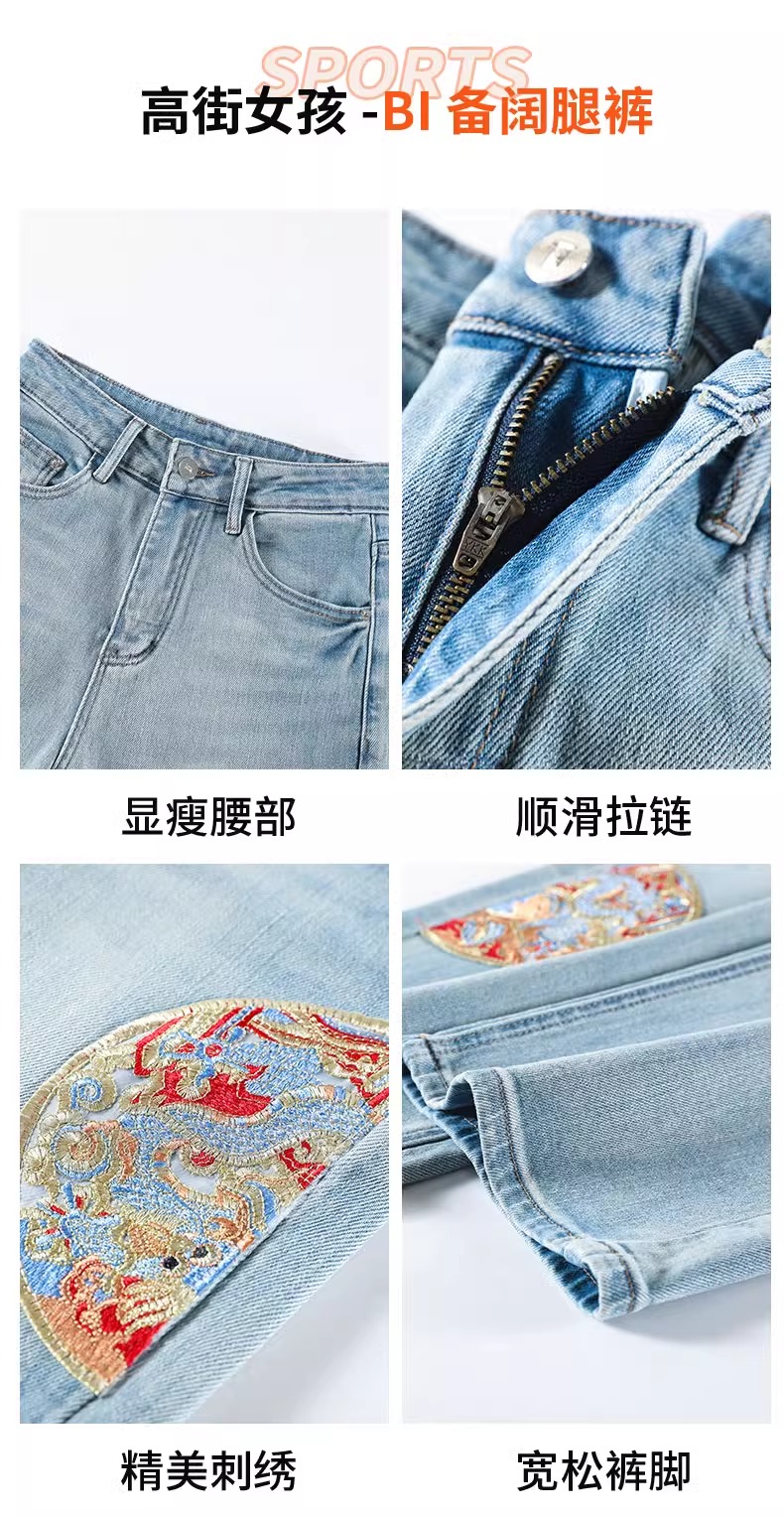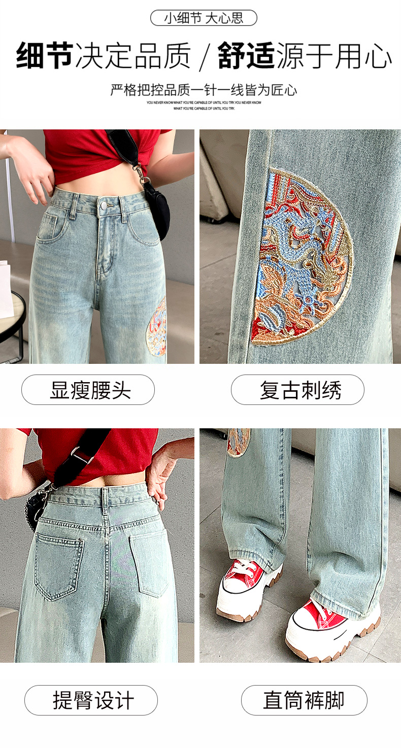 PF710#新中式国风刺绣牛仔裤女春装2024年新款显瘦高腰窄版阔腿直筒裤子
