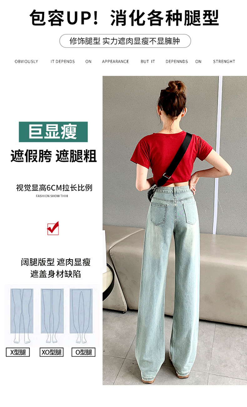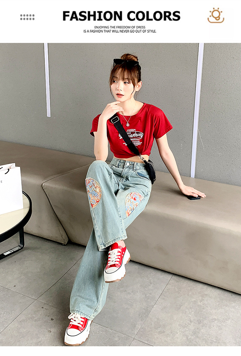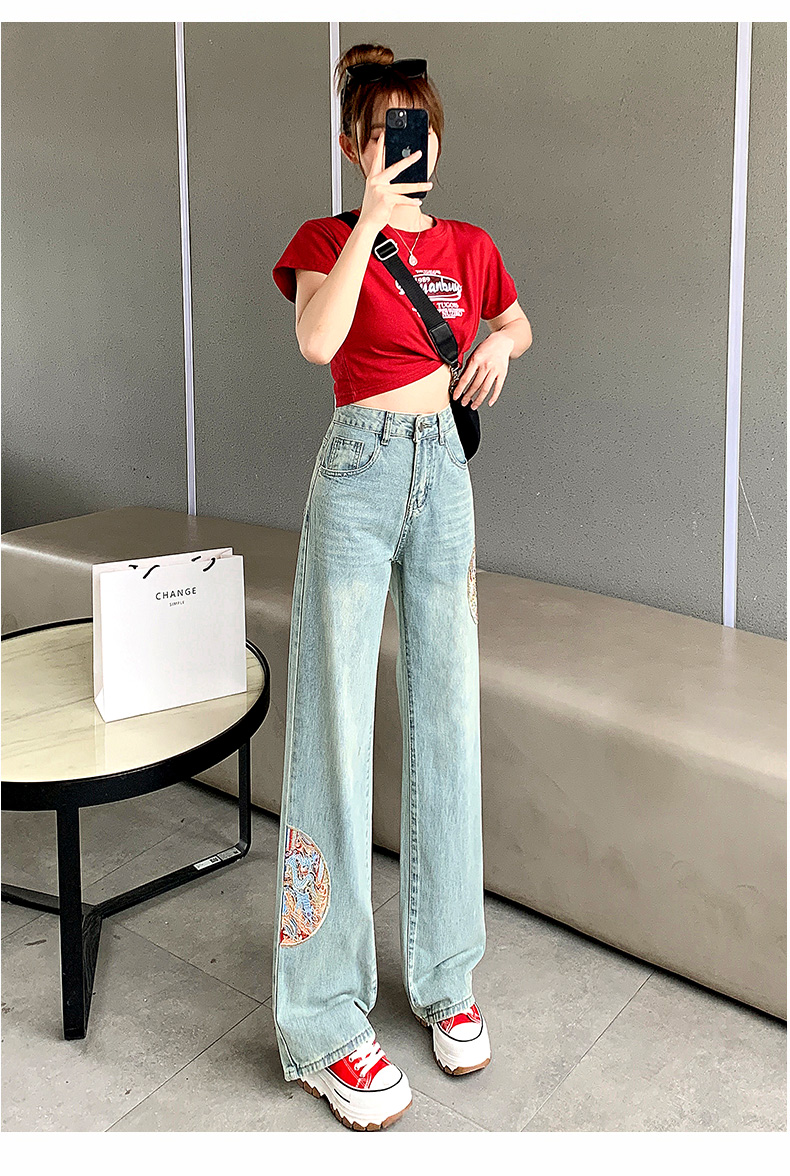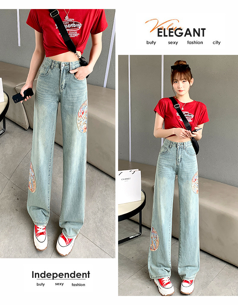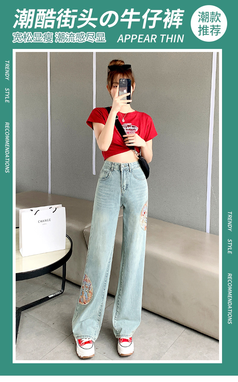 PF710#新中式国风刺绣牛仔裤女春装2024年新款显瘦高腰窄版阔腿直筒裤子