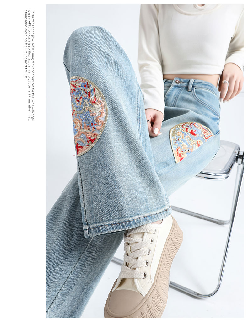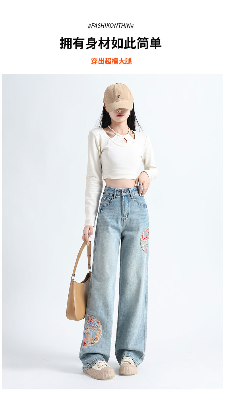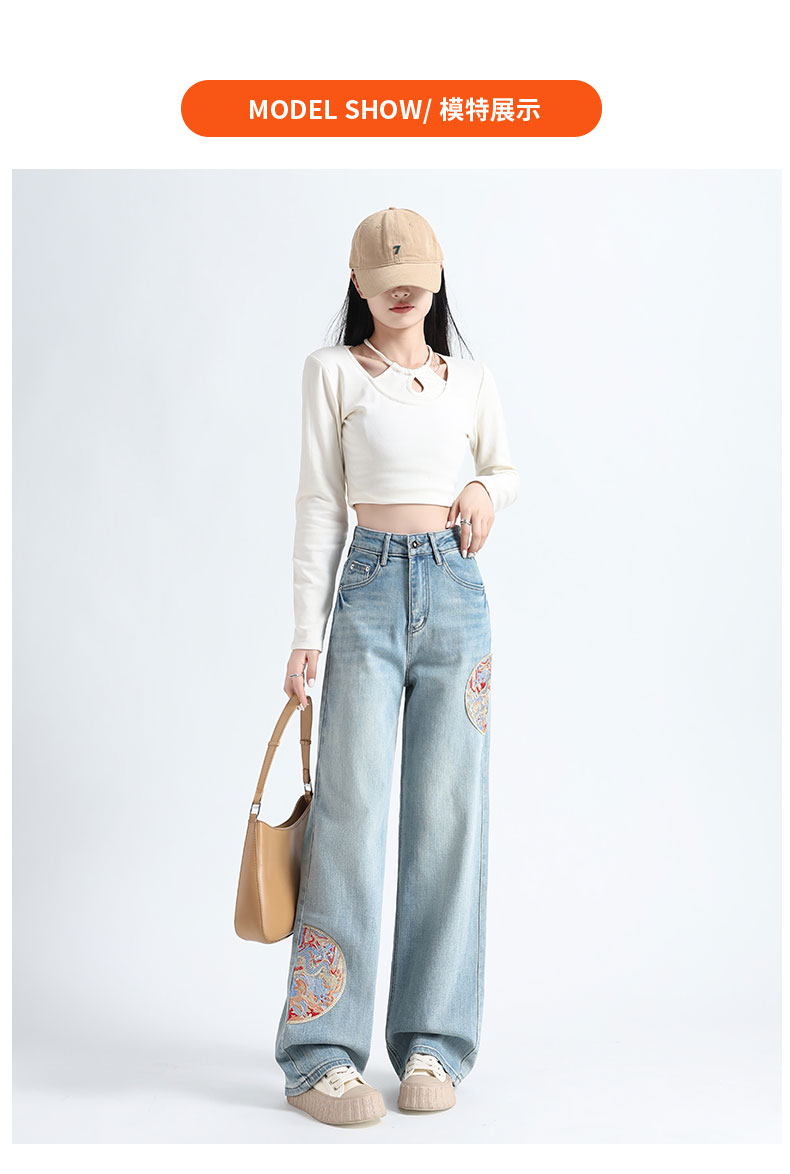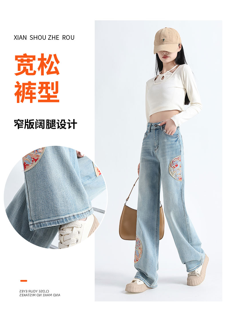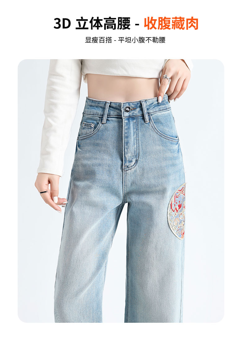 PF711#新中式国风刺绣牛仔裤女春装2024年新款显瘦高腰窄版阔腿直筒裤子