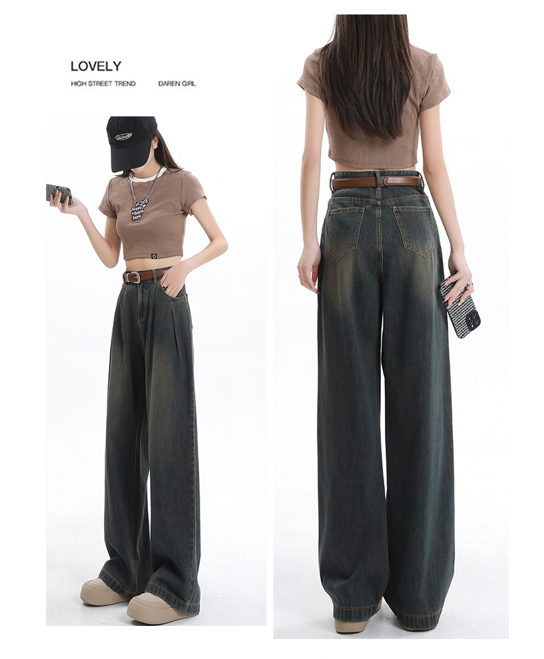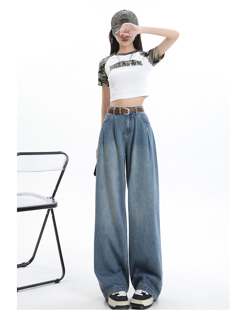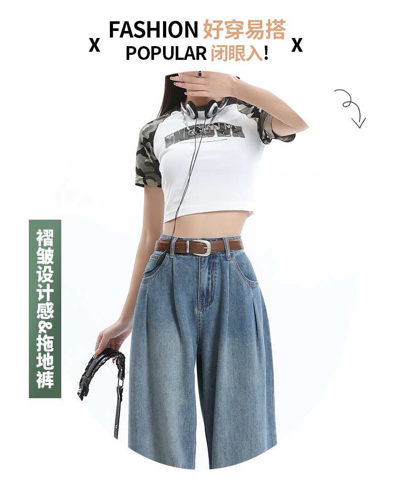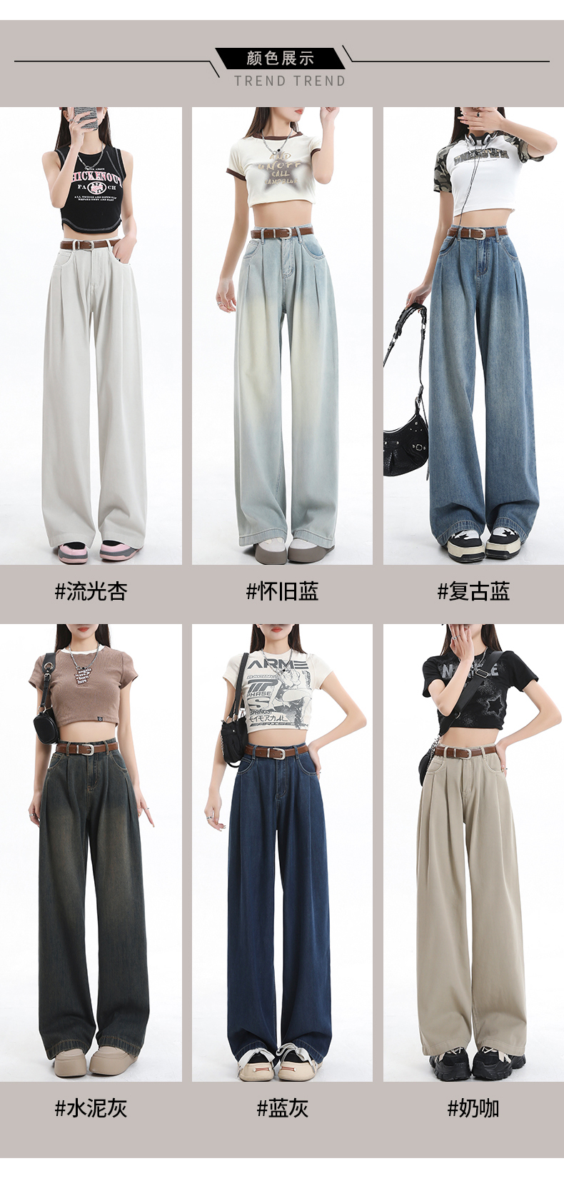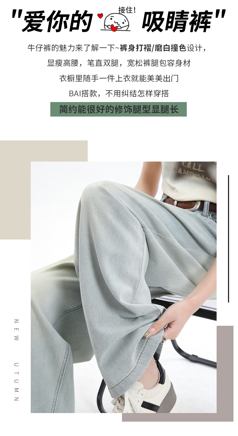 PF712#韩版蓝色牛仔阔腿裤女高腰宽松显瘦褶皱设计感直筒拖地裤