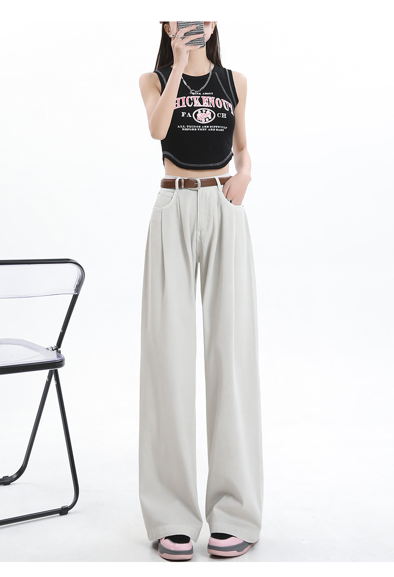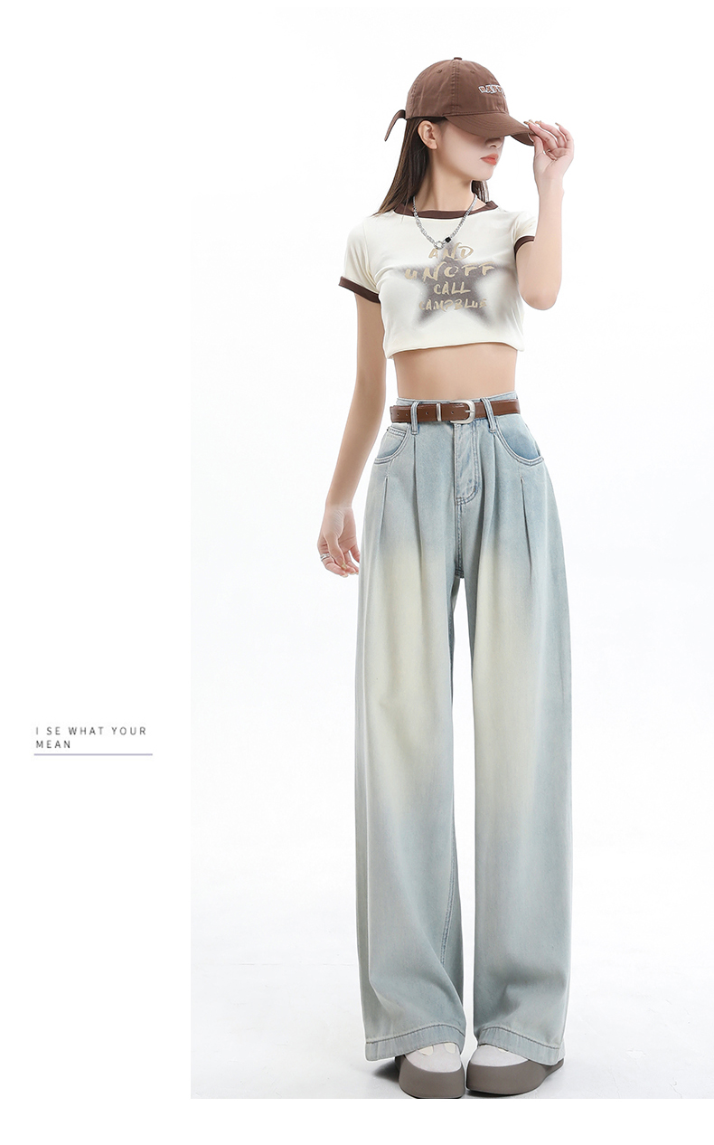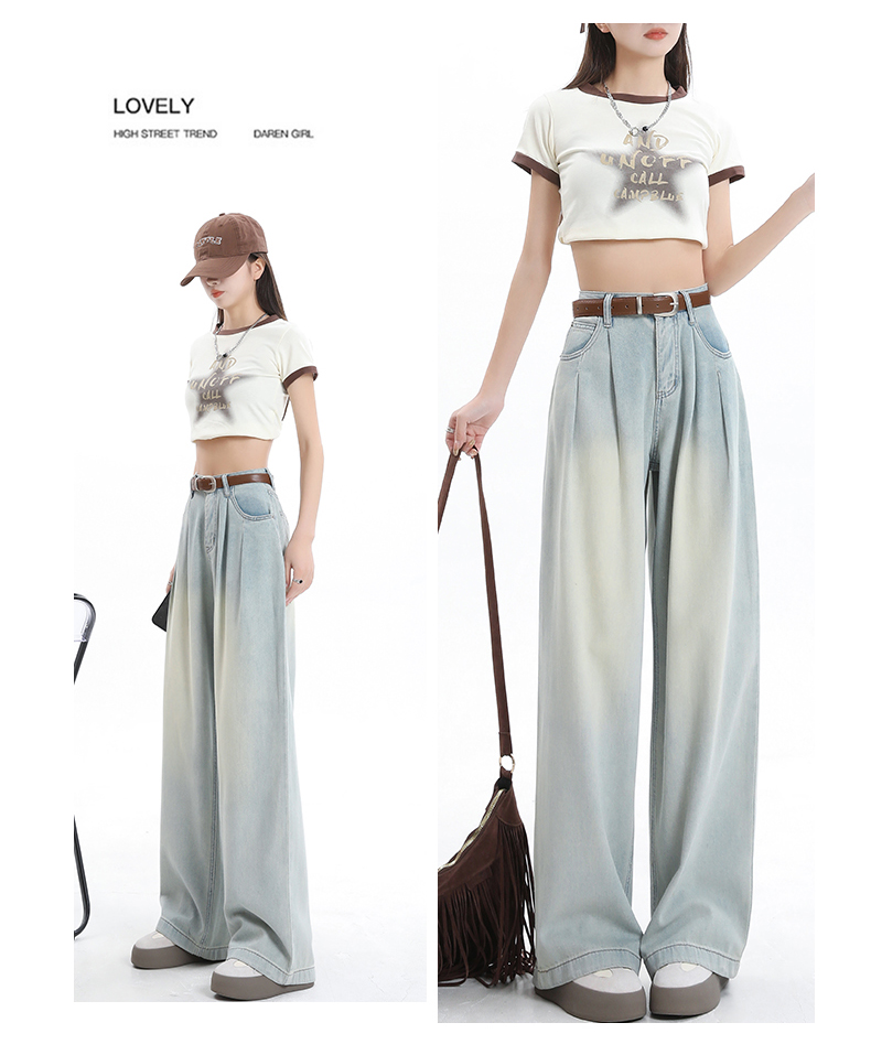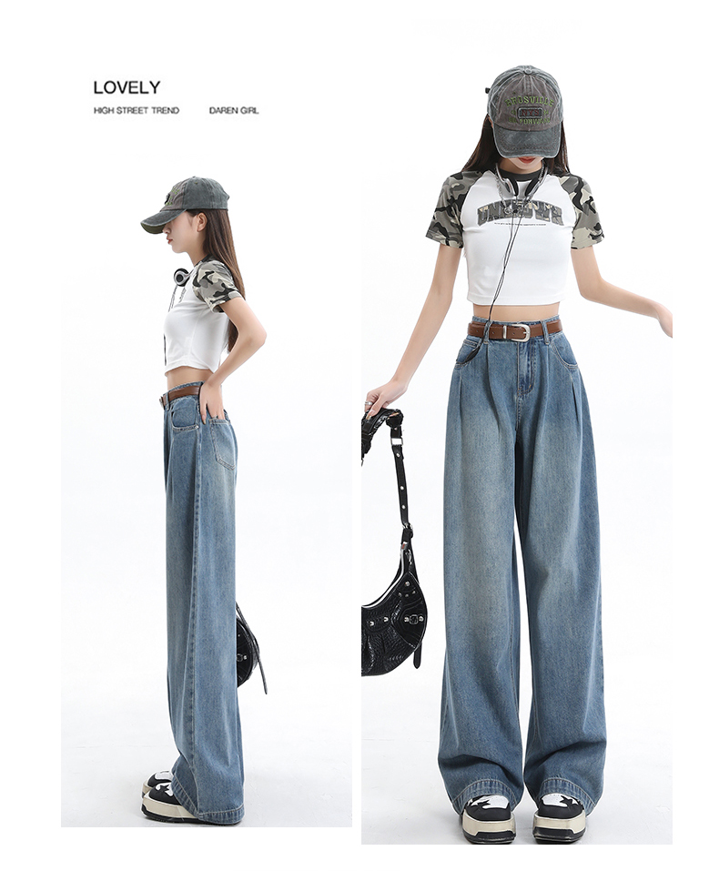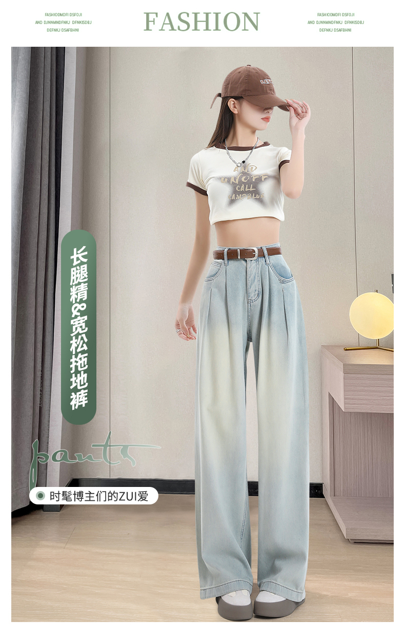 PF712#韩版蓝色牛仔阔腿裤女高腰宽松显瘦褶皱设计感直筒拖地裤