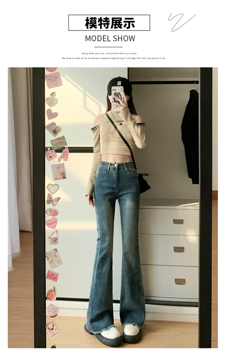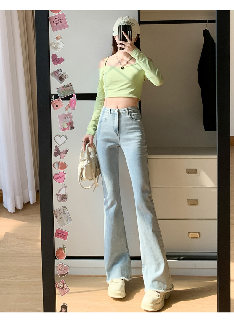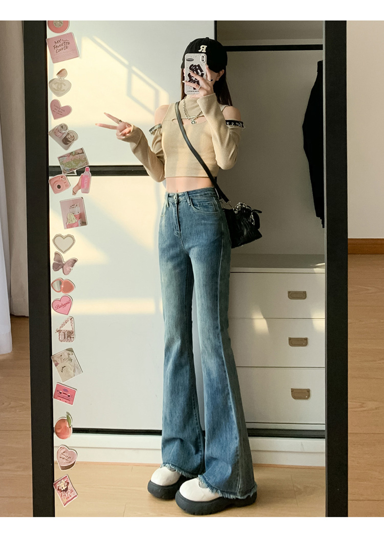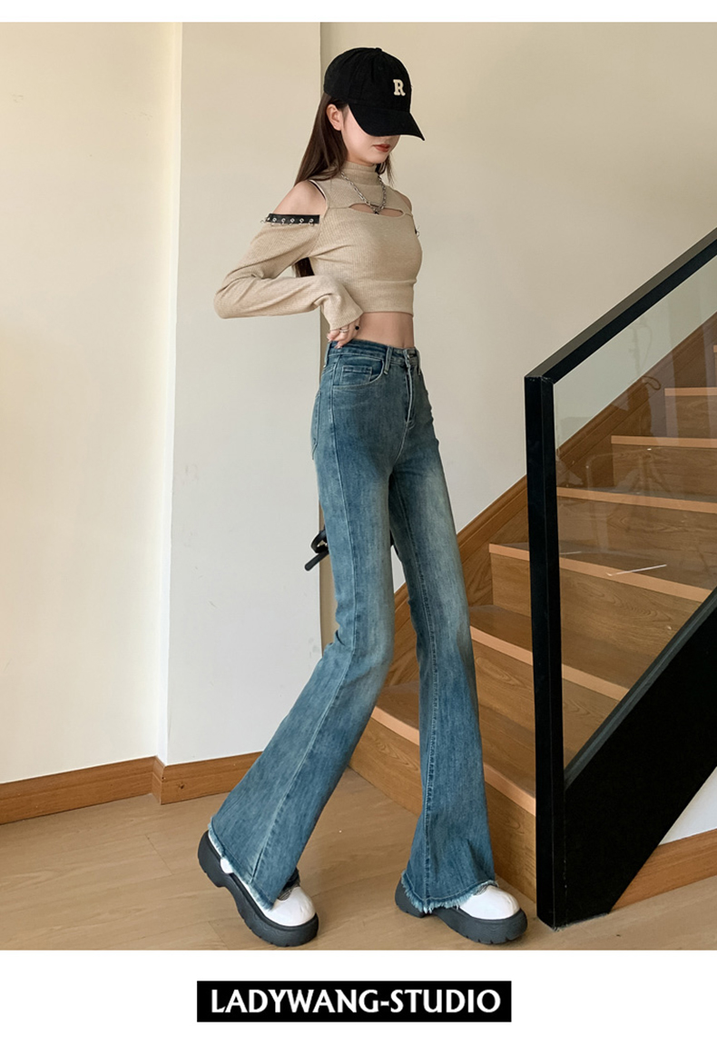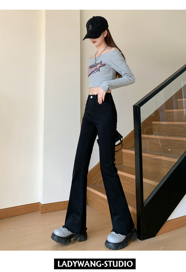 PF713#高弹喇叭毛边&辣妹牛仔裤潮高腰流苏微喇叭辣妹长裤加长