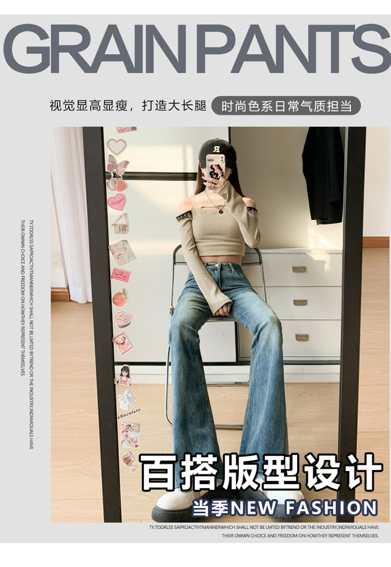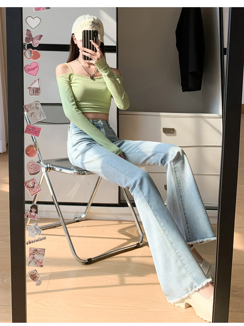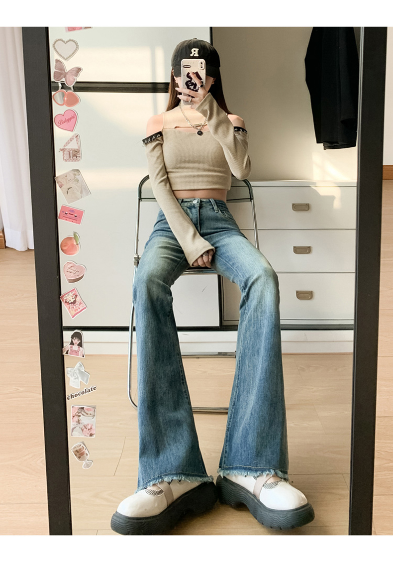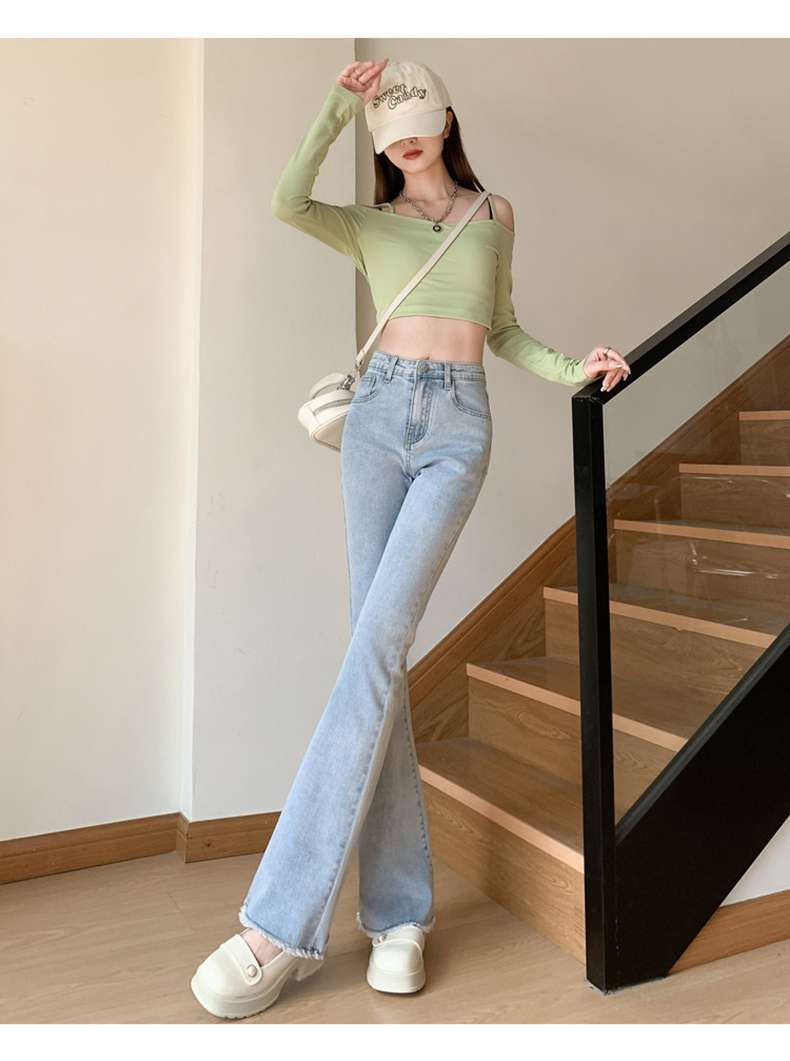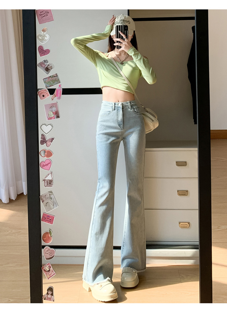 PF713#高弹喇叭毛边&辣妹牛仔裤潮高腰流苏微喇叭辣妹长裤加长