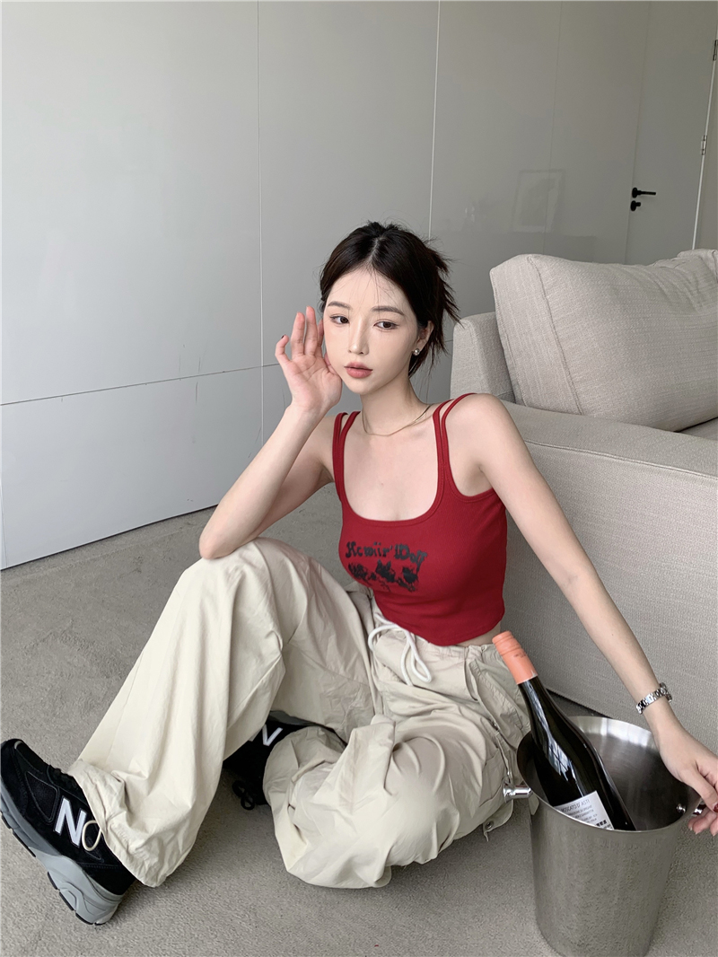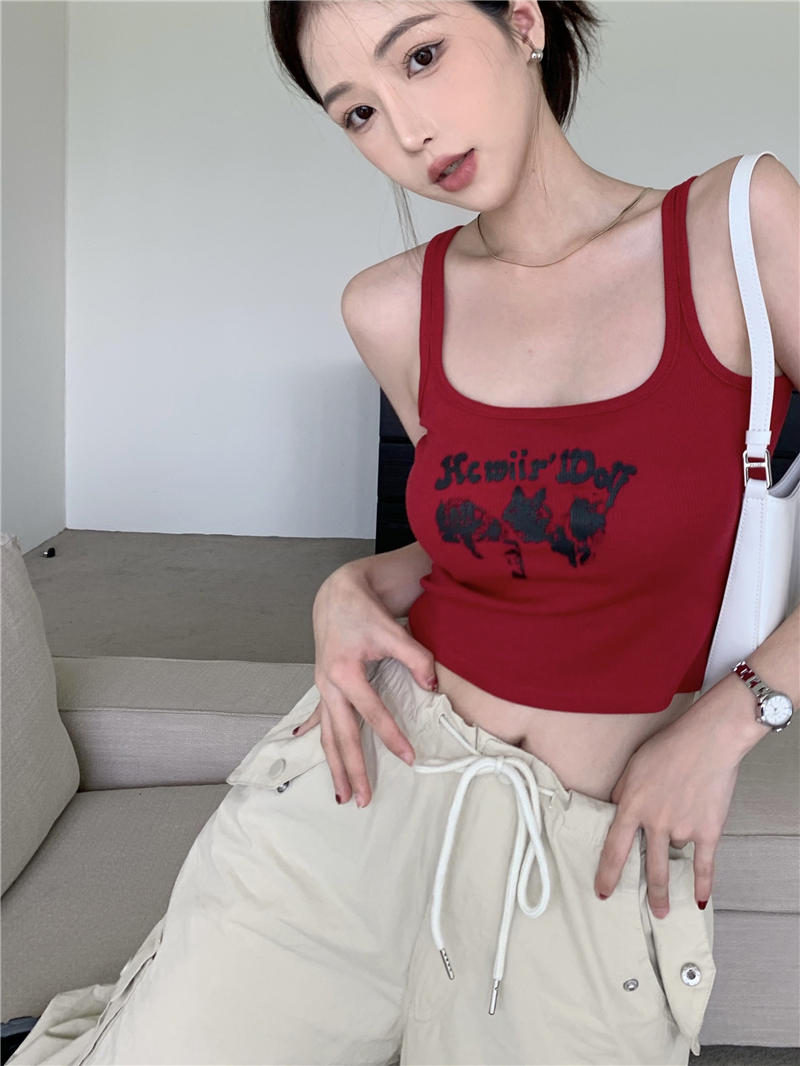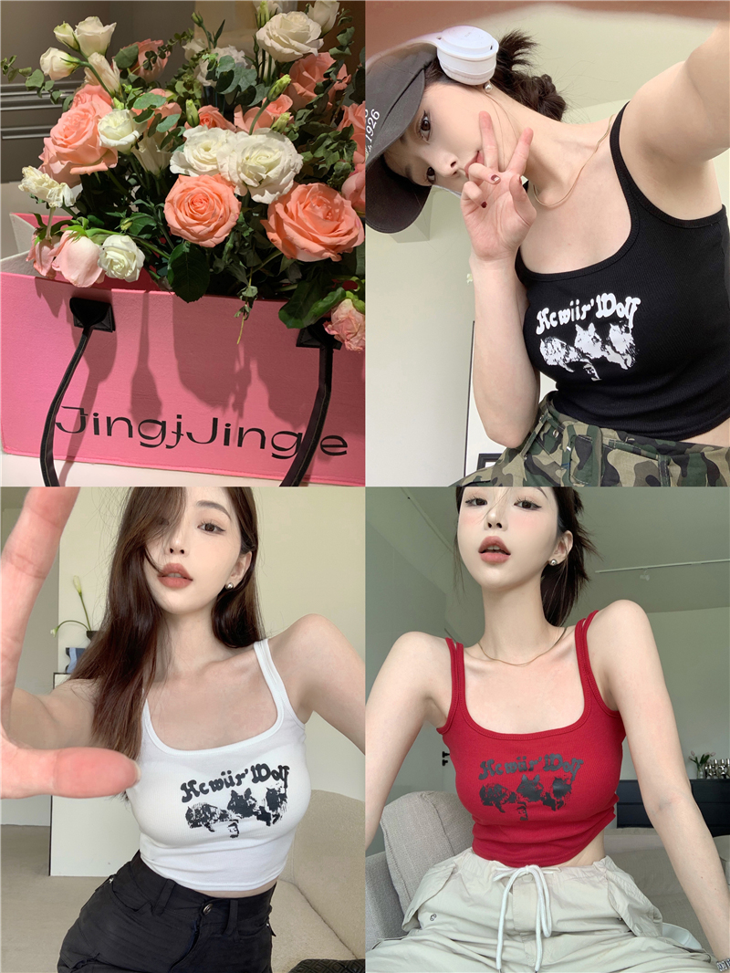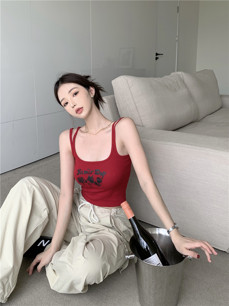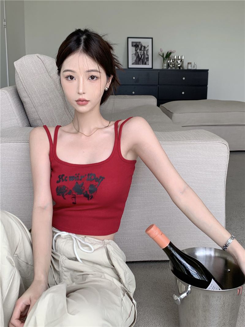 PF771#红色无袖短款吊带背心女夏季ins修身印花甜酷辣妹内搭上衣外穿潮