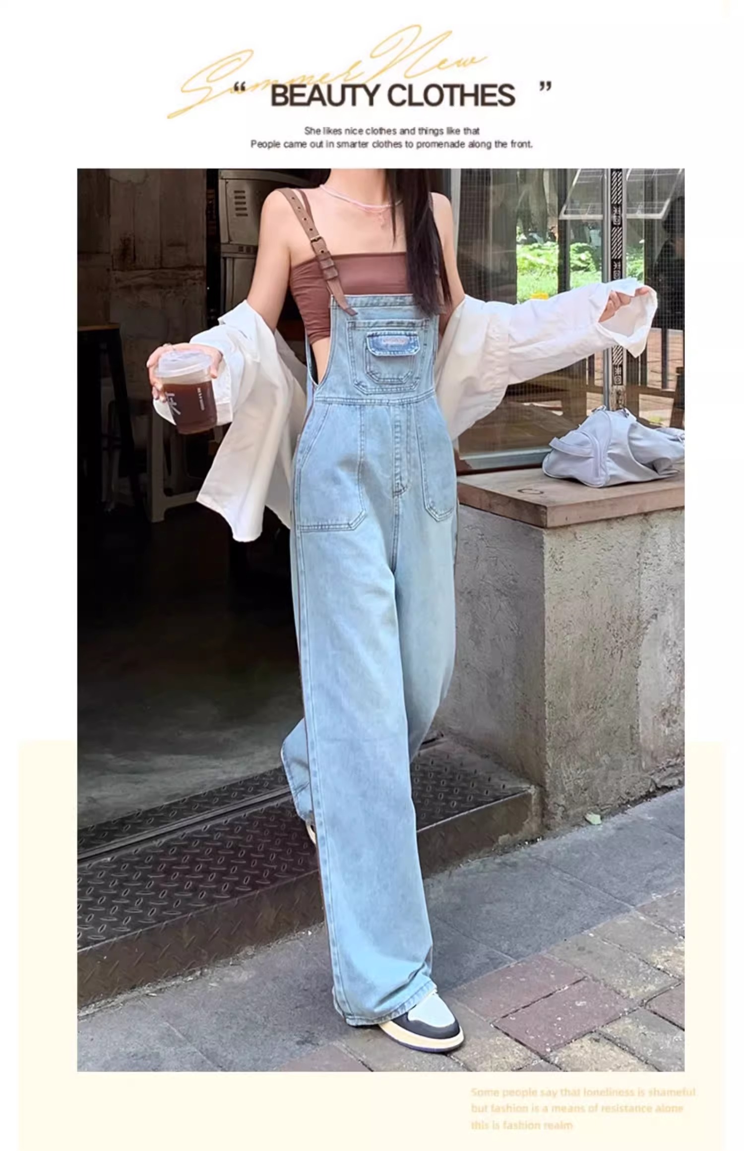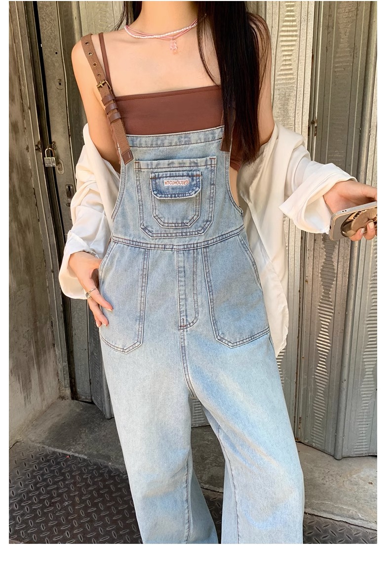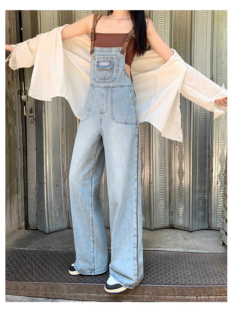 PF772#夏装新款实拍大码女装棕色扣牛仔背带裤复古阔腿裤M-5XL200斤