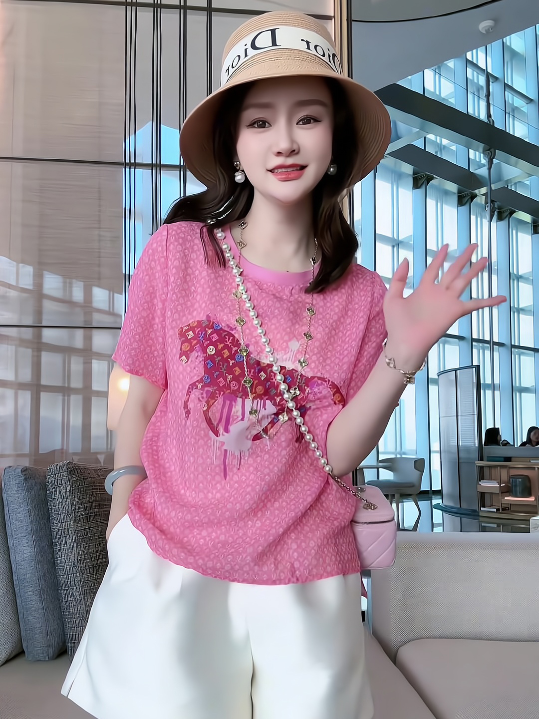 PF825#新款小马图案洋气时尚百搭桑蚕丝T恤上衣粉色女装