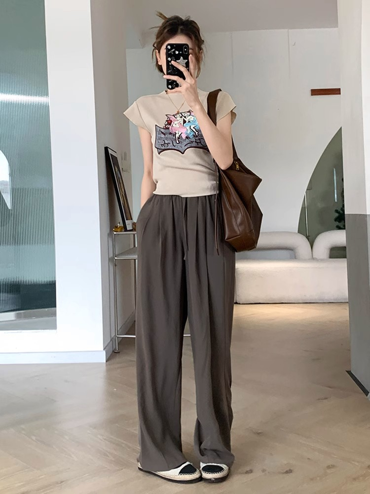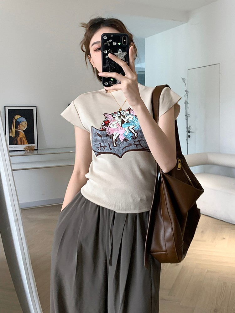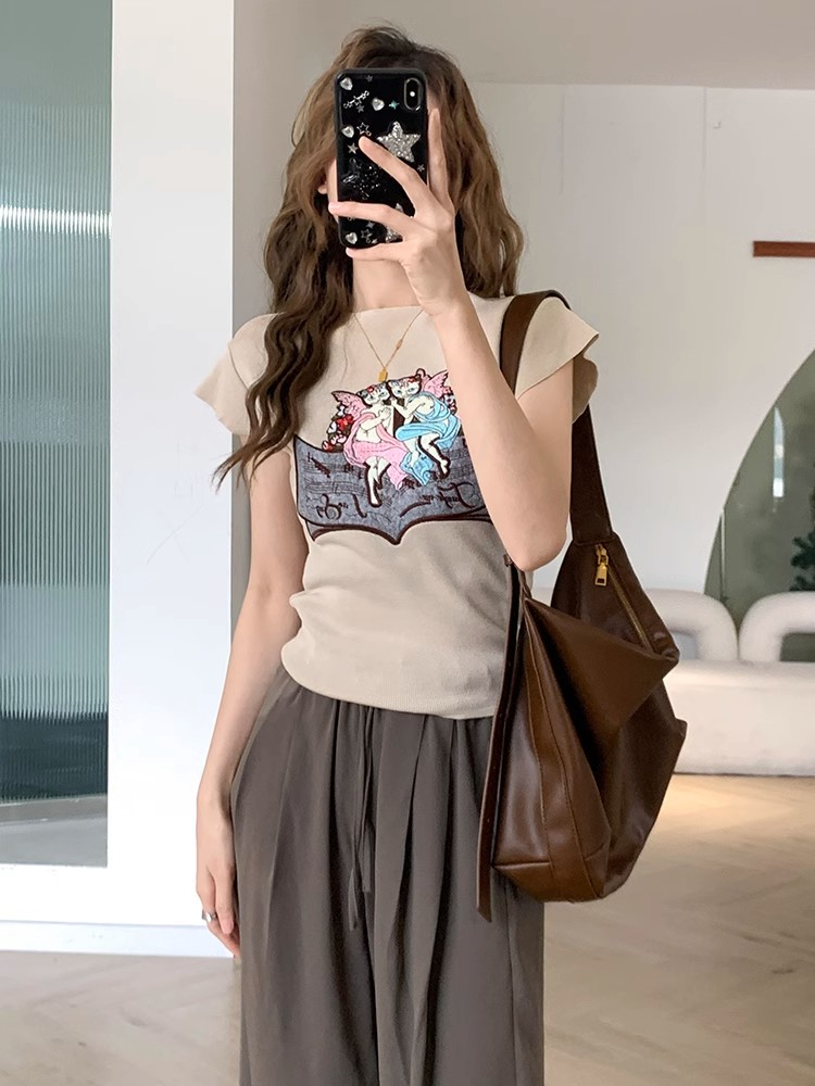 PF876#夏季新款刺绣印花T恤女内搭设计感修身打底衫百搭短袖上衣ins