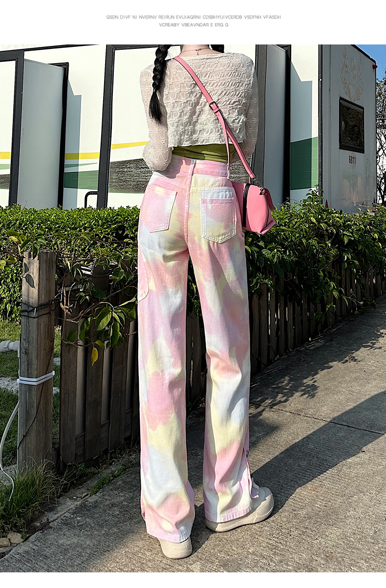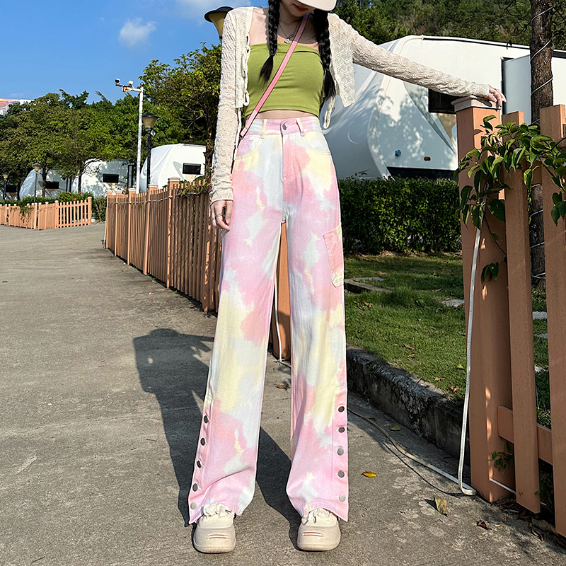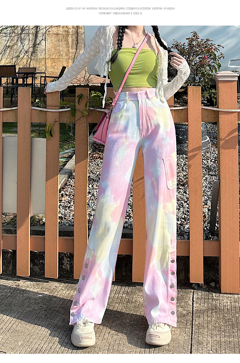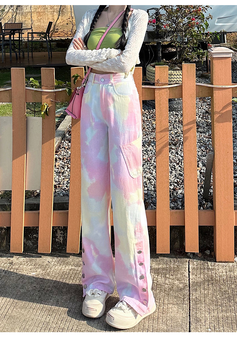 PF898#马卡龙色阔腿拖地裤长裤高腰显瘦牛仔裤女扎染渐变色舞蹈开叉多扣