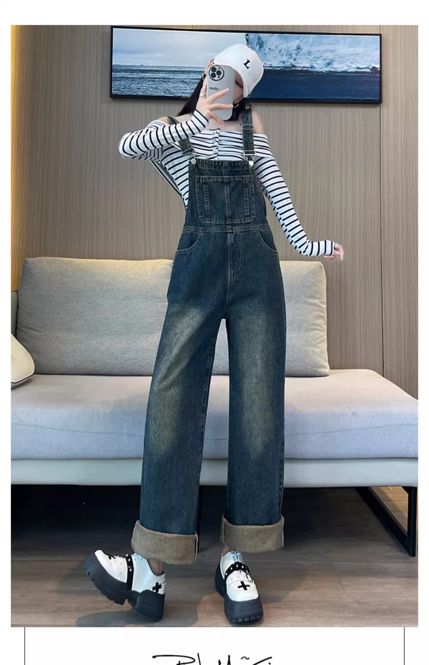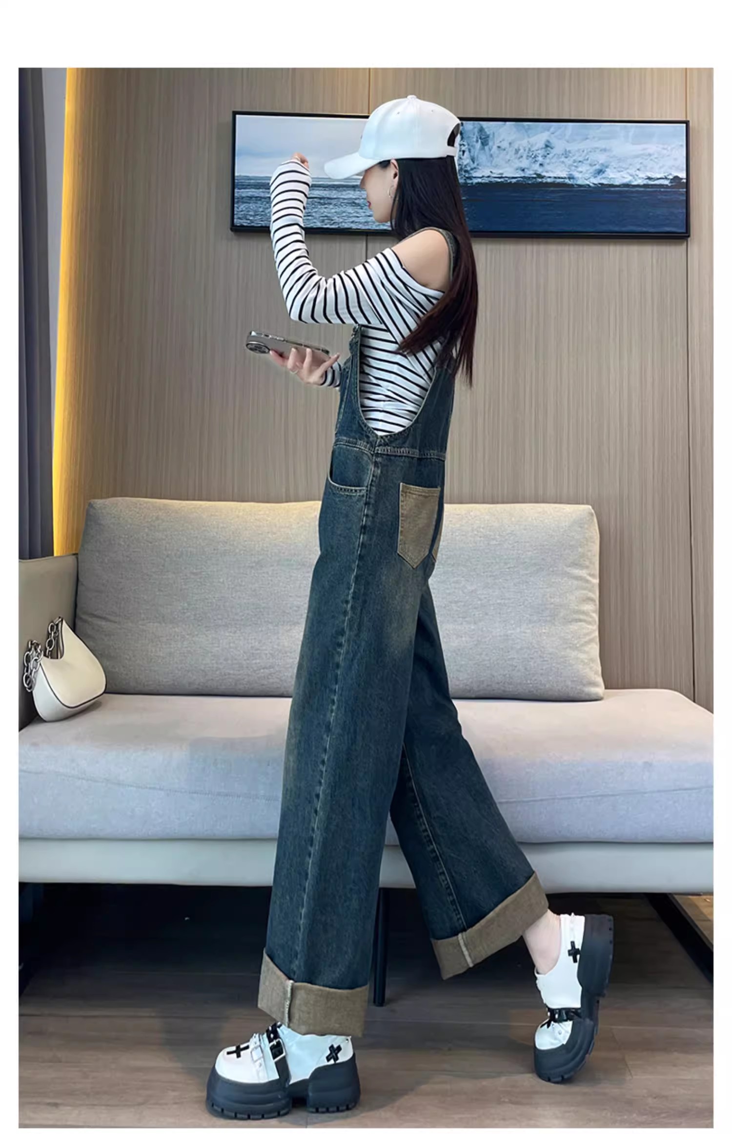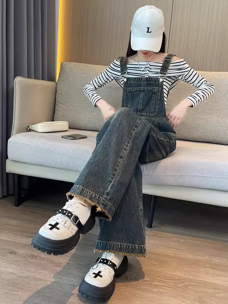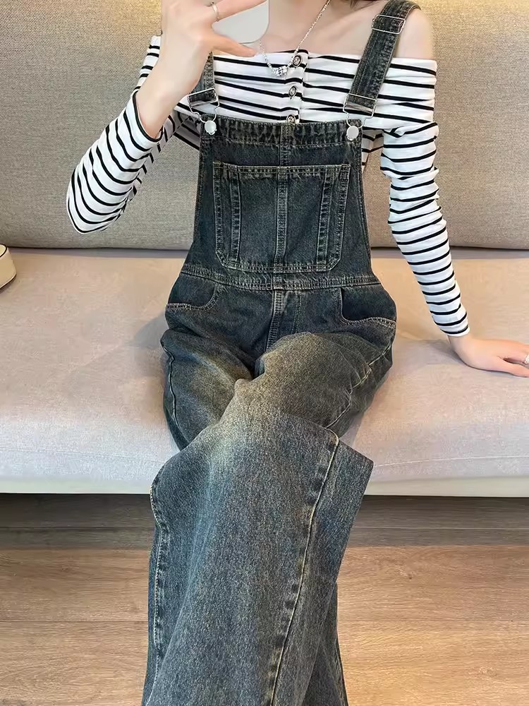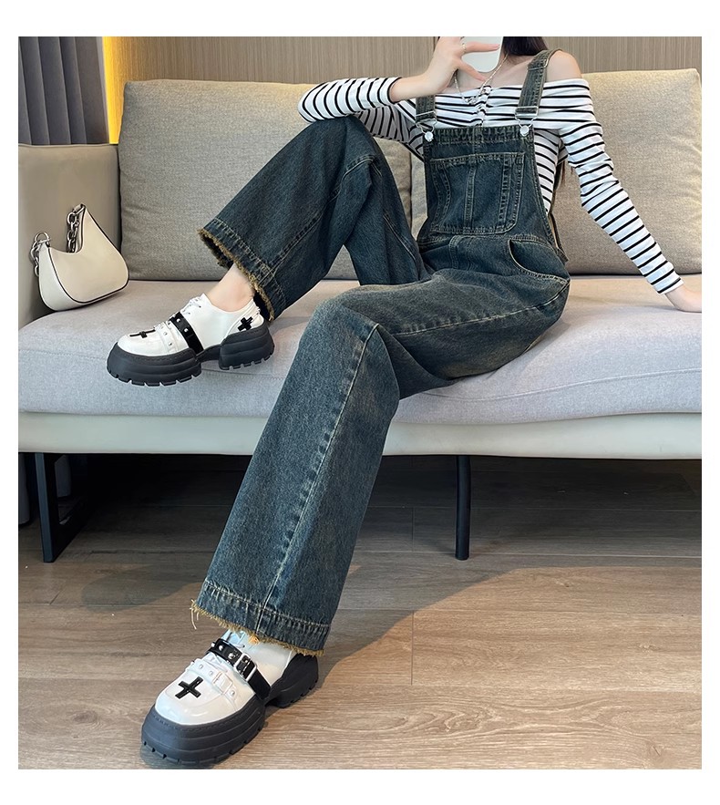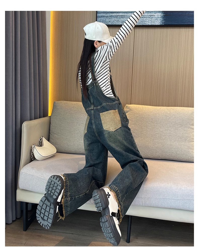 PF921#复古牛仔背带裤女 新款直筒宽松慵懒风减龄工装阔腿裤子