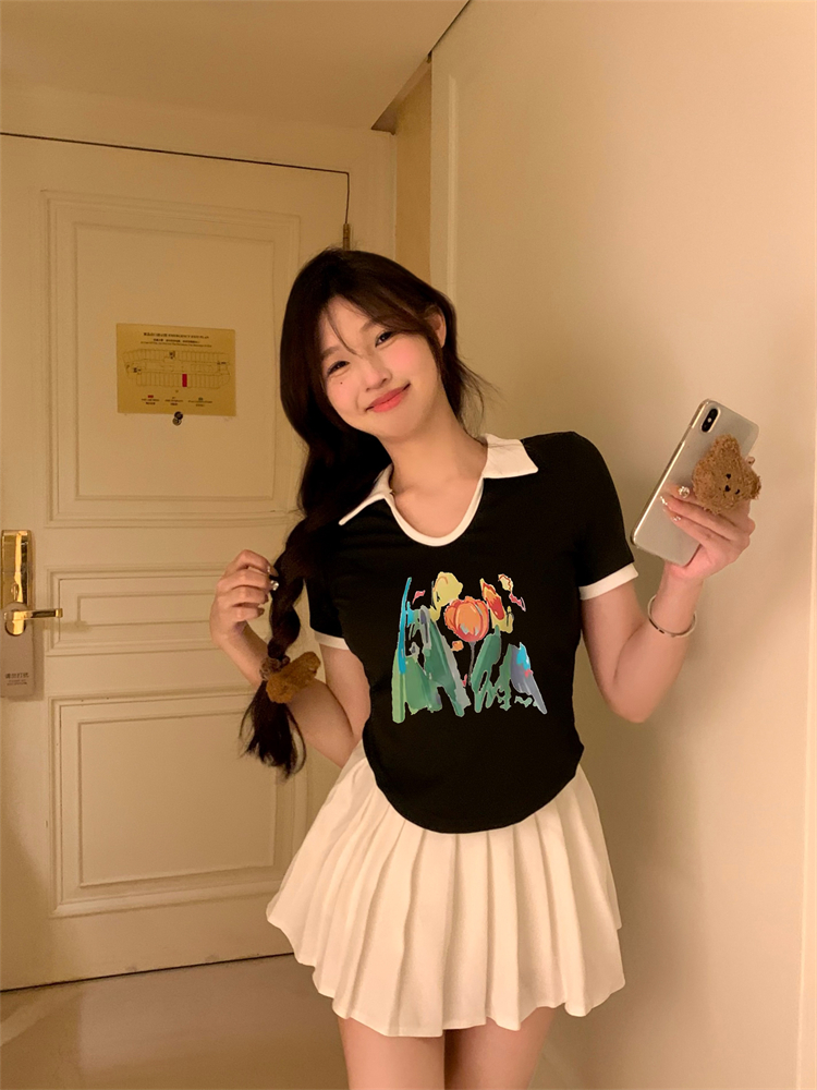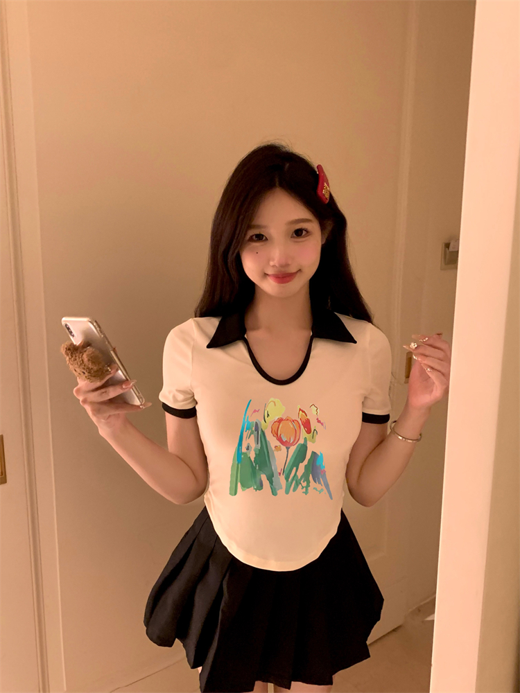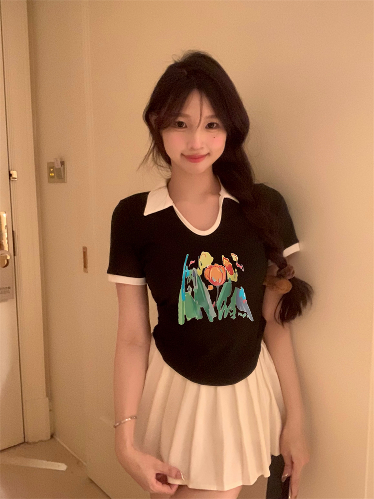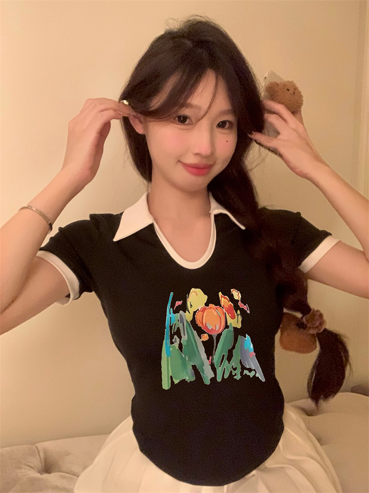 PF973#正肩t恤大码女装夏季短袖法式胖妹妹遮肚显瘦POLO领V藏肉上衣