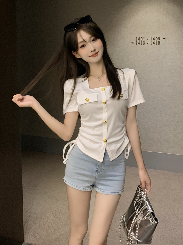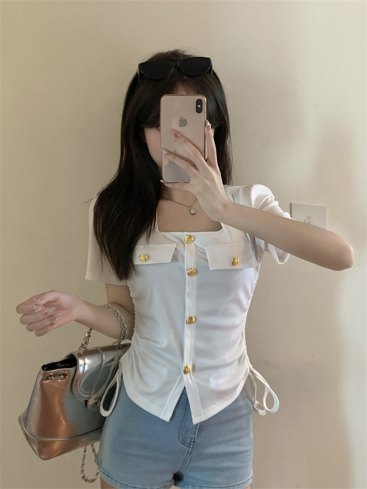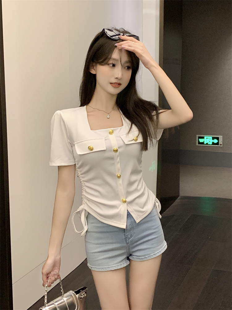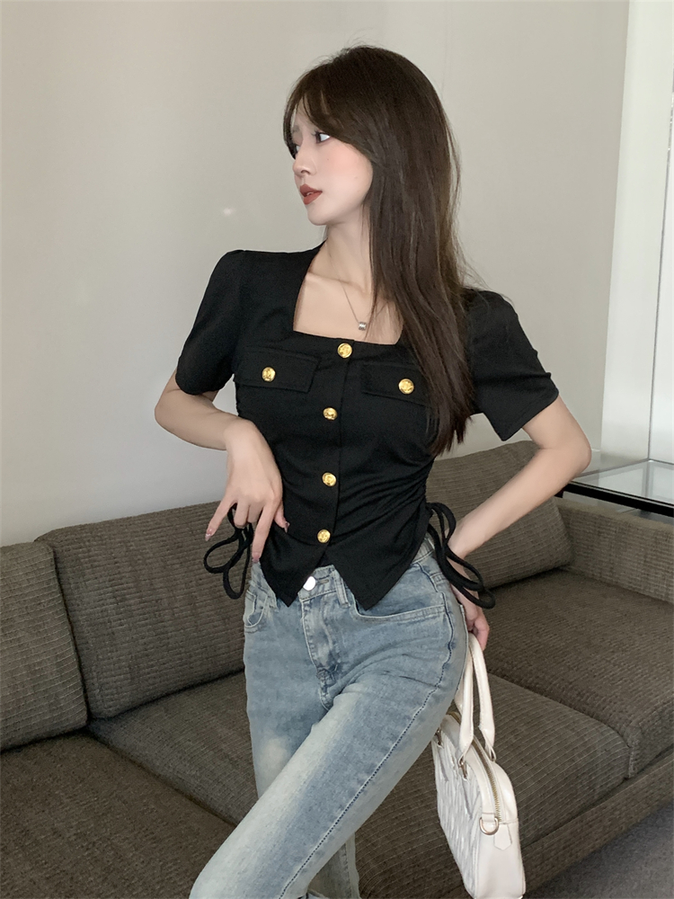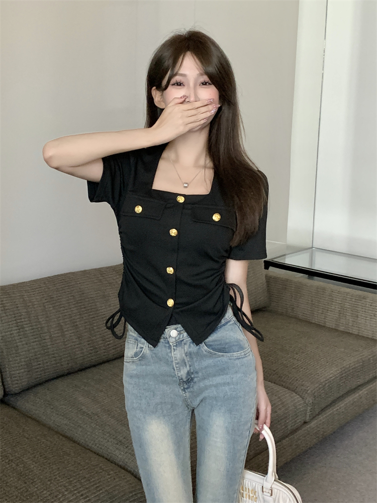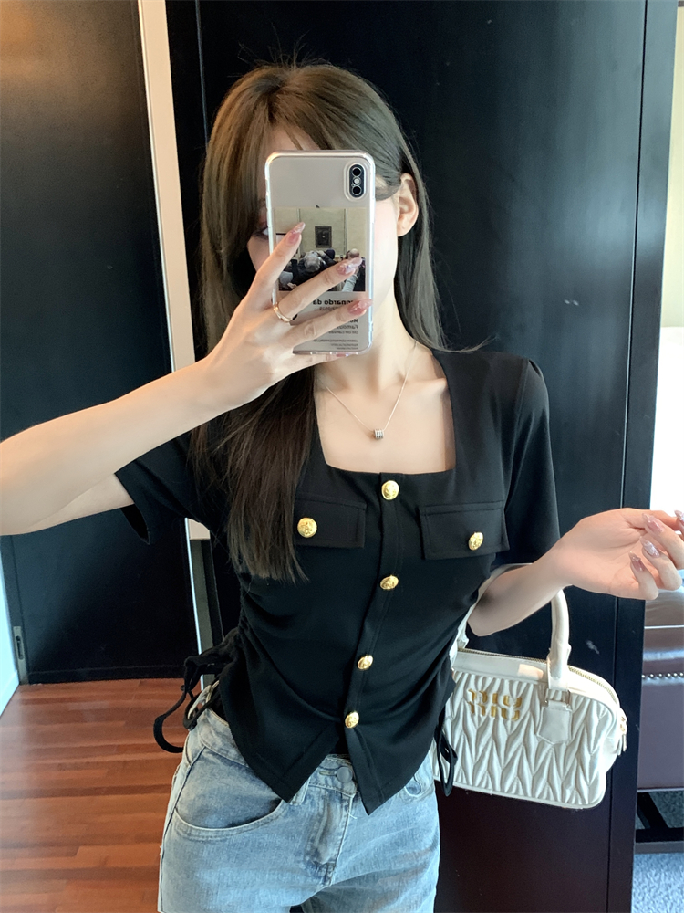 PF974#大码女装 新款法式短款方领上衣胖mm显瘦正肩抽绳短袖t恤