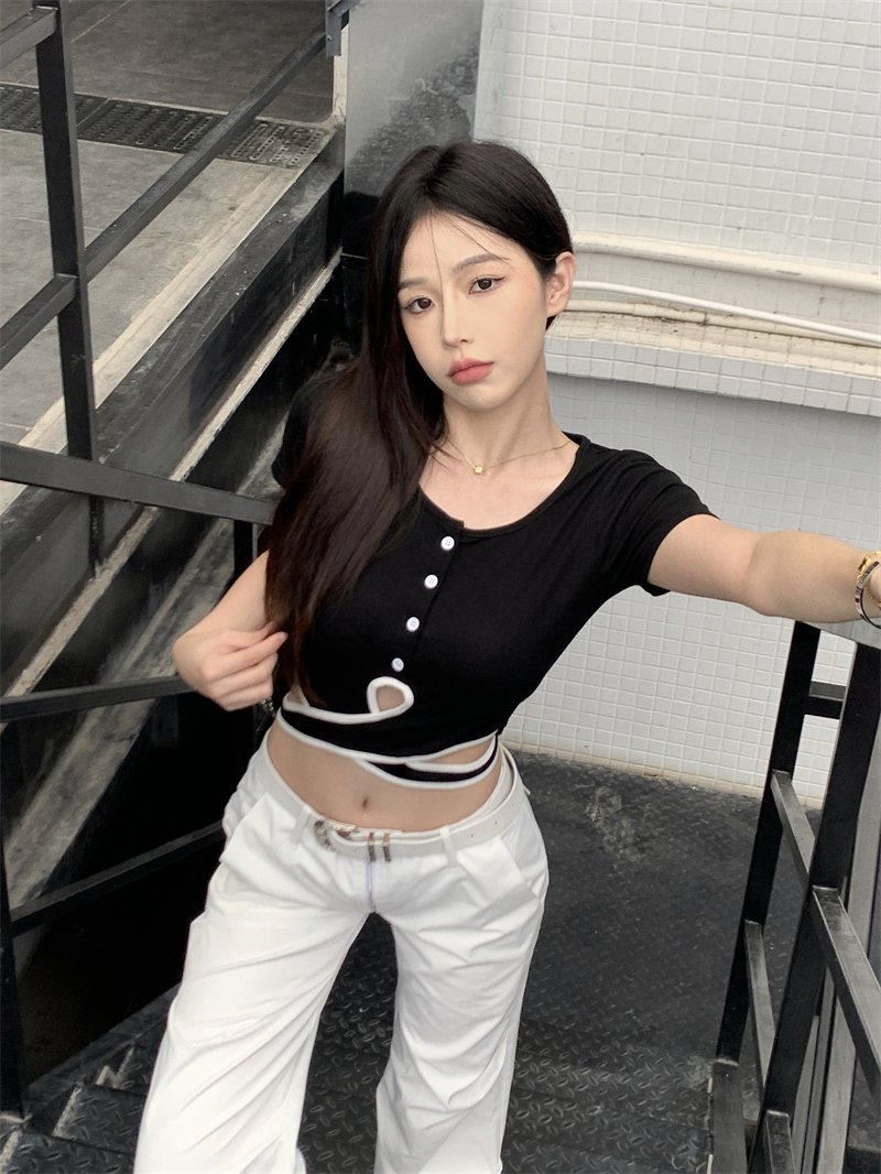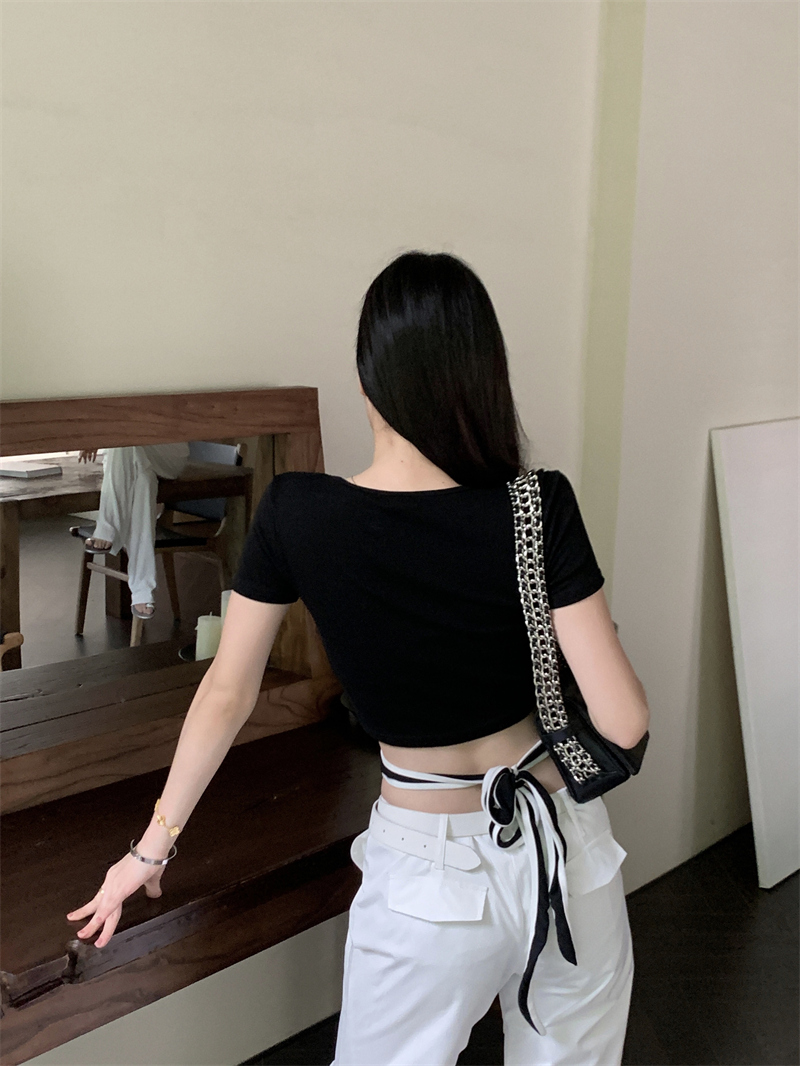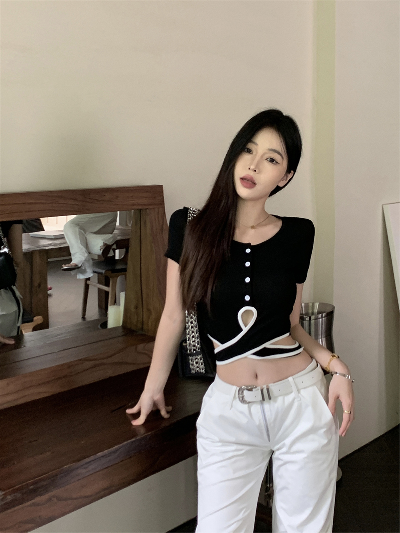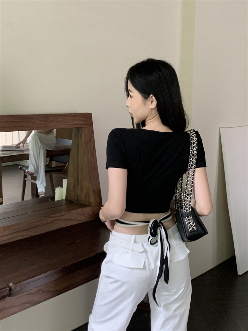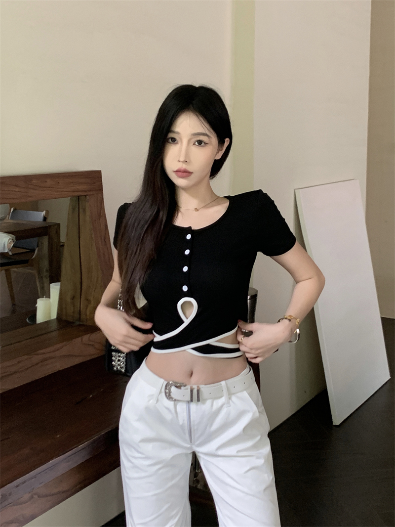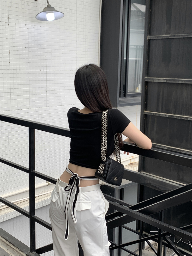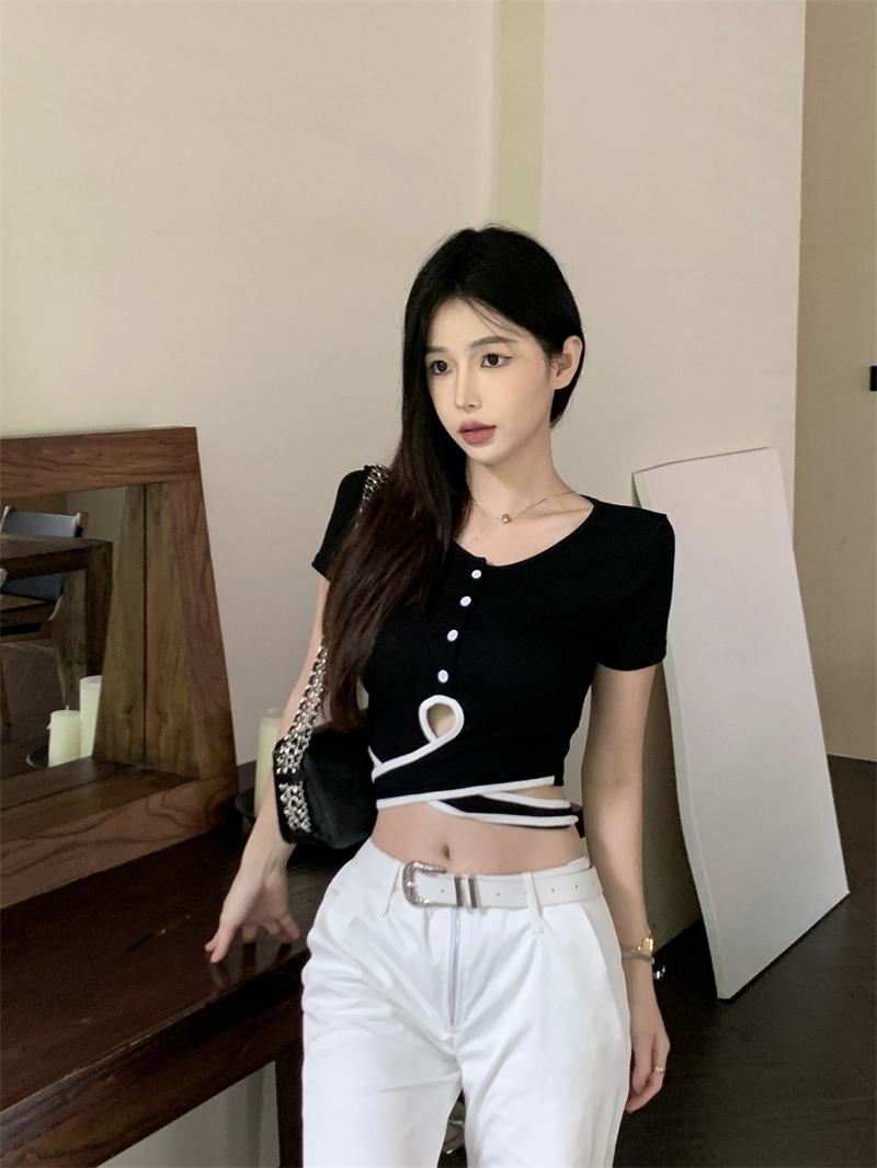 PF1048#小众设计感辣妹撞色交叉绑带t恤女韩版扭结镂空短款上衣