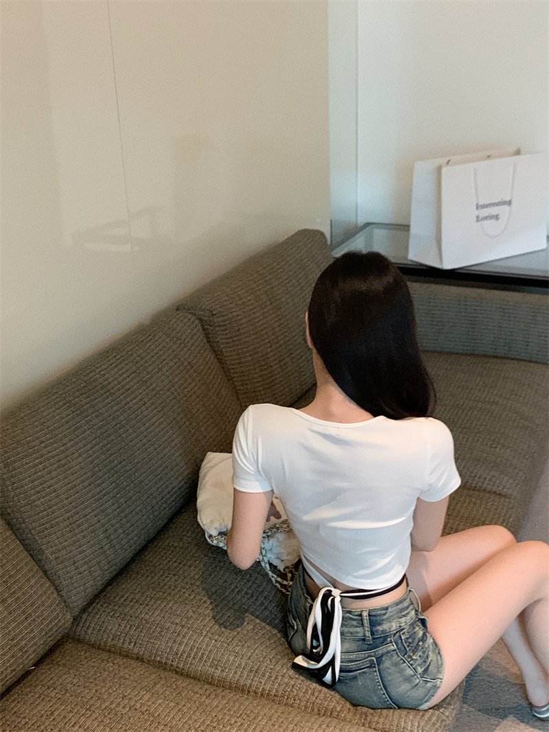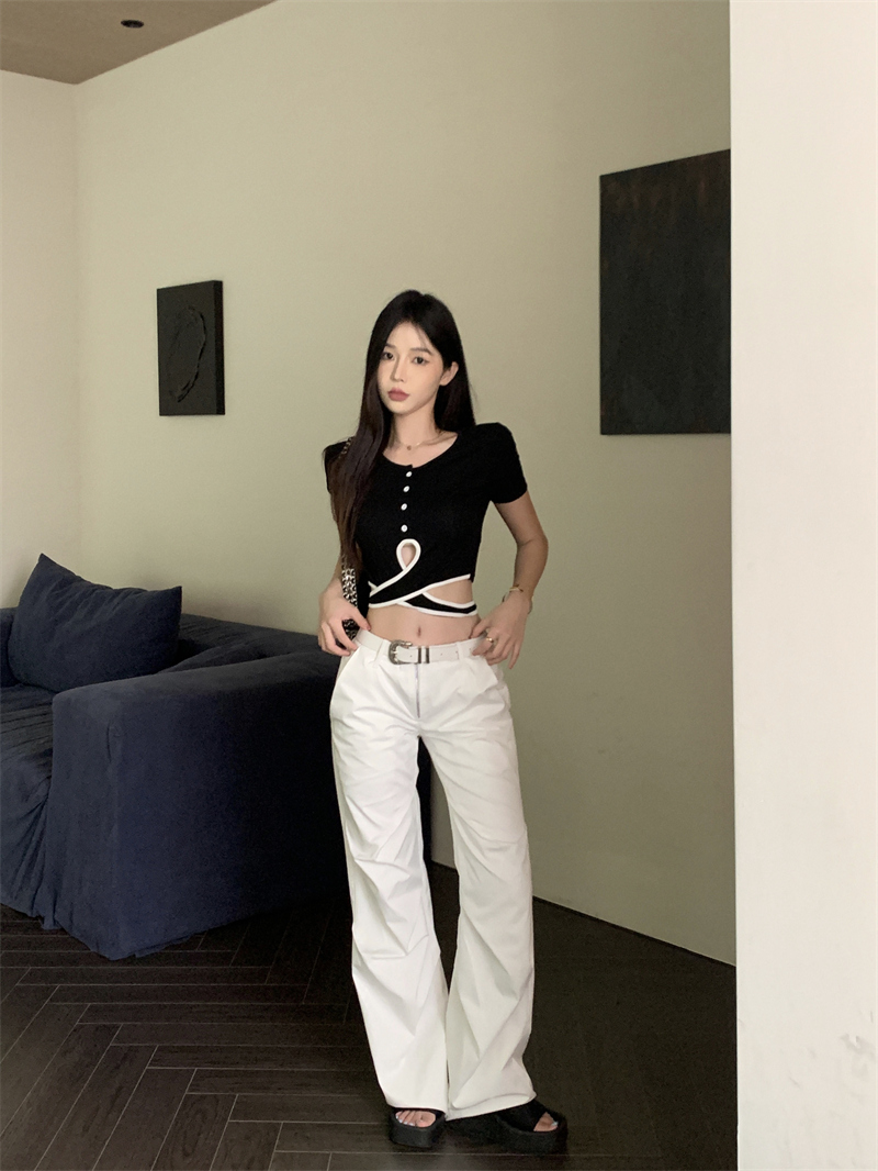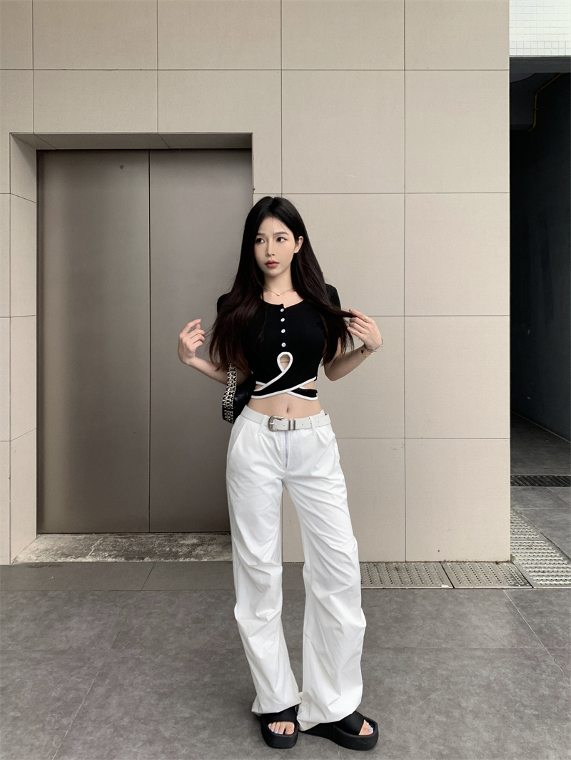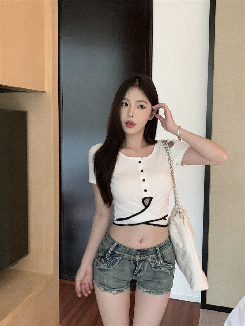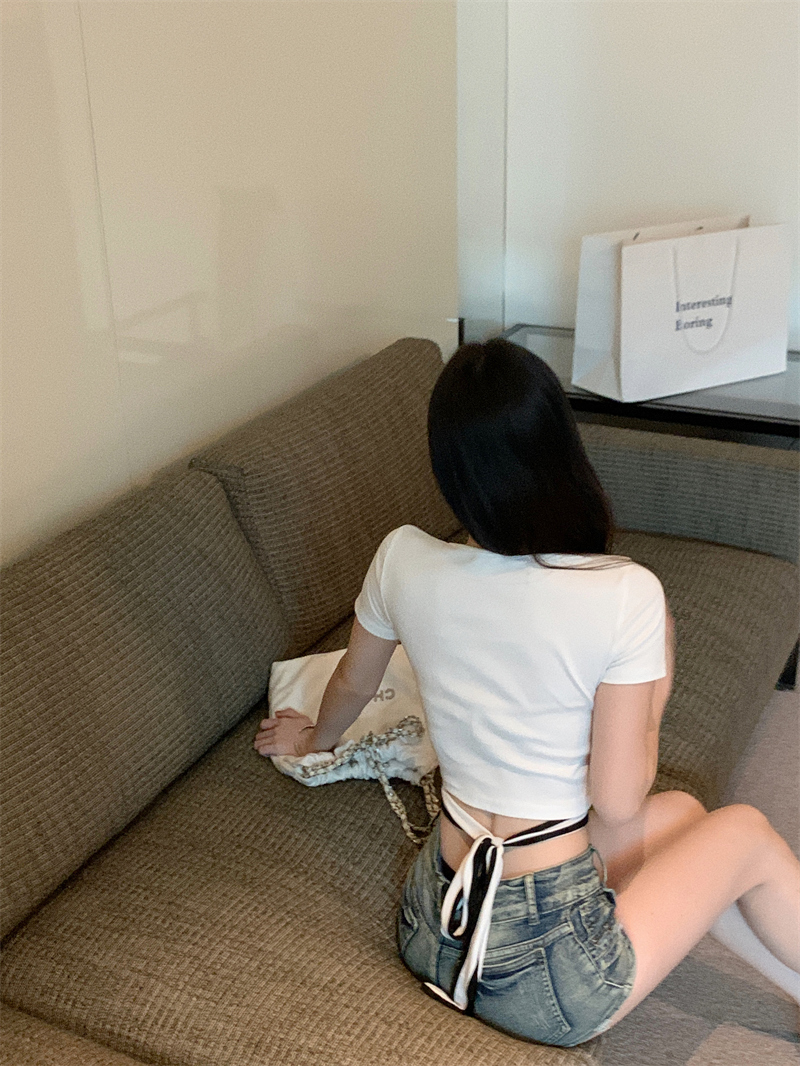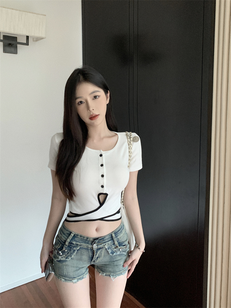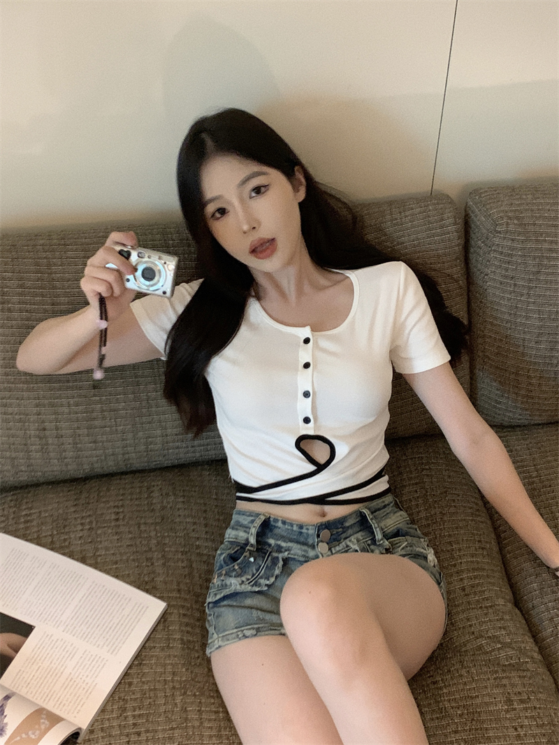 PF1048#小众设计感辣妹撞色交叉绑带t恤女韩版扭结镂空短款上衣