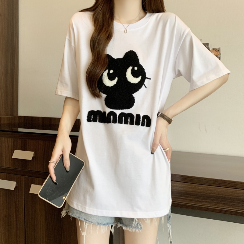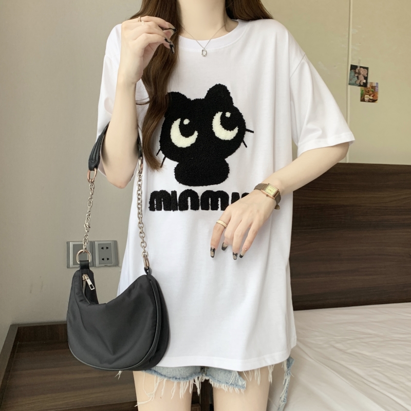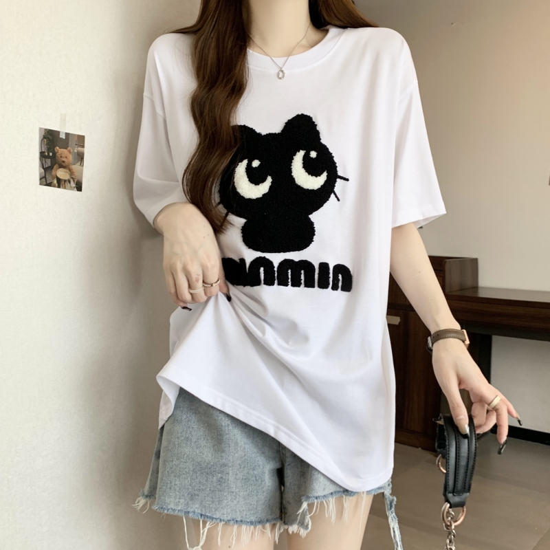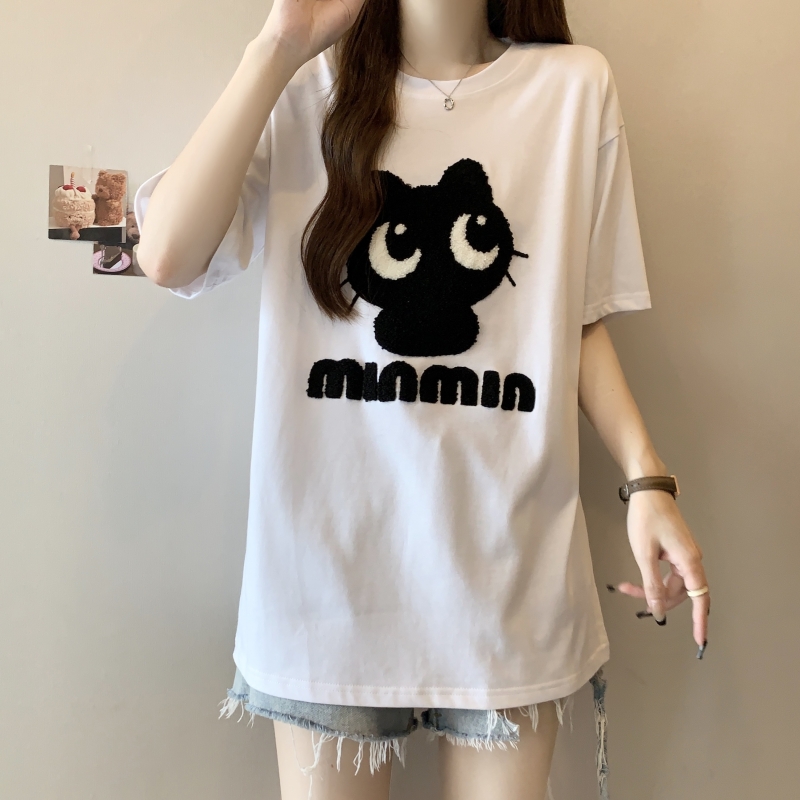 PF1093#夏装毛巾绣短袖T恤女宽松绣花卡通