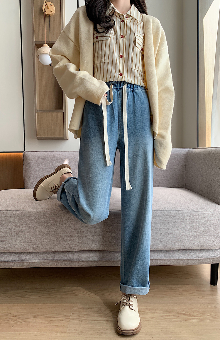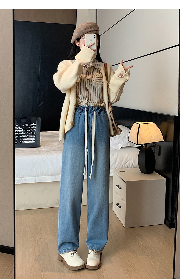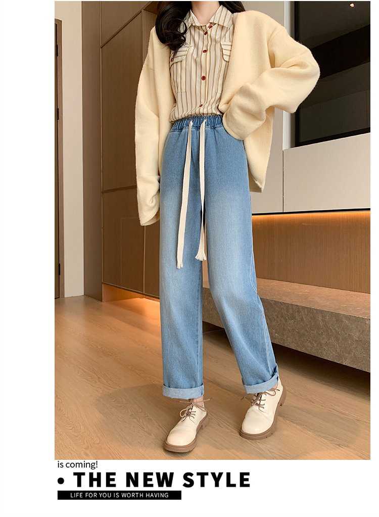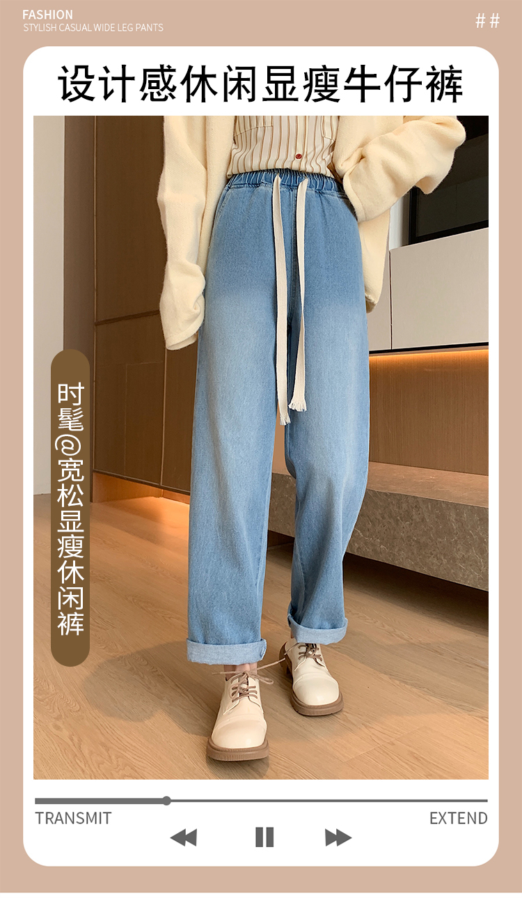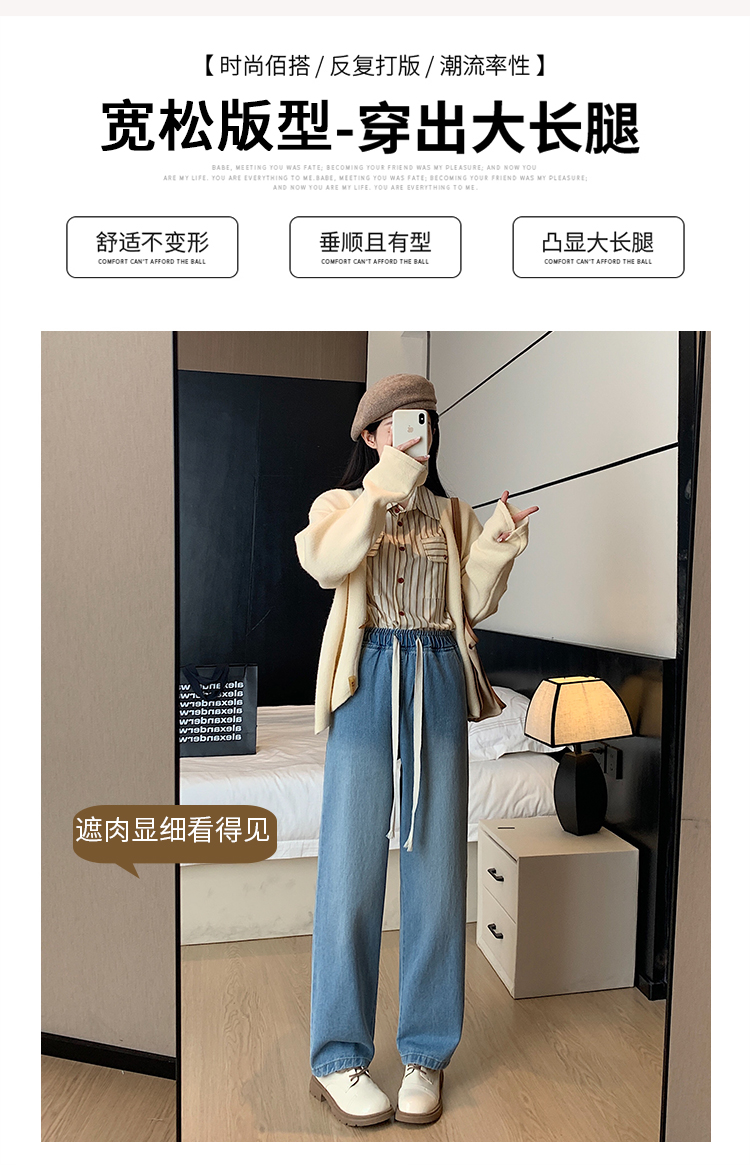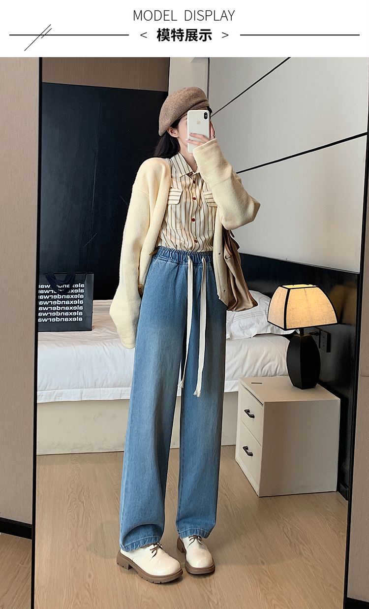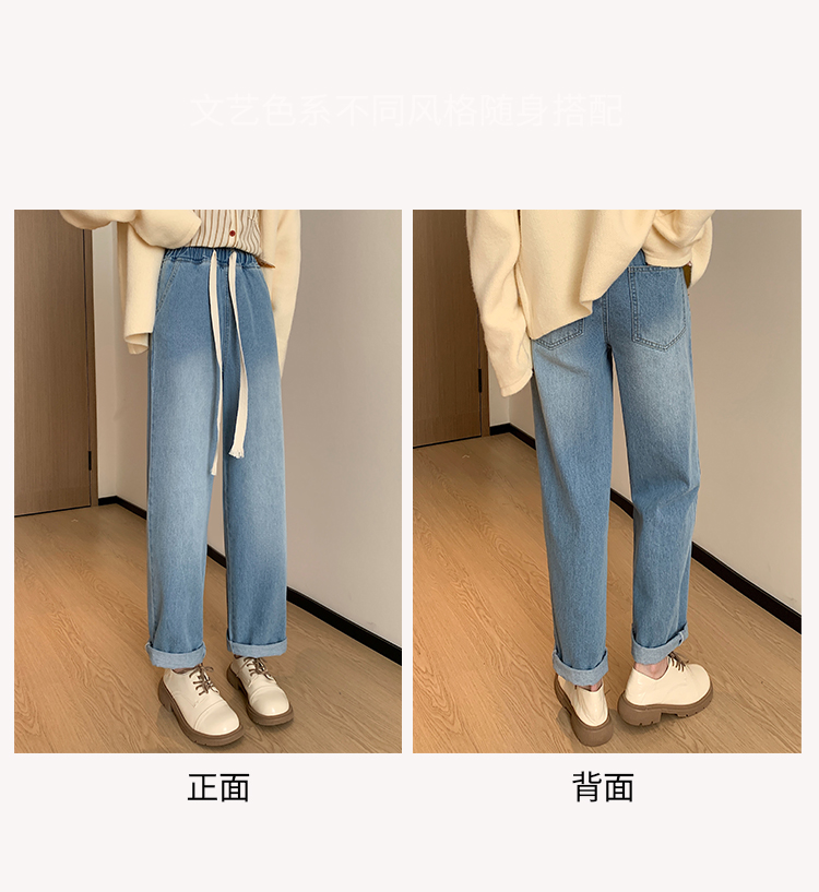 PF1150#牛仔纯棉洗水学院风 复古抽绳宽松拖地怀旧直筒裤女