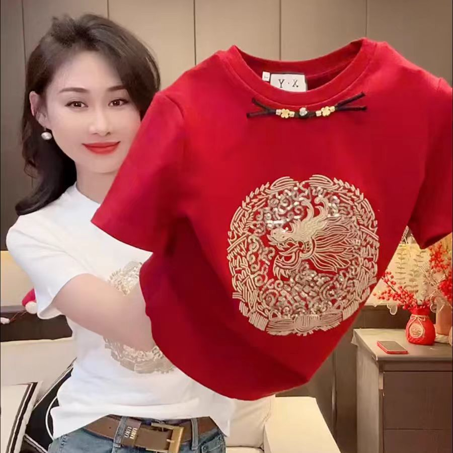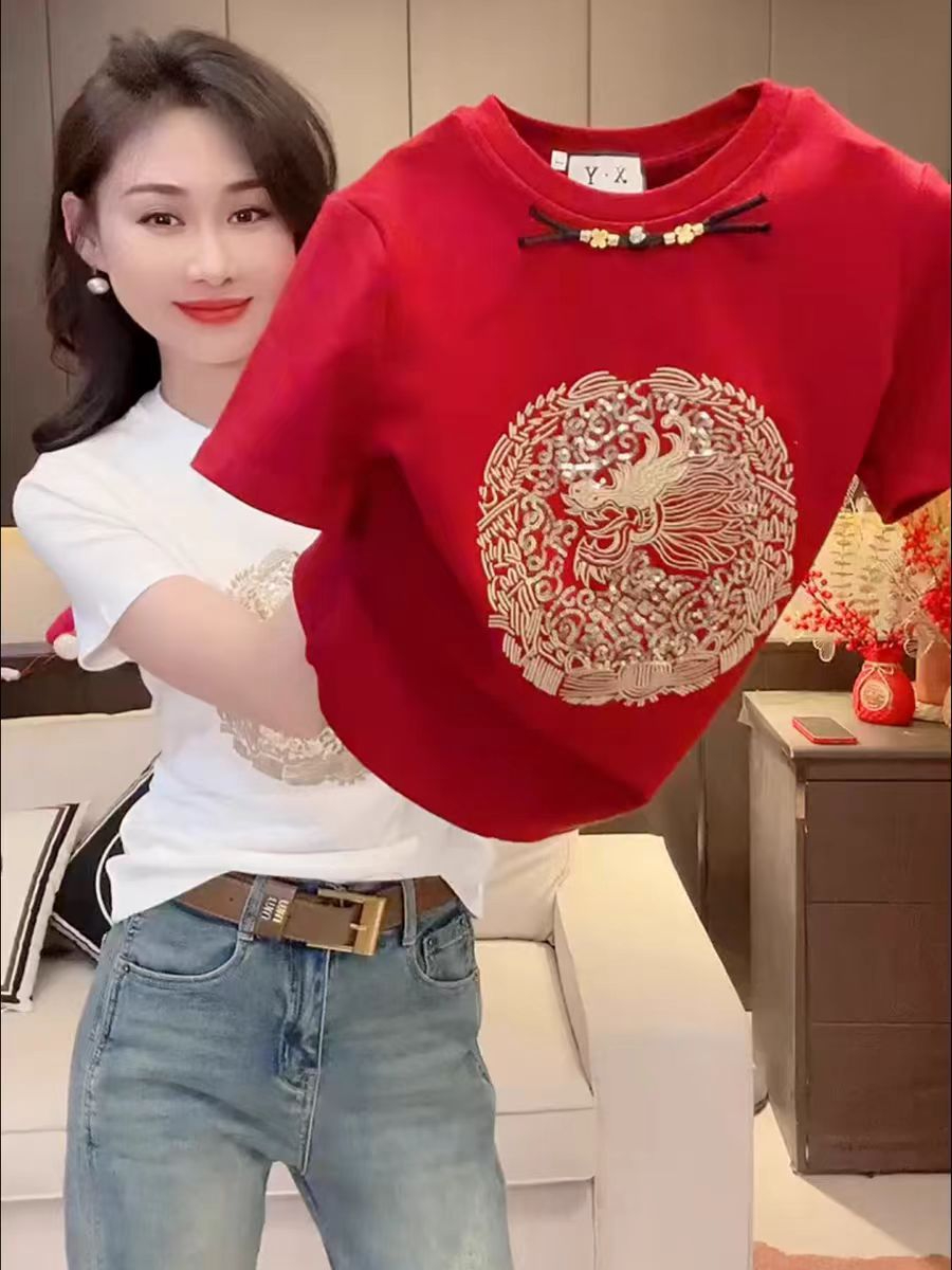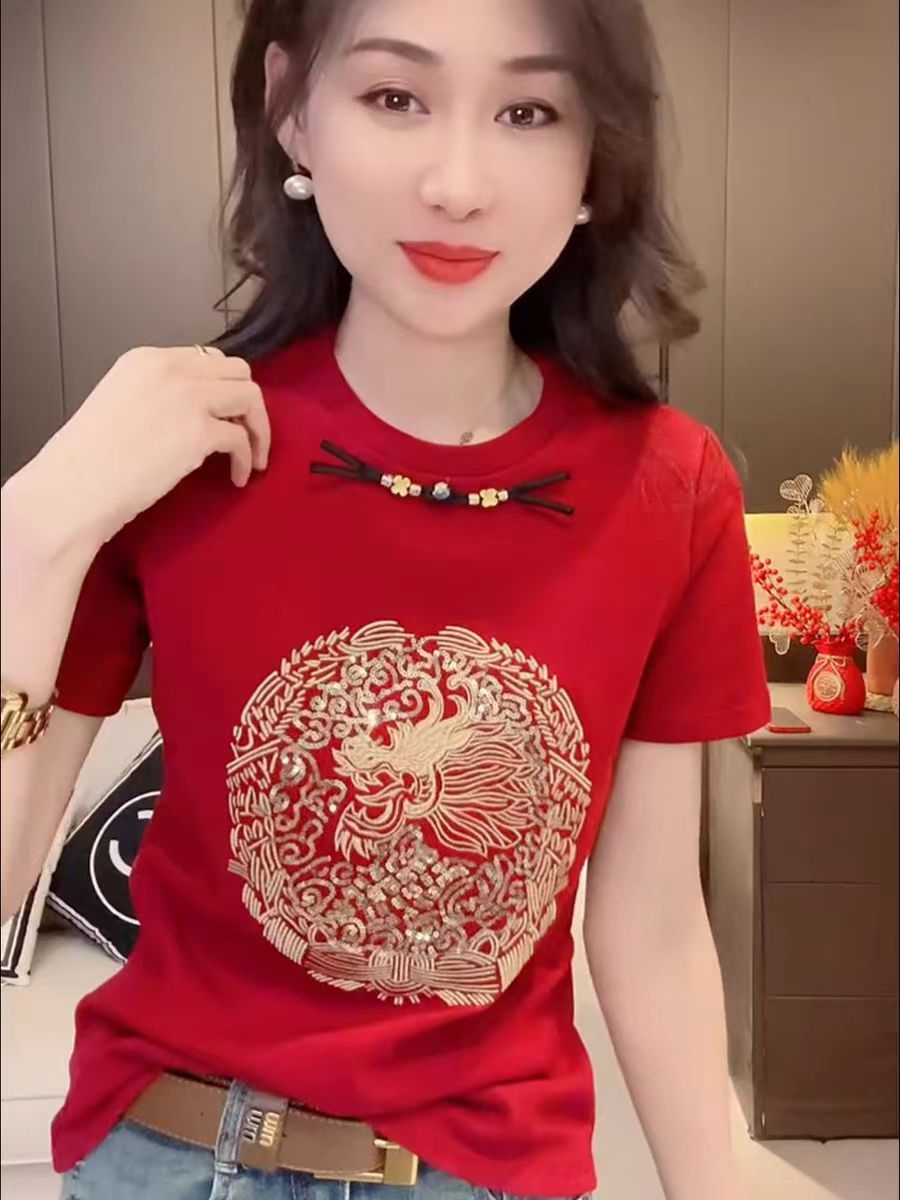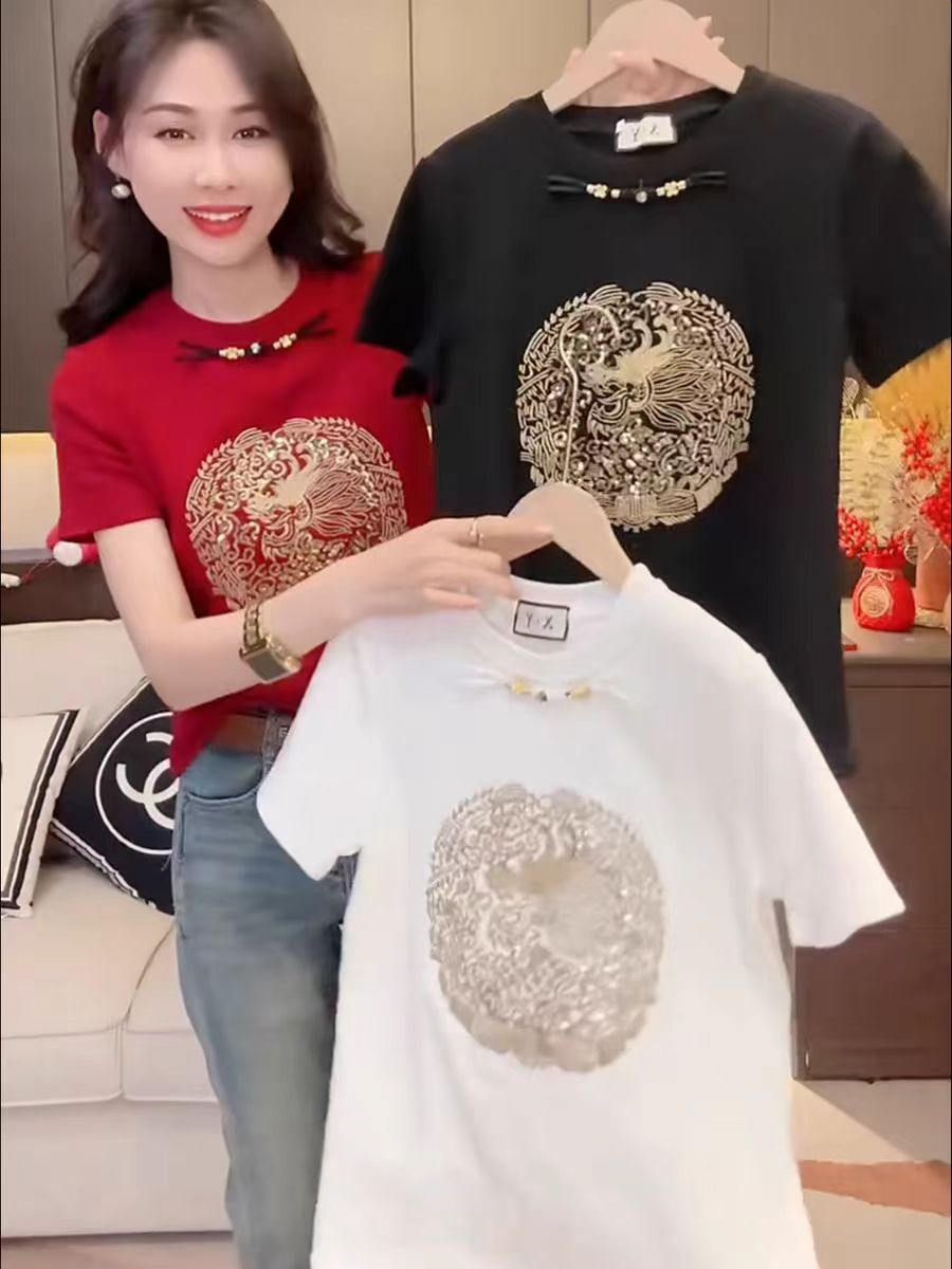PF1169#纯棉新中式国风刺绣短袖T恤女 洋气时尚百搭上衣服