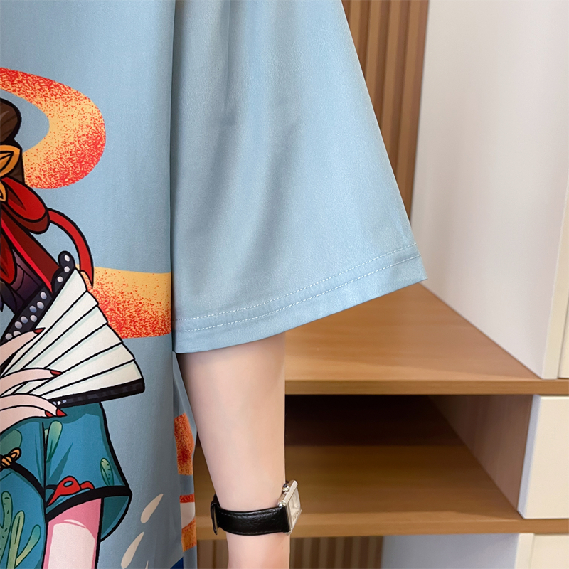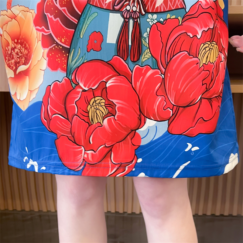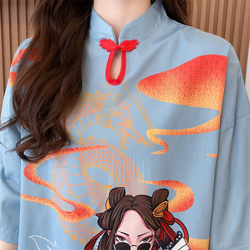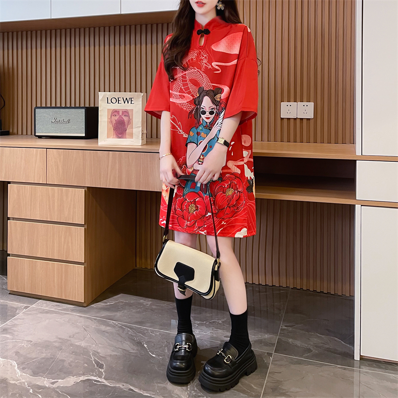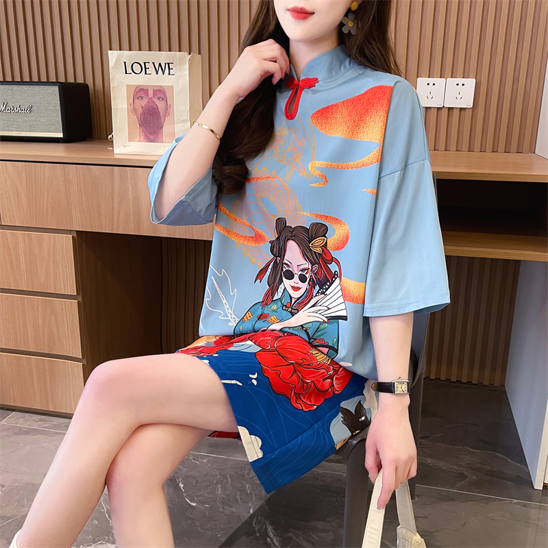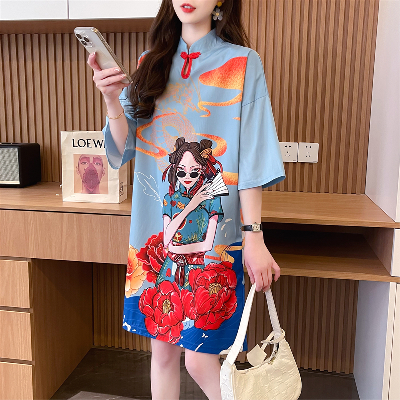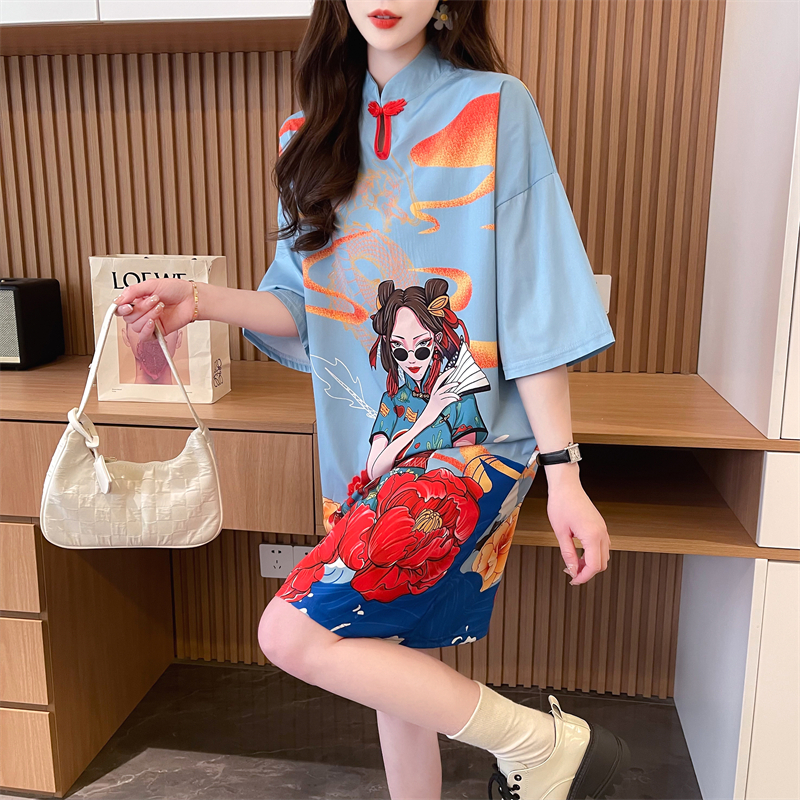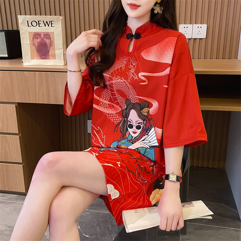 PF1296#涤纶100%国潮风改良旗袍小众设计感中长款短袖t恤女