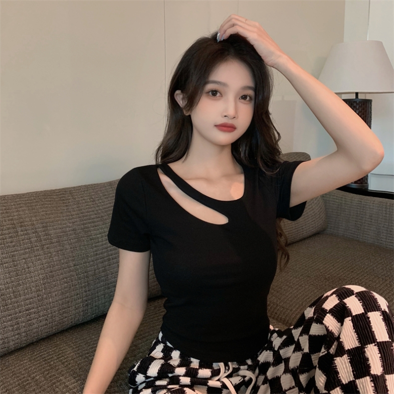PF1305#夏季大码胖MM设计感镂空性感短袖T恤修身显瘦短款上衣M-4XL200斤