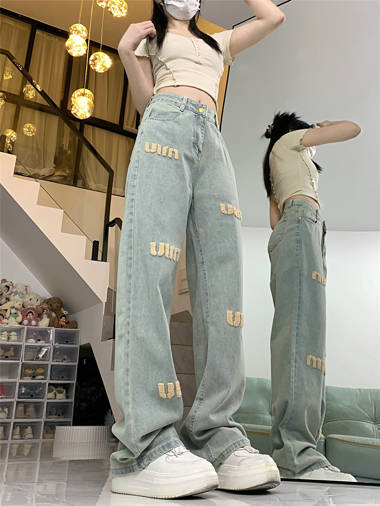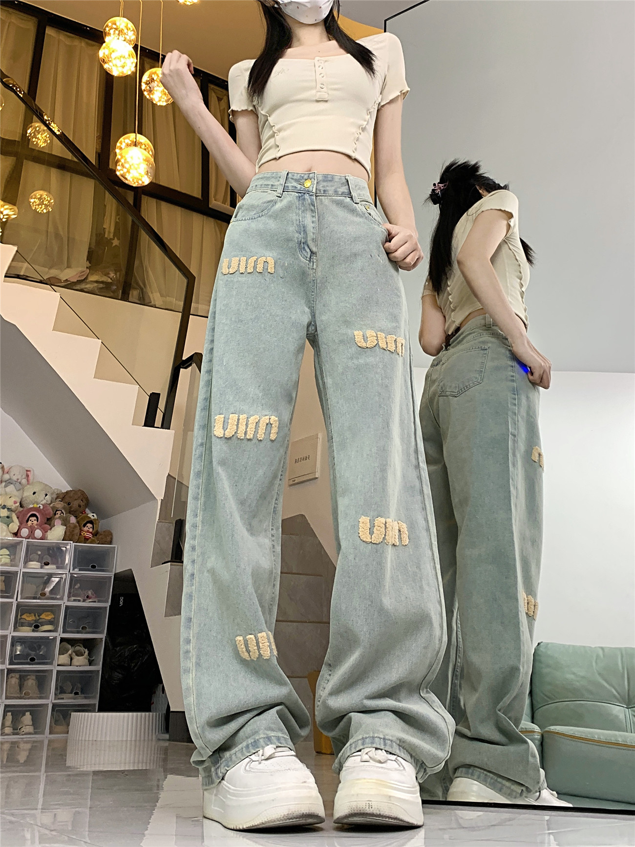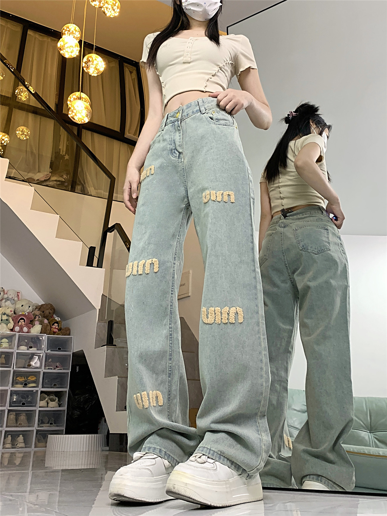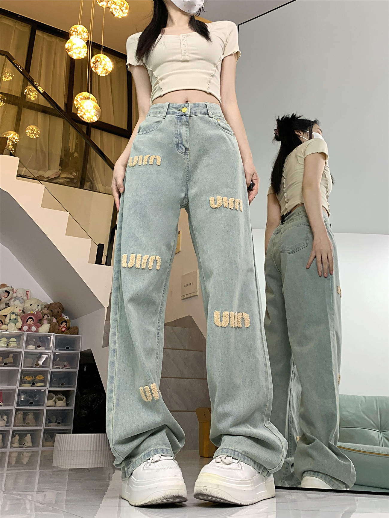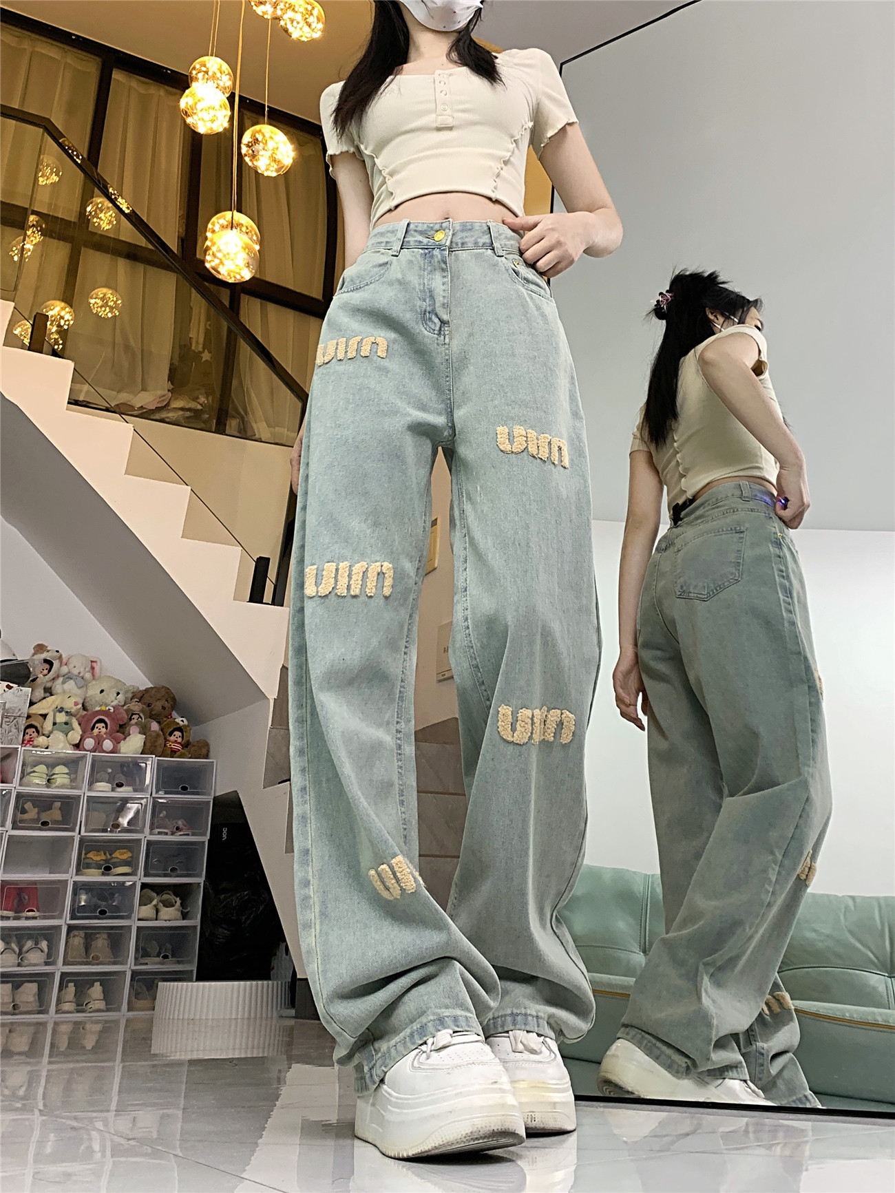 PF1321#字母刺绣直筒牛仔裤女秋冬新款小个子高腰显瘦休闲长裤子