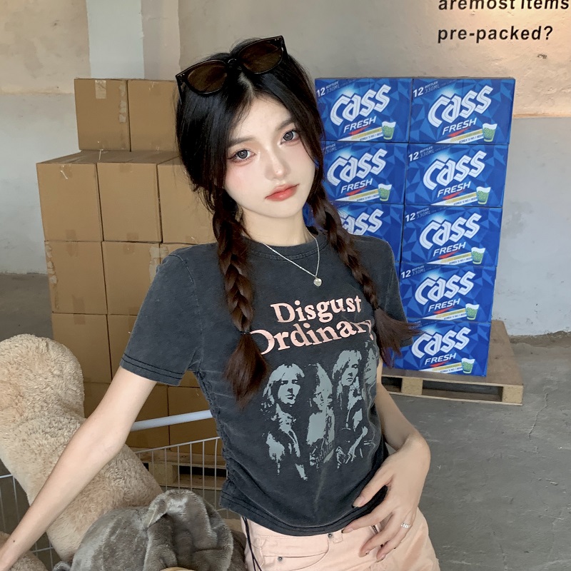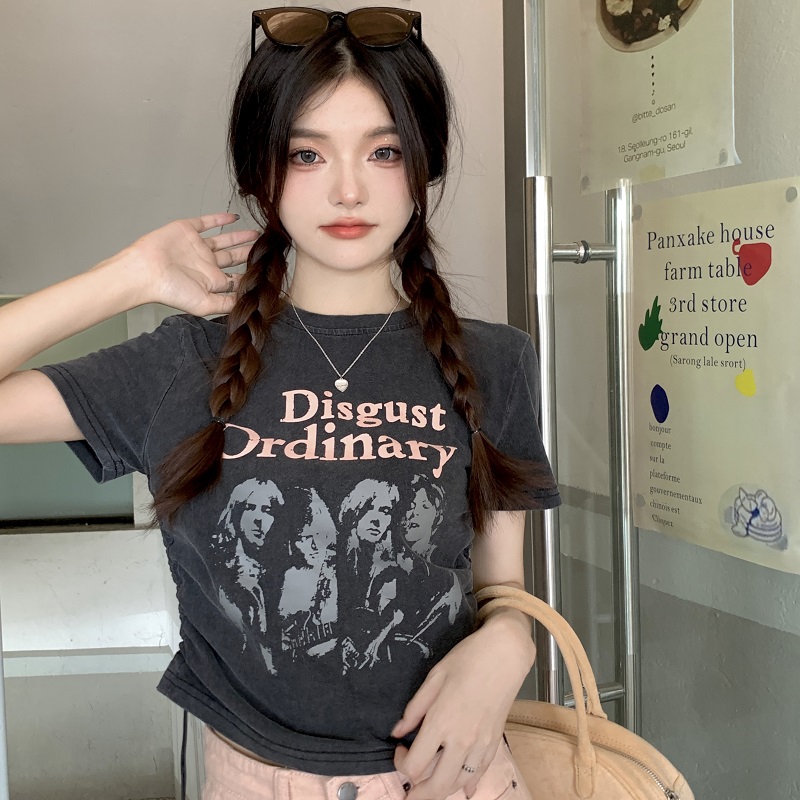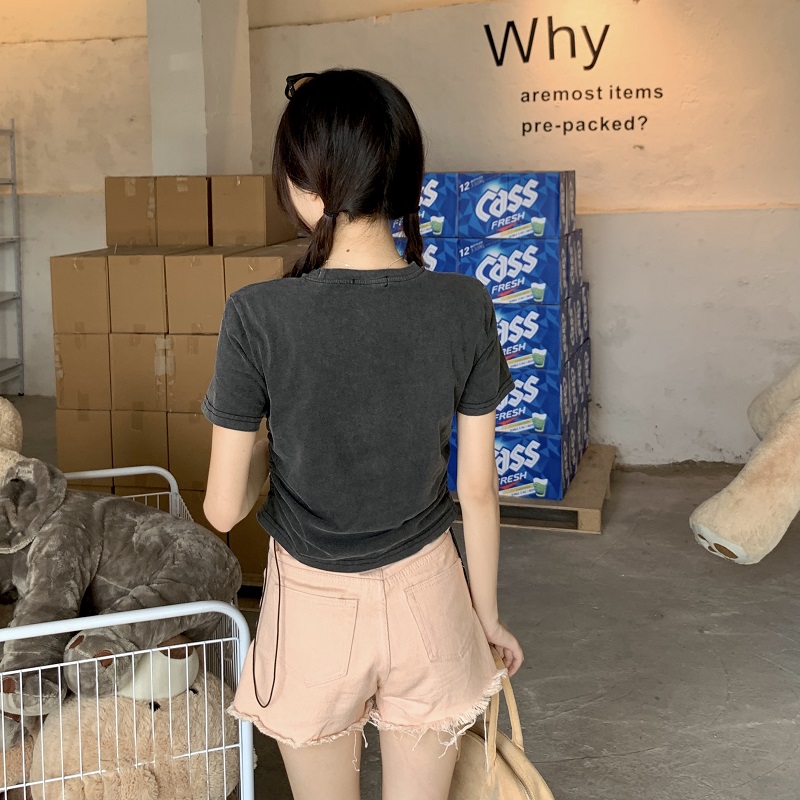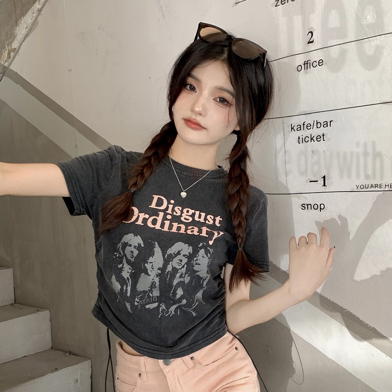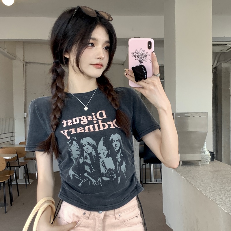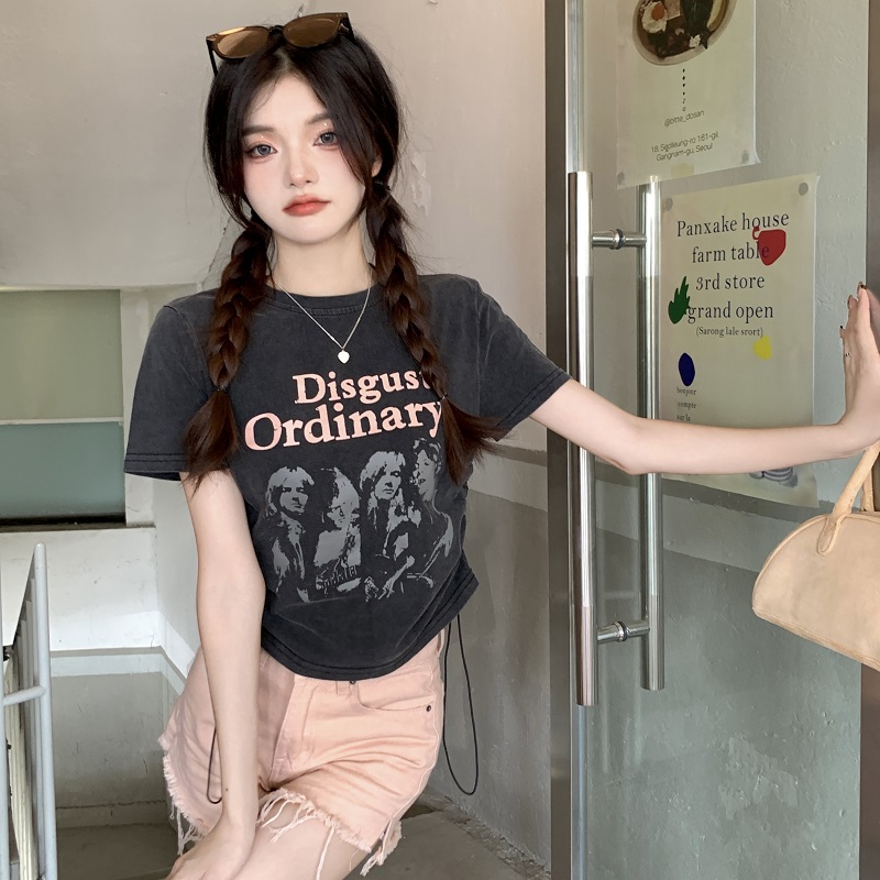 PF1334#大码复古做旧印花短袖T恤女夏季设计感抽绳短款上衣