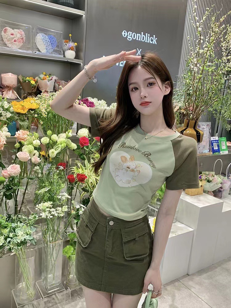 PF1499#冰丝螺纹 粉色甜美可爱兔子夏季修身显瘦短款打底ins上衣T恤韩版