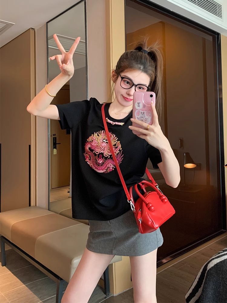 PF1515#黑色新中式国风纯棉短袖t恤女夏季小众复古小个子宽松正肩上衣ins