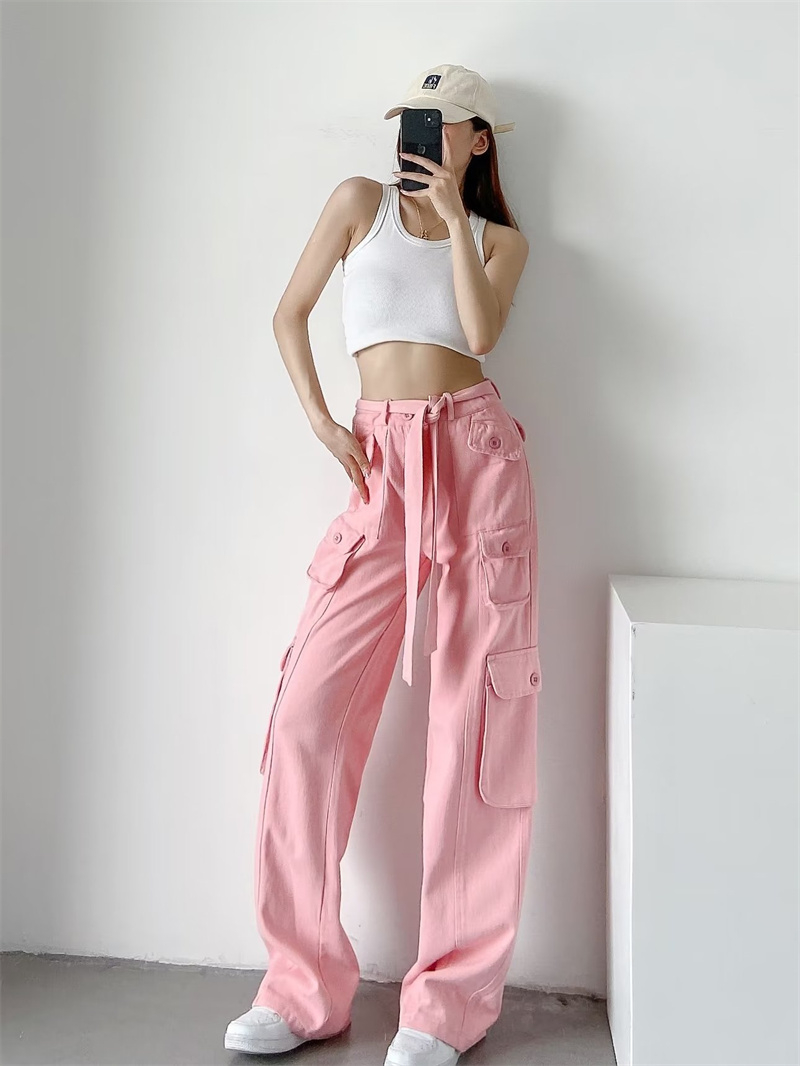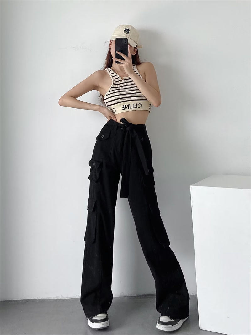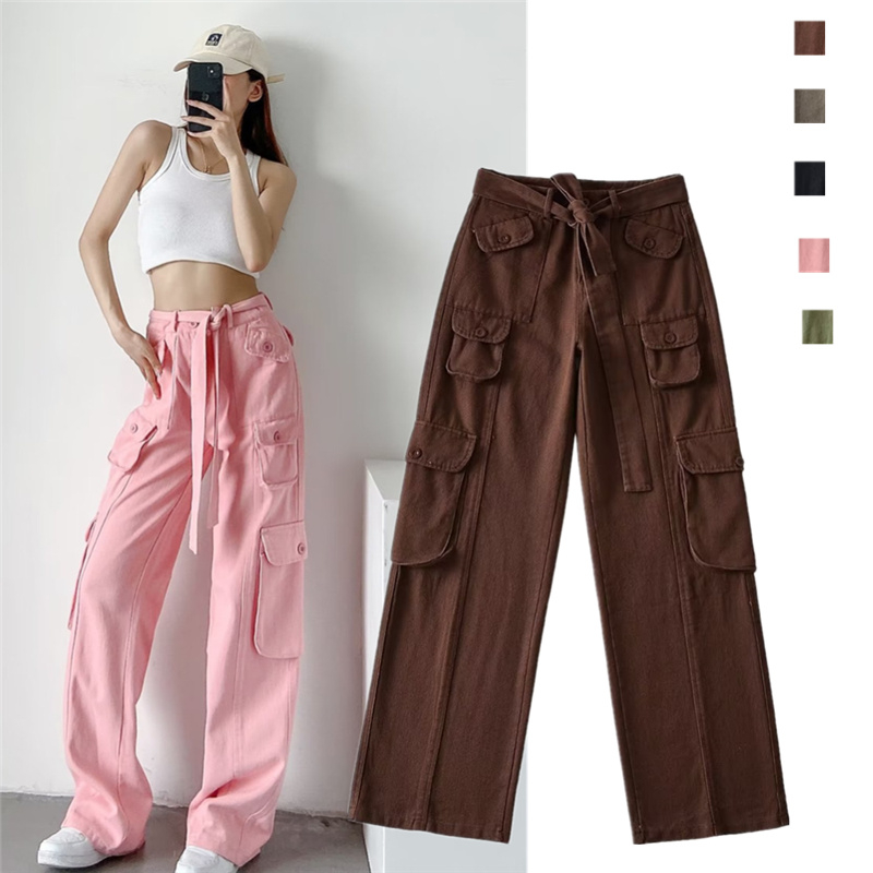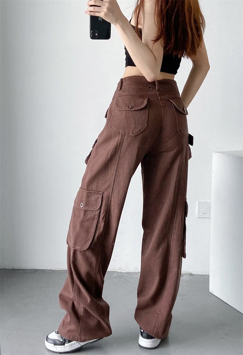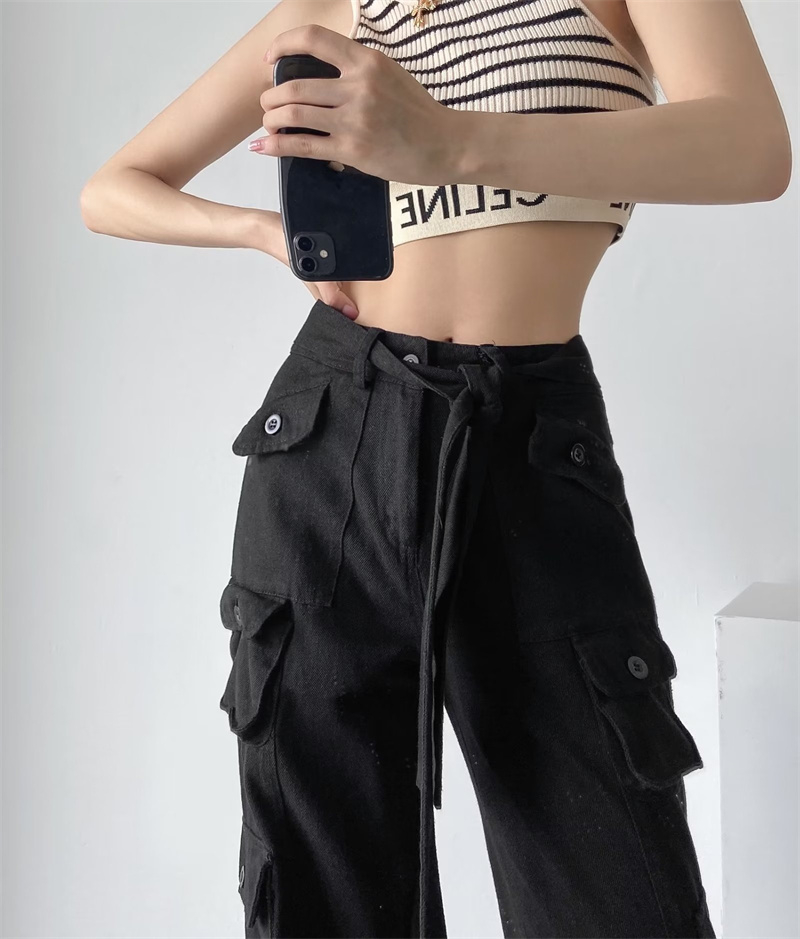 PF1519#美式复古多口袋工装裤高腰高街设计感宽松显瘦阔腿拖地裤送腰带女