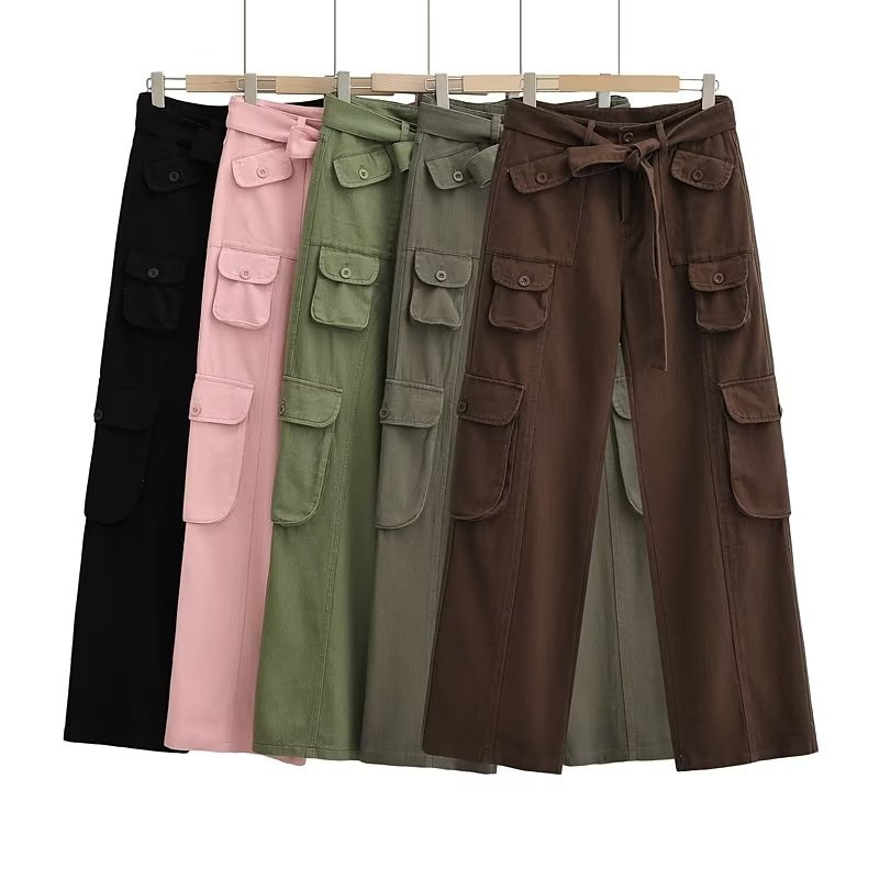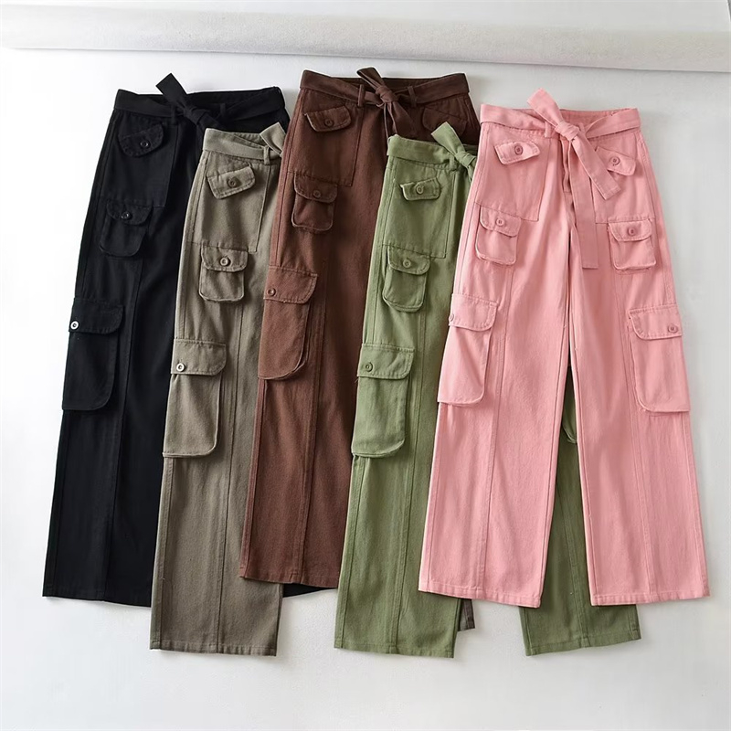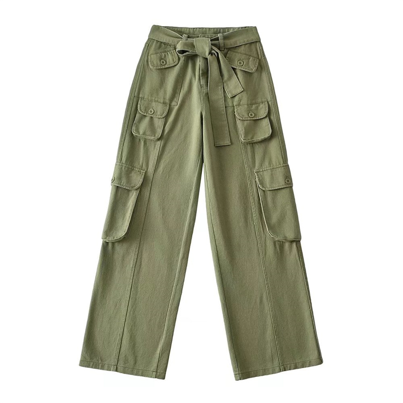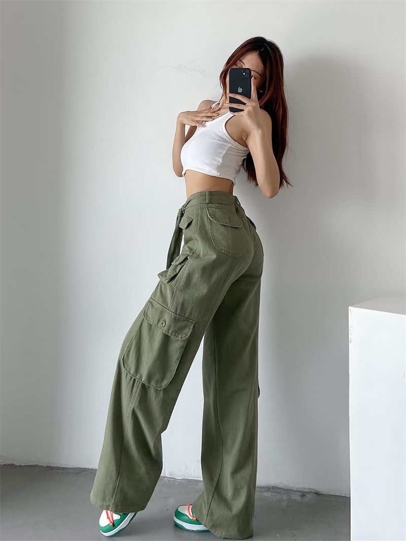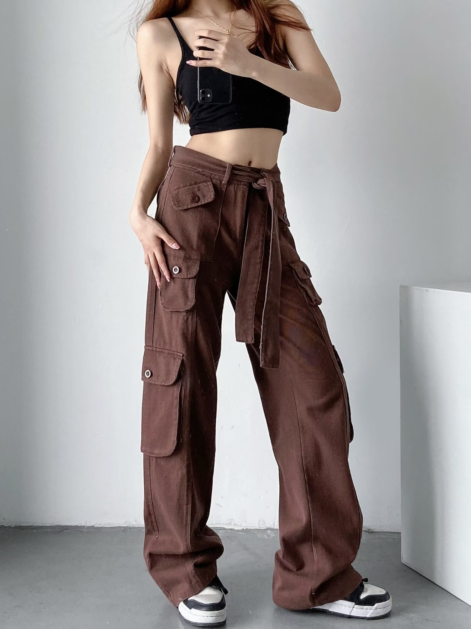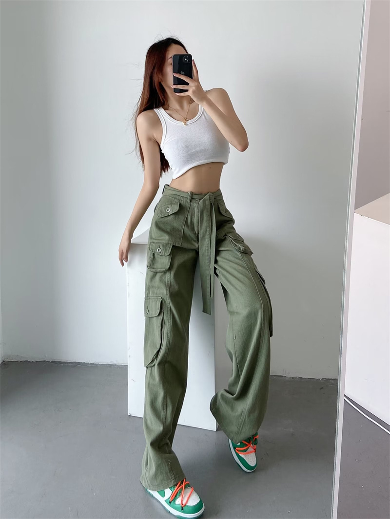 PF1519#美式复古多口袋工装裤高腰高街设计感宽松显瘦阔腿拖地裤送腰带女