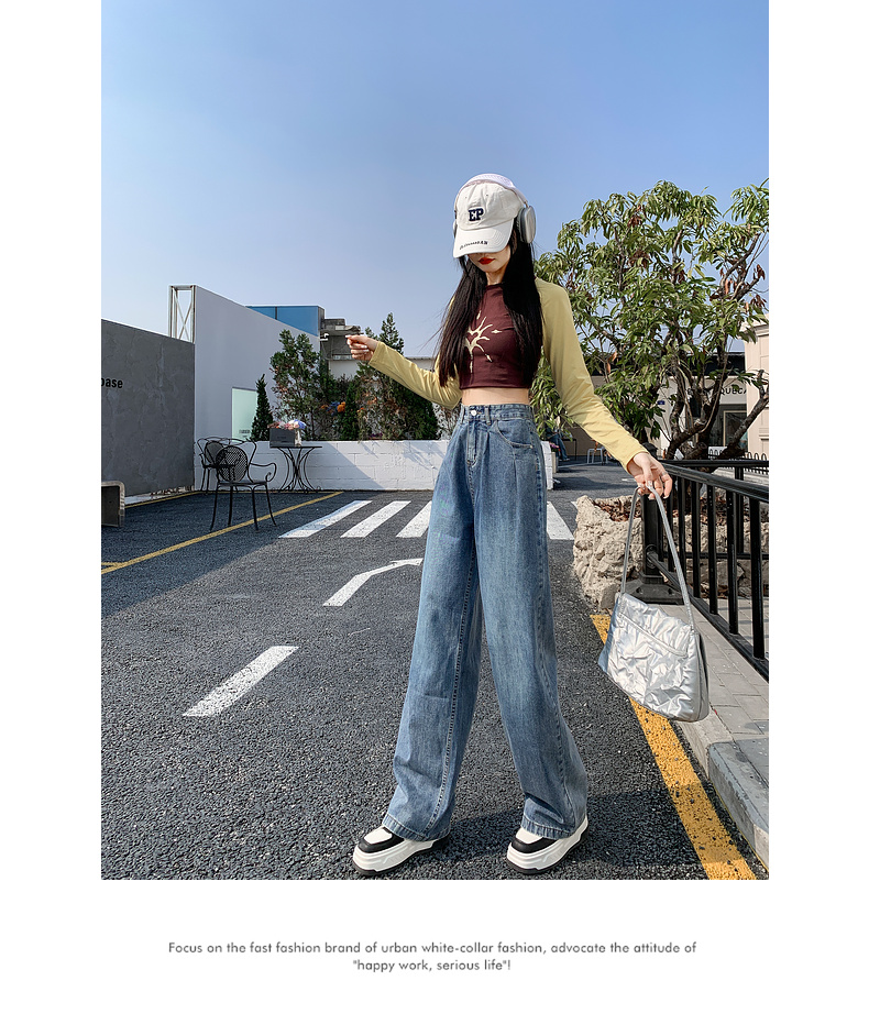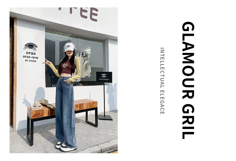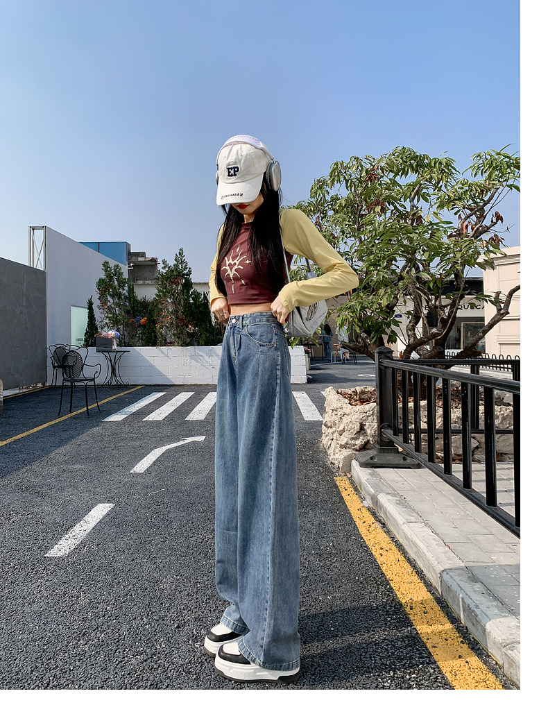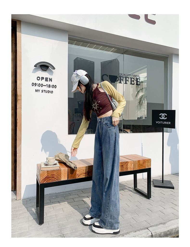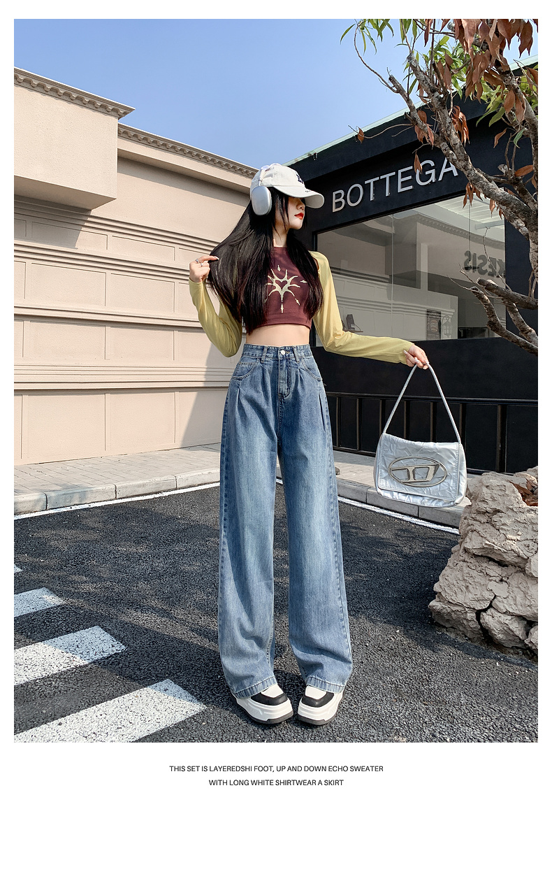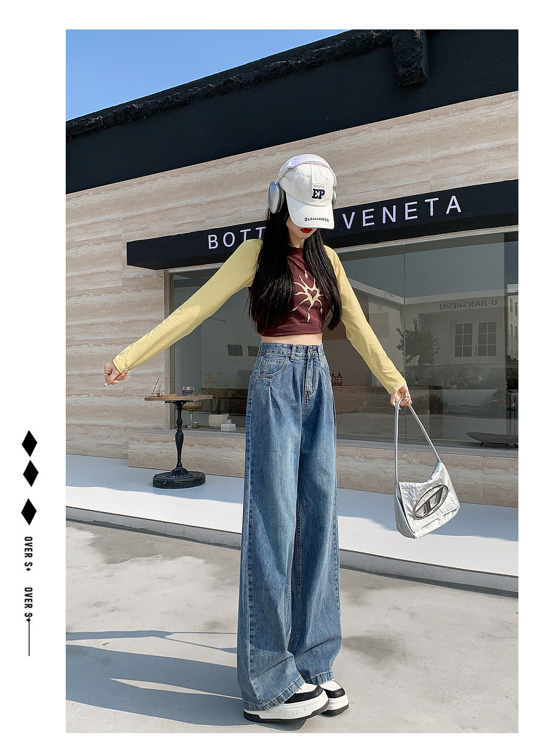 PF1523#爆款超柔纱垂感复古褶皱设计感高腰宽松阔腿牛仔九分长裤加长