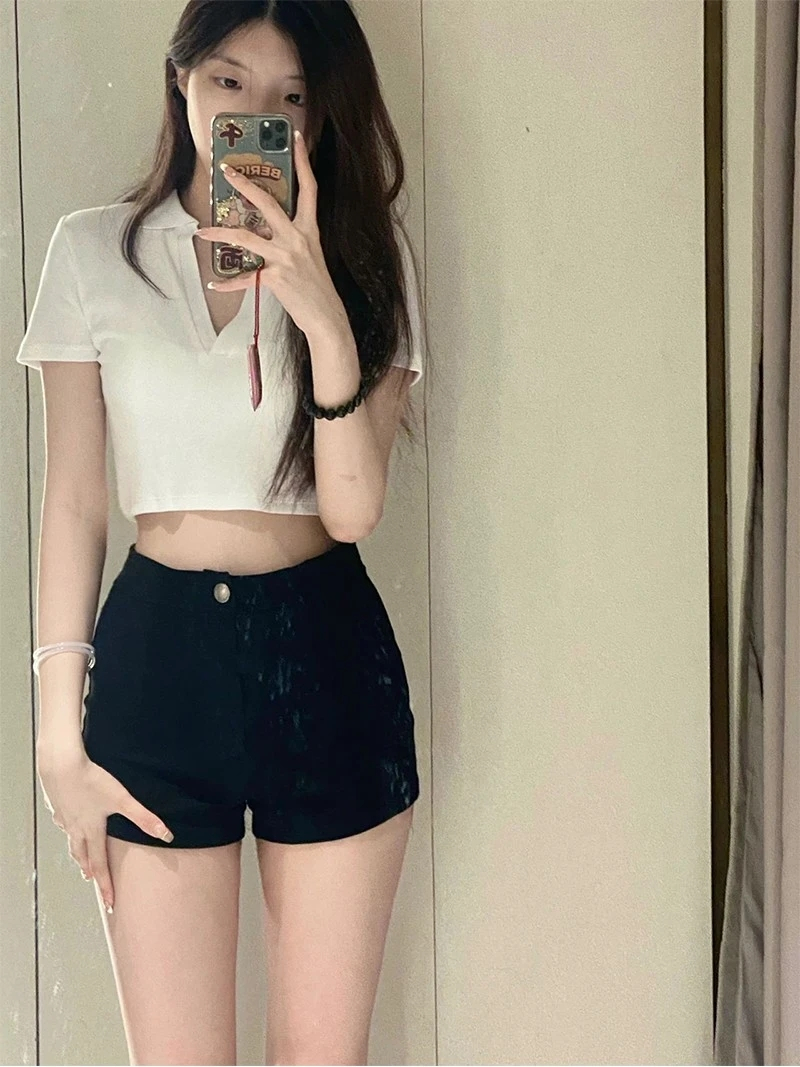 PF1549#黑色高腰牛仔短裤女 春夏新款洋气百搭辣妹显瘦紧身a字热裤子