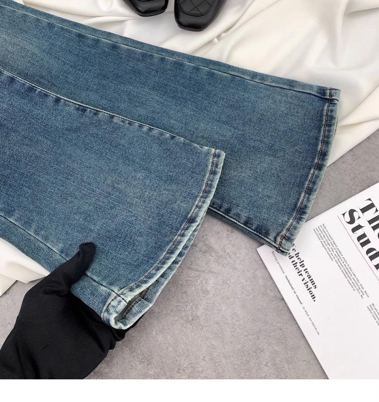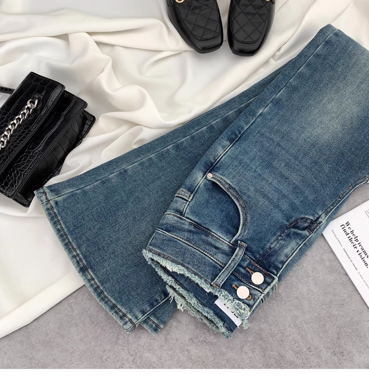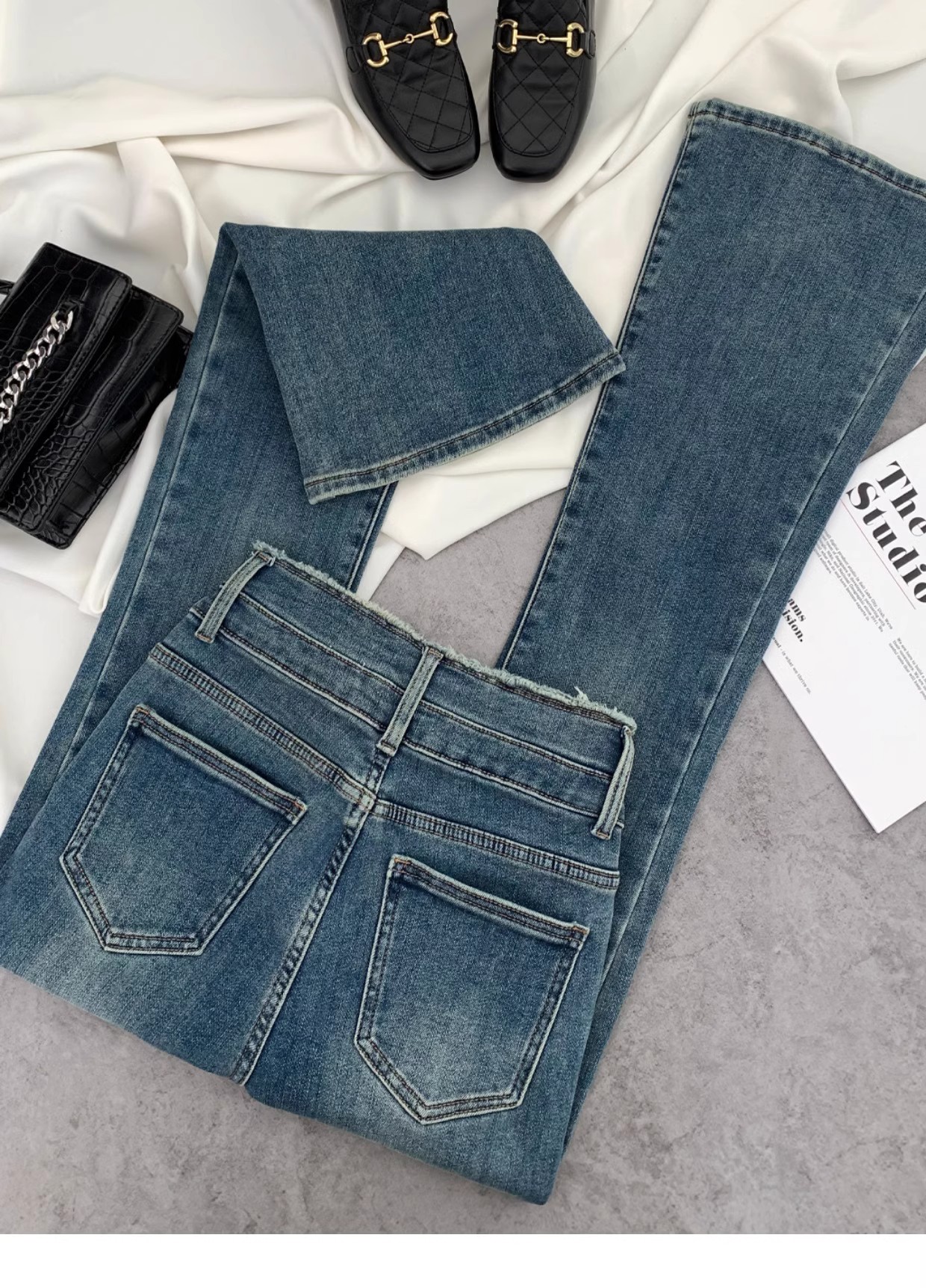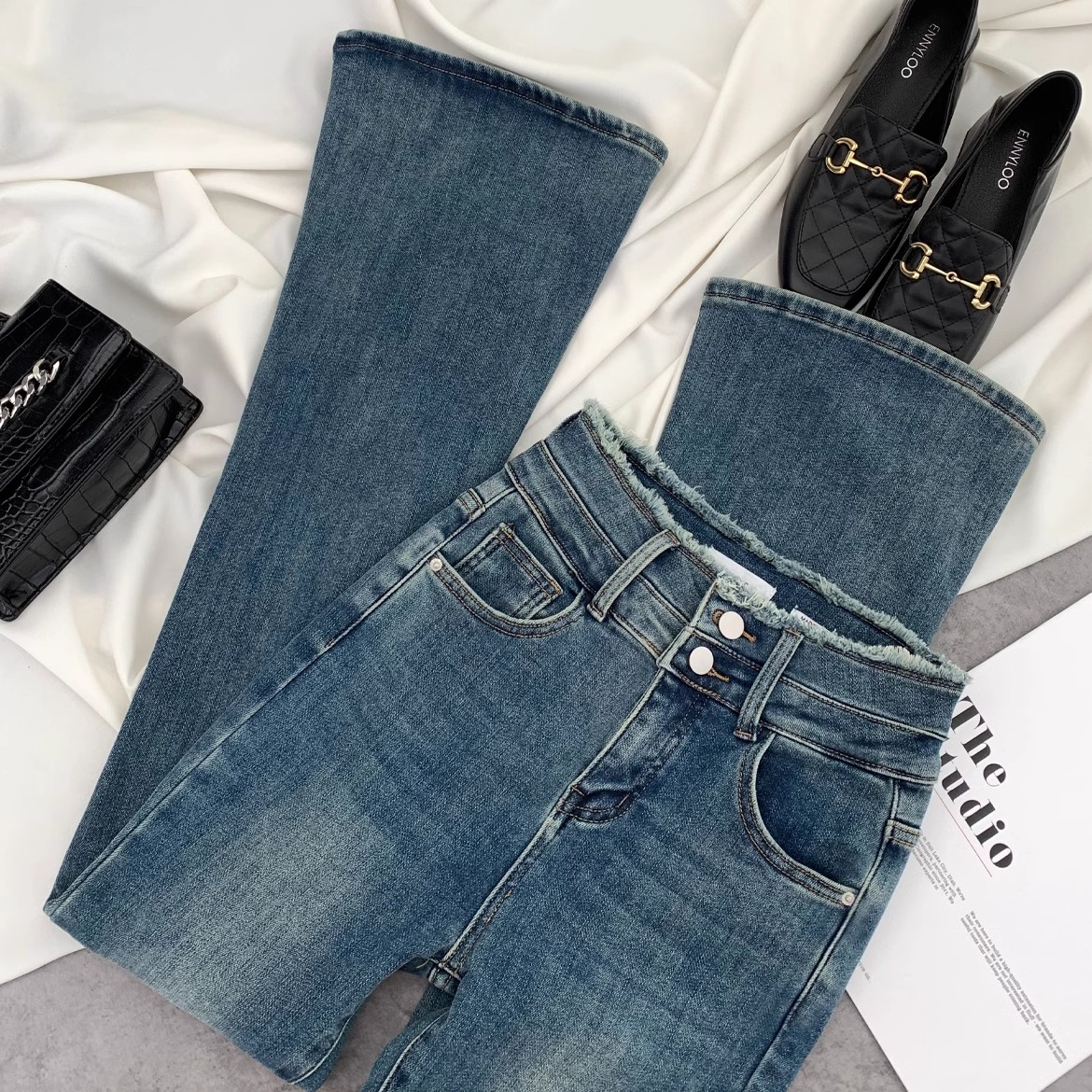 PF1574#复古牛仔裤显瘦微喇裤高腰毛边拖地长裤